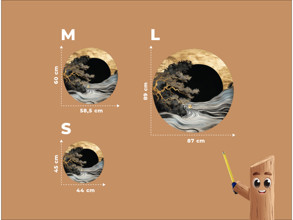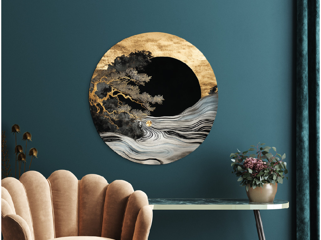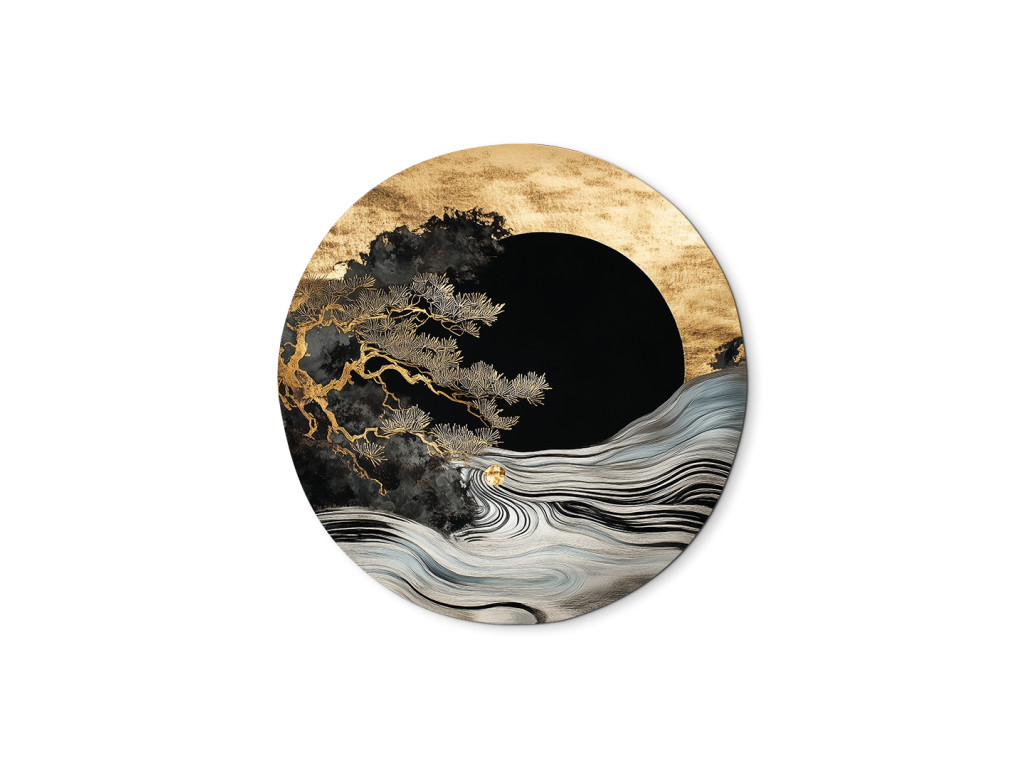 Die runde Wanddekoration „Baum des Lebens“ zeigt eine stilisierte Landschaft mit einer Kiefer, einer ruhigen Wasseroberfläche und einem abstrakten schwarzen Kreis, der an den Mond oder die Sonne erinnert. Die Kombination aus goldenen und dunklen Farbtönen verleiht dem Werk einen eleganten, luxuriösen Charakter.