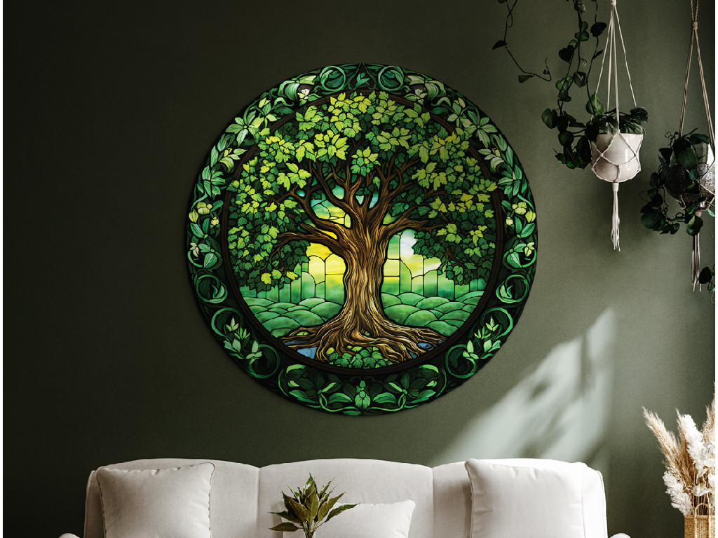 Die runde Wanddekoration zeigt den Baum des Lebens im Stil eines Buntglasfensters mit reich verzierten keltischen Knoten. Dominierend sind die sattgrünen Blätter und Wurzeln, die ein harmonisches kreisförmiges Motiv um den braunen Stamm bilden. Das gesamte Design wirkt wie ein Symbol für Gleichgewicht, Ewigkeit und die Verbindung von Natur und Geist.