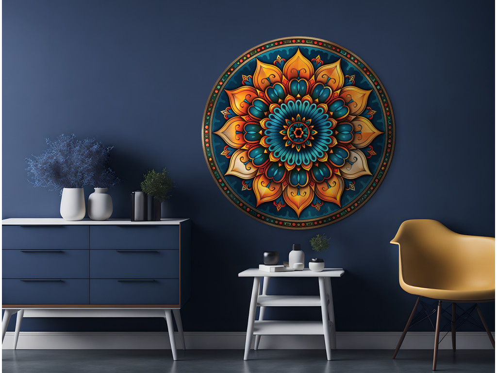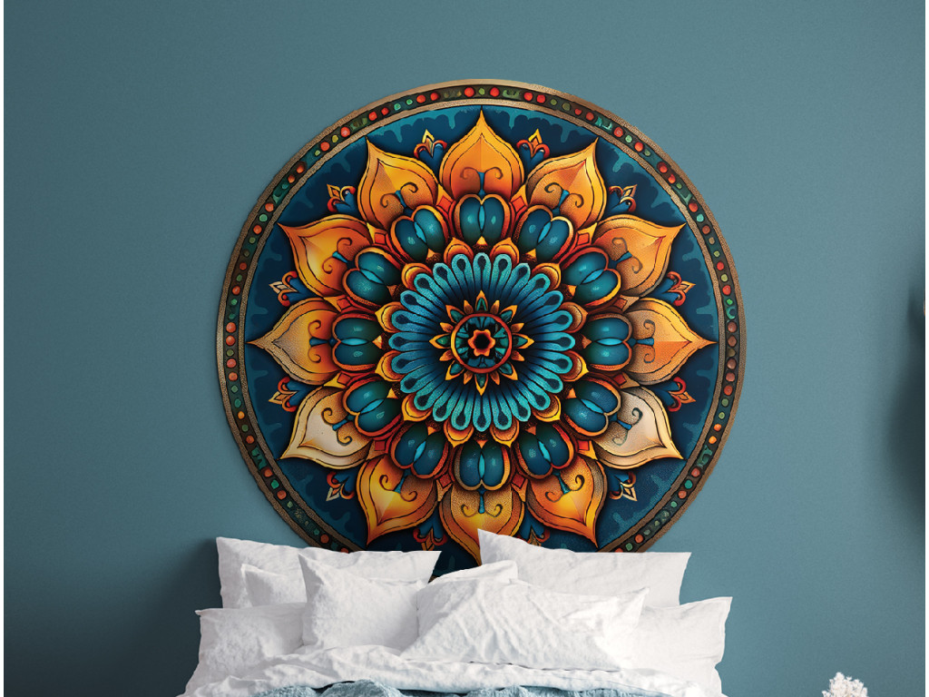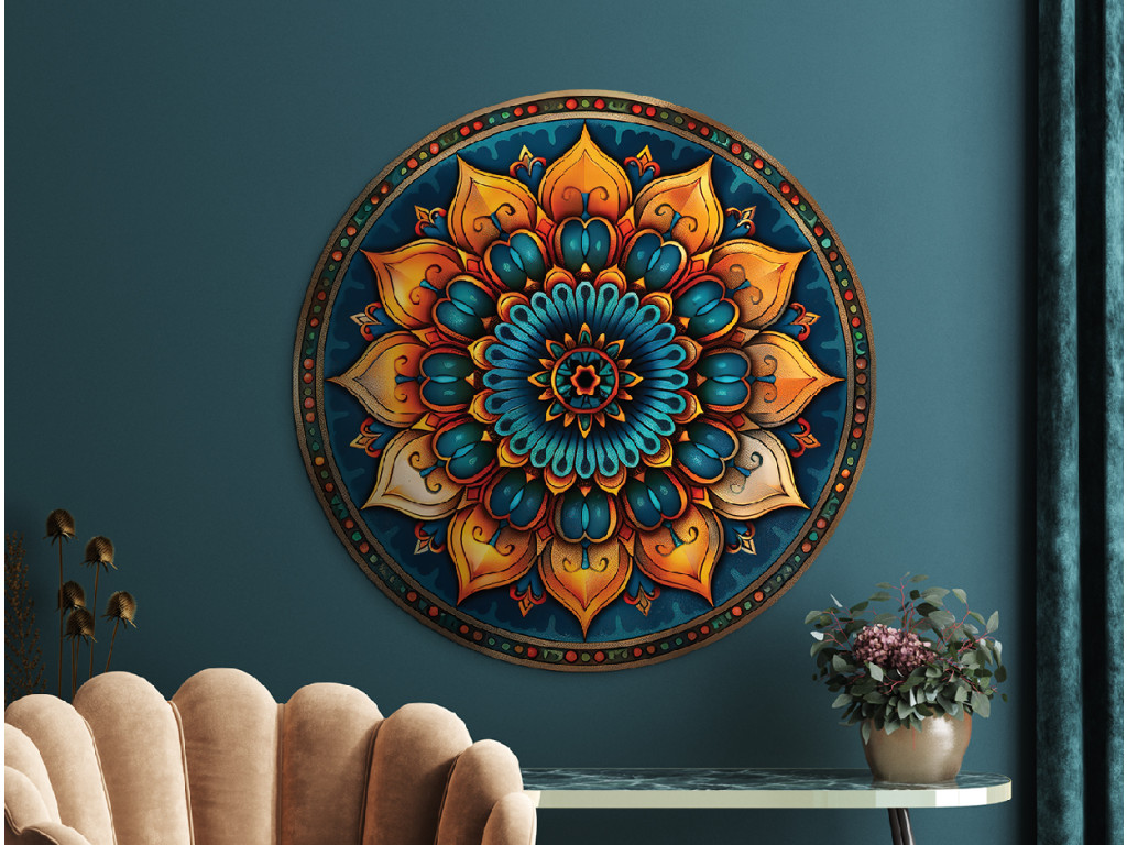 Das Mandala in tiefen, smaragdgrünen Farbtönen vermittelt mystische Ruhe und innere Stabilität. Es kommt sowohl in modernen als auch in natürlichen Innenräumen hervorragend zur Geltung.