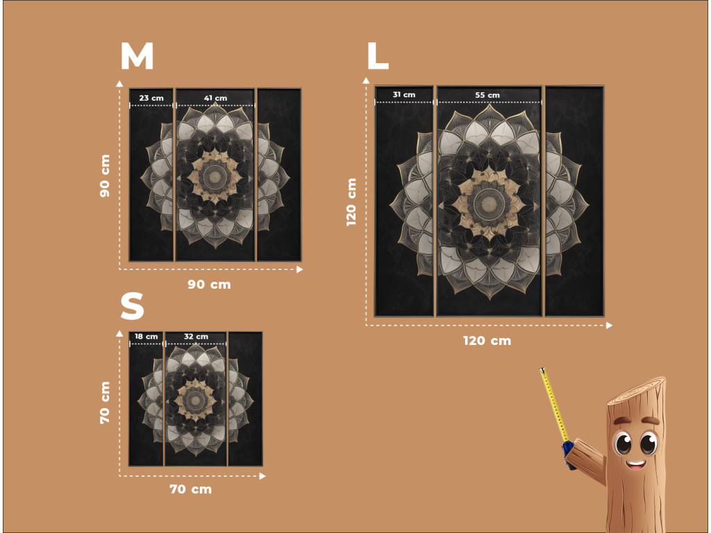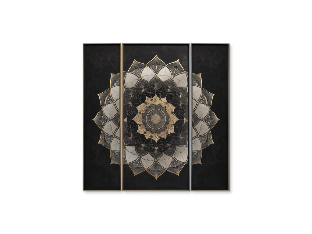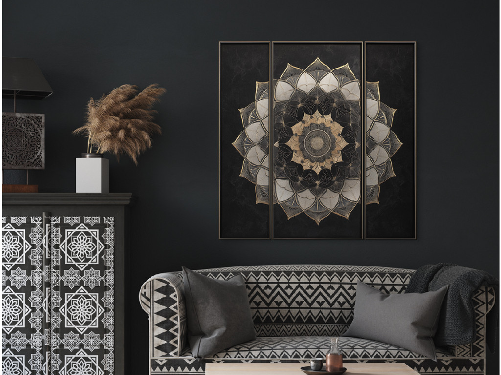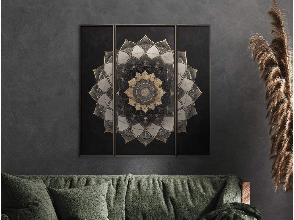 Der dreiteilige Wandpaneel mit Mandala in Schwarz-Weiß-Gold-Ausführung wirkt elegant und ausgewogen. Das konzentrierte ornamentale Muster schafft ein Gefühl von innerer Ausgeglichenheit und visueller Energie. Geeignet als stilvolle Ergänzung zu modernen und bohemischen Inneneinrichtungen.