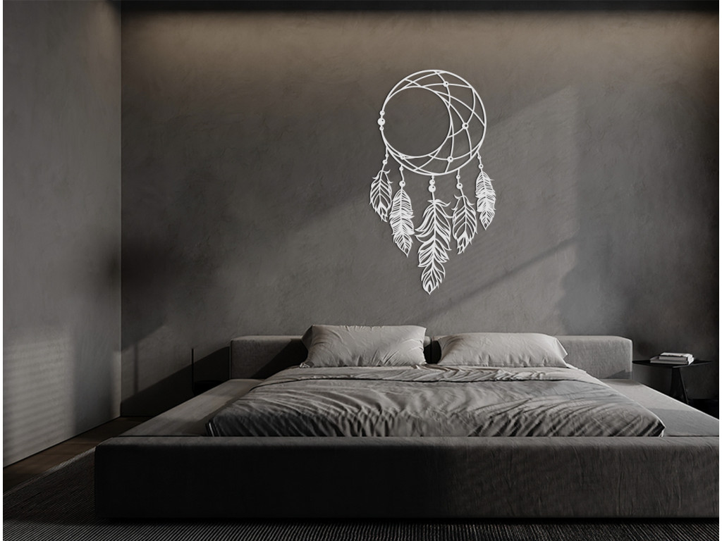 Der dekorative Traumfänger aus Holz bringt eine gemütliche und entspannende Atmosphäre in jeden Raum. Der Kreis zeigt den Mond, an dem Federn angebracht sind. Die Dekoration passt gut ins Schlafzimmer, in den Vorsaal, in den Flur oder auch ins Kinderzimmer.