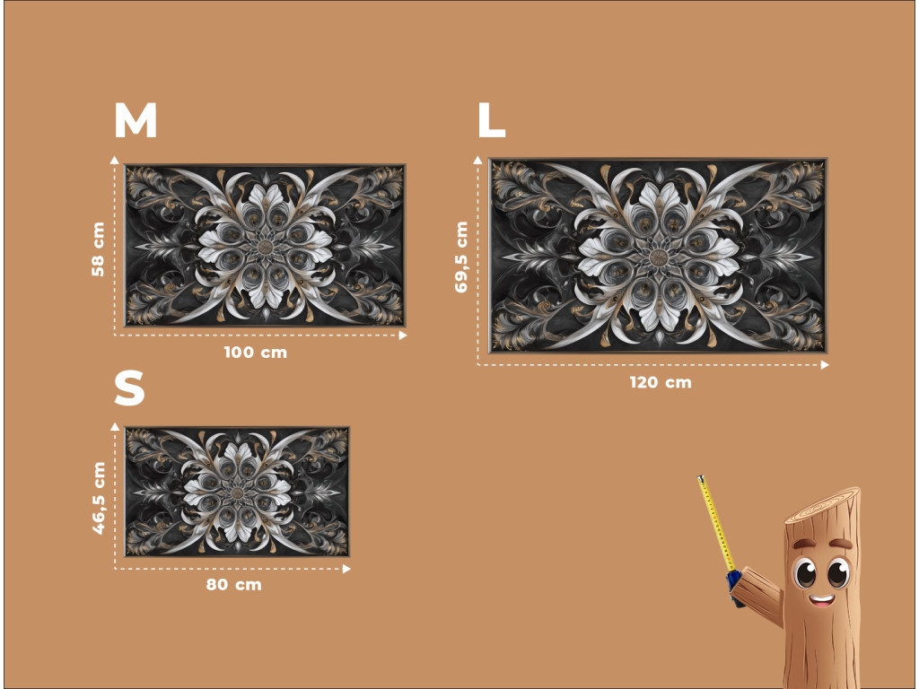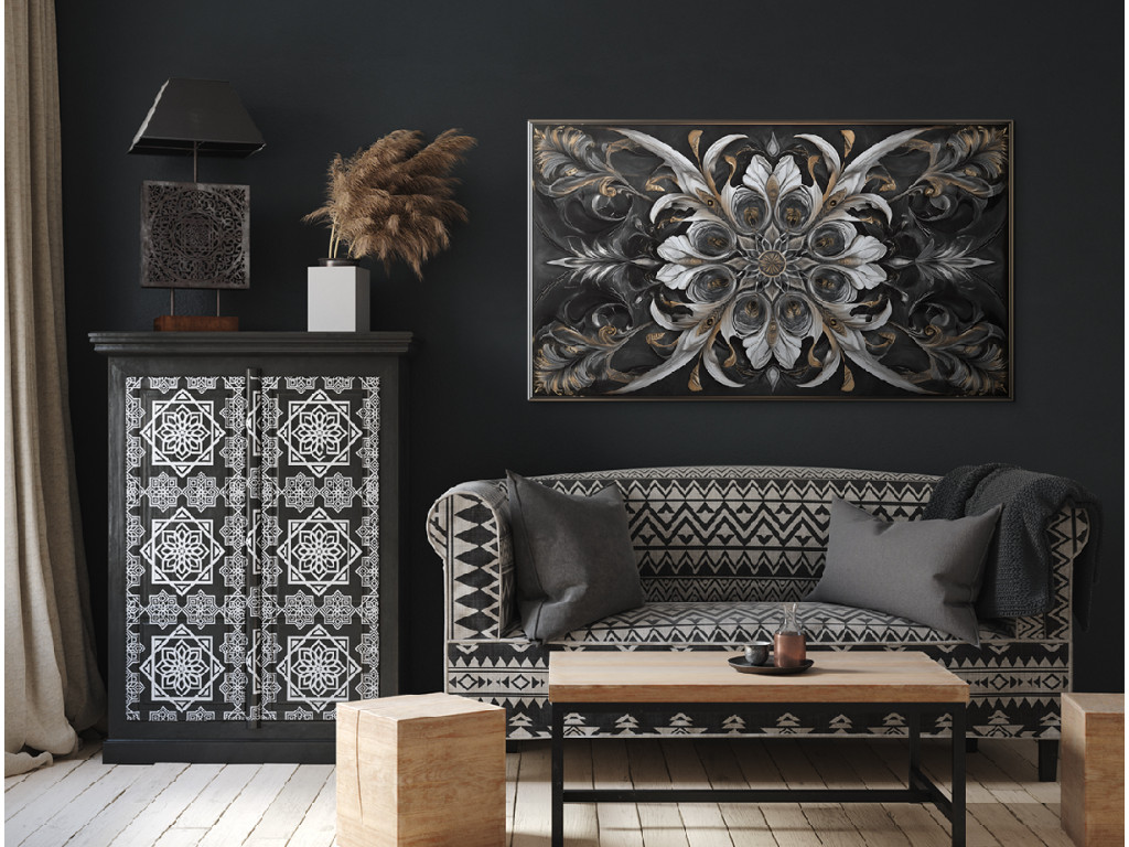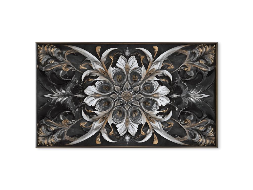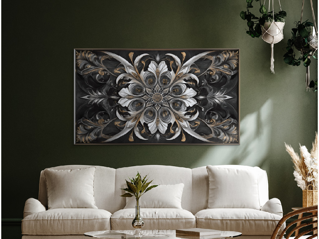 Das detailreich gearbeitete dreidimensionale Mandala mit seinem markanten zentralen Muster sorgt für einen reichhaltigen visuellen Eindruck. Die Kombination aus Silber, Gold und Schwarz verleiht dem Werk einen luxuriösen und eleganten Look, der sowohl zu modernen als auch zu klassischen Einrichtungen passt.
