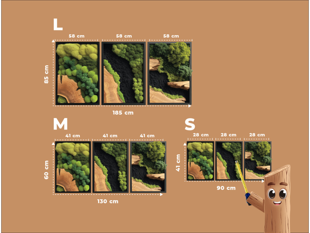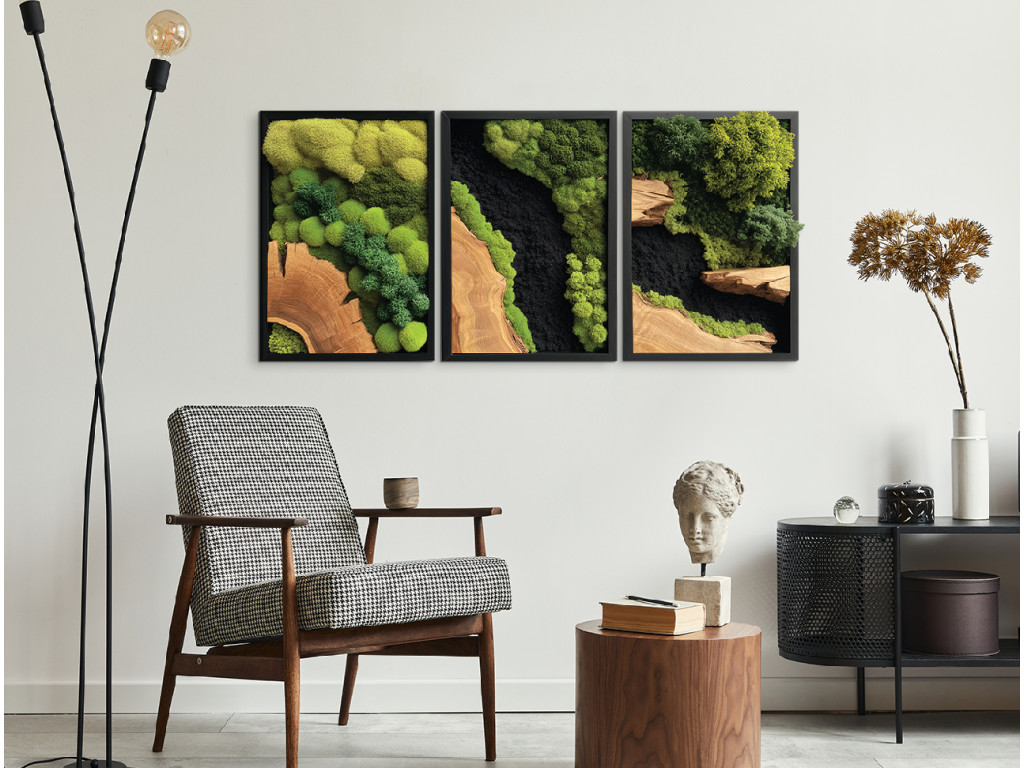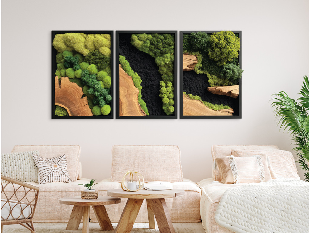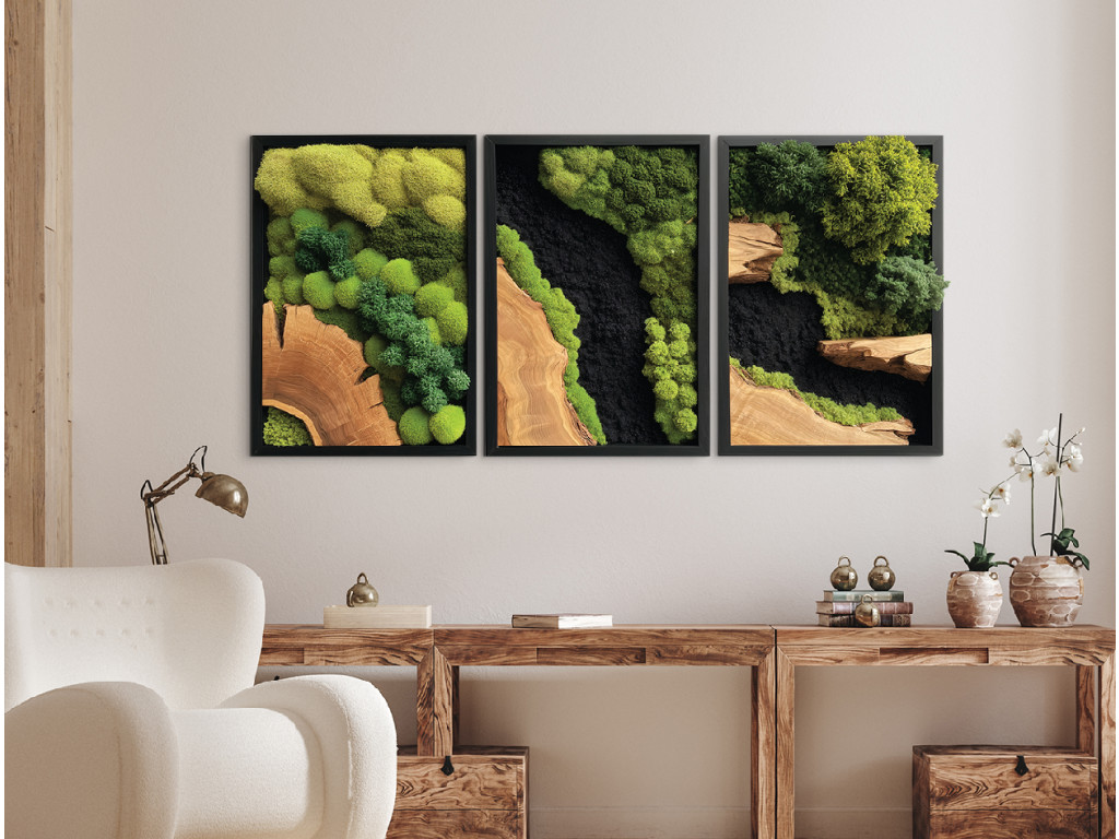 Das dreiteilige Moosbild Tiefe bringt eine perfekte Imitation von lebendem Moos in Ihr Zuhause. Dank moderner UV-Technologie erhalten Sie einen realistischen 3D-Effekt, der keine Pflege benötigt. Dieses Bild behält über Jahre hinweg sein frisches Aussehen und kostet weniger als klassische Moosbilder. Wählen Sie ein originelles Stück, das die Schönheit der Natur mit Zweckmäßigkeit verbindet.