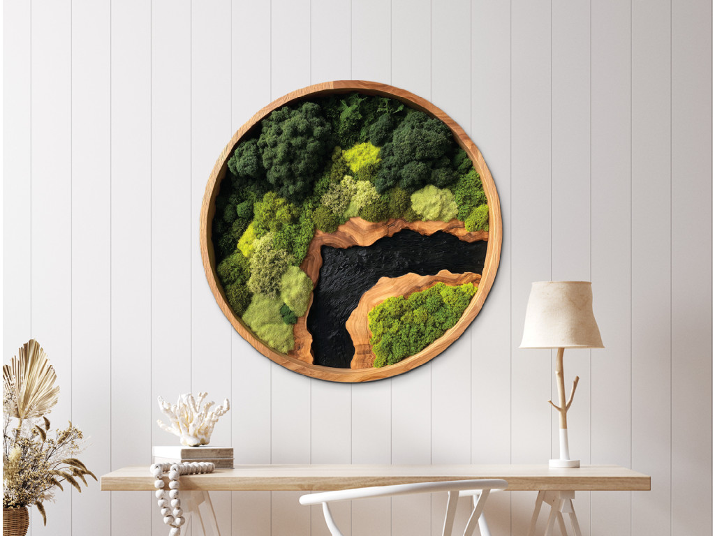 Das runde Moosbild Grüner Hauch bringt eine perfekte Imitation von lebendem Moos in Ihr Ambiente. Dank moderner UV-Technologie erhalten Sie einen realistischen 3D-Effekt ohne Pflegeaufwand. Dieses Bild behält über Jahre hinweg sein frisches Aussehen und kostet weniger als klassische Moosbilder. Wählen Sie ein originelles Stück, das die Schönheit der Natur mit Funktionalität verbindet.