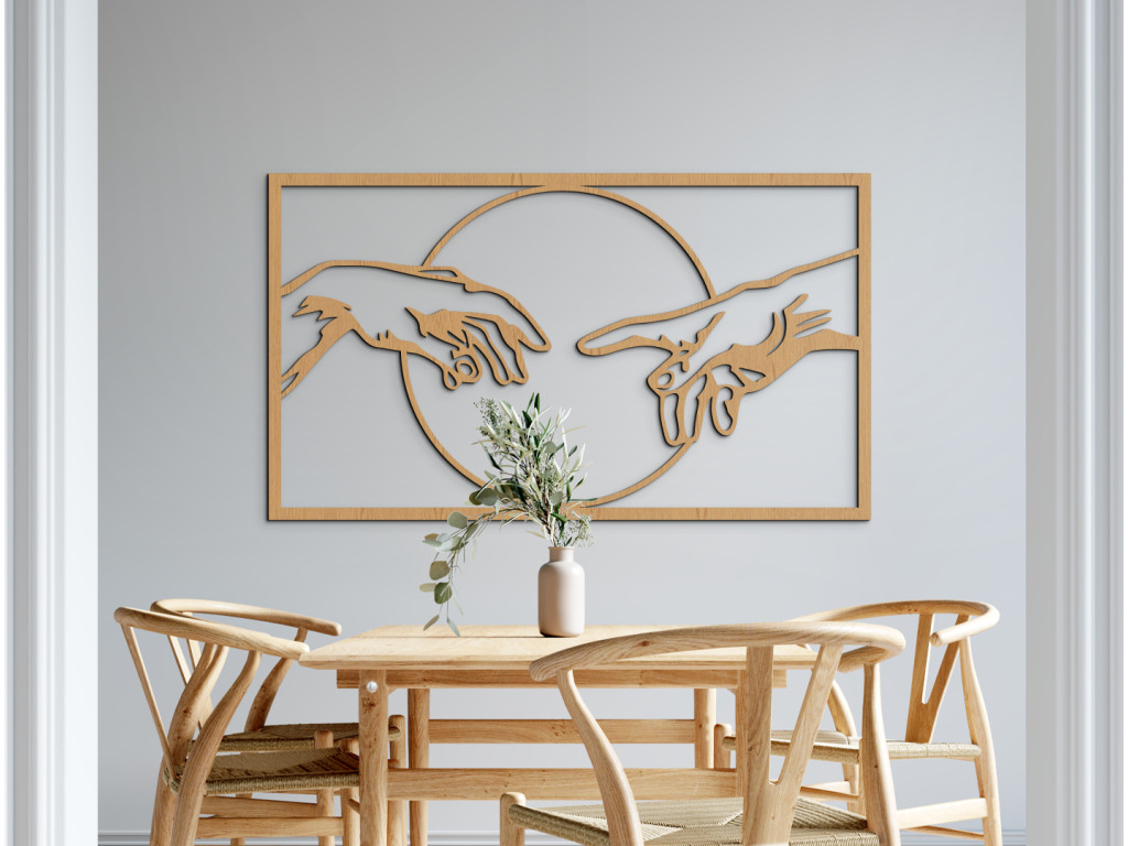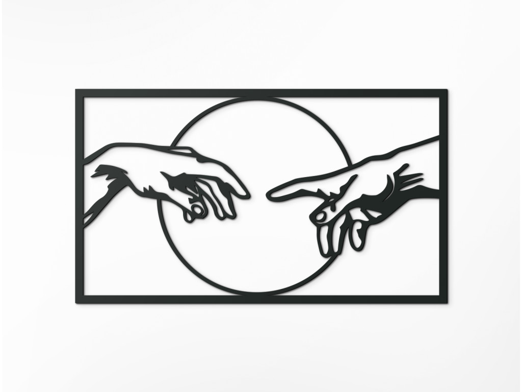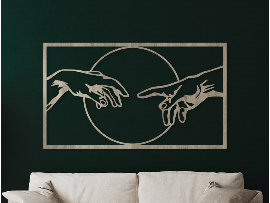 Das Bild Die Erschaffung Adams ist eine moderne Interpretation eines der bekanntesten Kunstmotive der Geschichte. Zwei ausgesägte Hände, die sich einander nähern, symbolisieren das Leben, die Berührung und die Verbindung des Menschen mit etwas Höherem. Elegante Linien und präzise Verarbeitung erzeugen einen ausdrucksstarken 3D-Effekt, der an der Wand sofort ins Auge fällt. Sie können aus mehreren Farbvarianten wählen, die den Stil Ihrer Einrichtung unterstreichen.