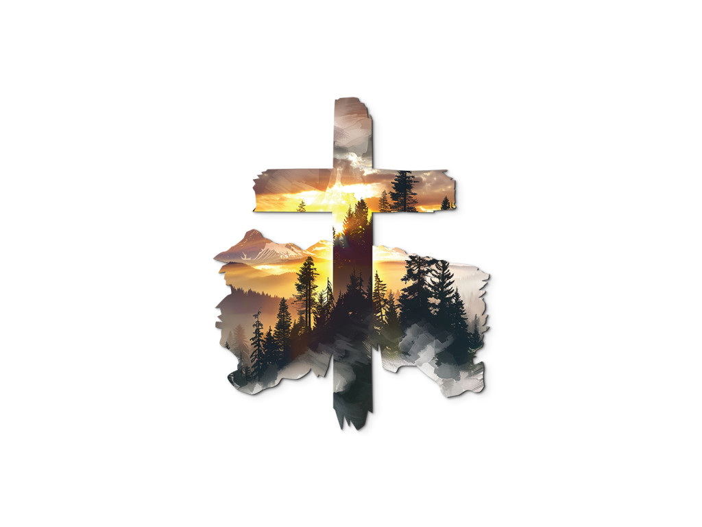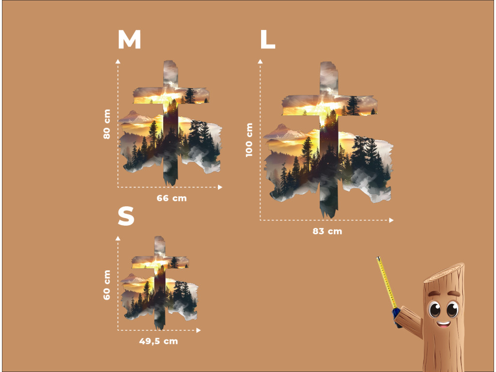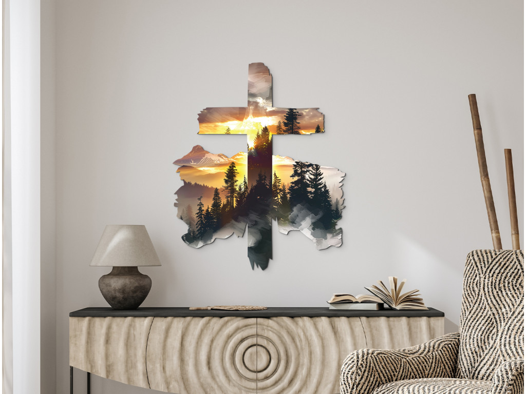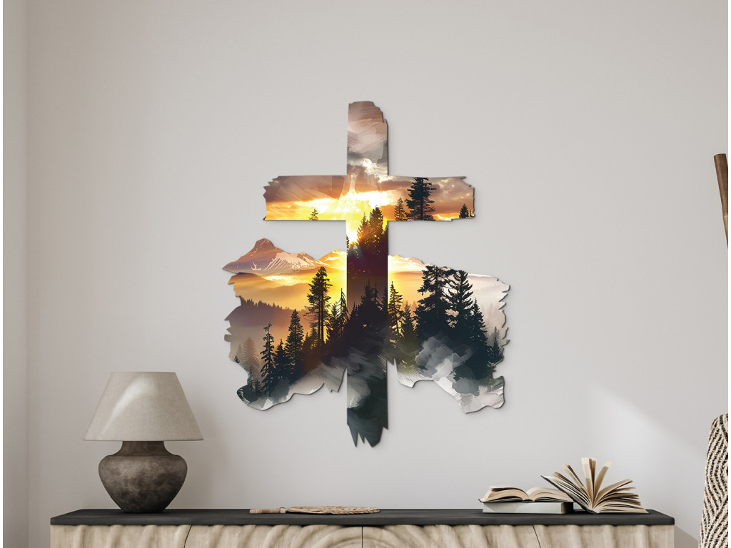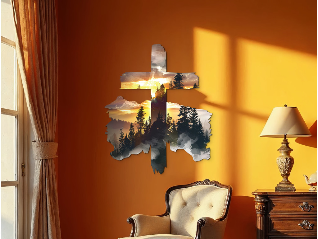 Die Wanddekoration in Form eines Kreuzes verbindet das christliche Symbol mit einer wunderschönen Landschaft – einem Sonnenuntergang über Bergen und Wäldern. Die Sonnenstrahlen, die durch die Bäume scheinen, verleihen der Szene Stille, Ruhe und spirituelle Tiefe. Dieses Bild erinnert an die Gegenwart Gottes in der Natur und lädt dazu ein, über die Schönheit der Schöpfung und die Hoffnung, die das Kreuz mit sich bringt, nachzudenken.