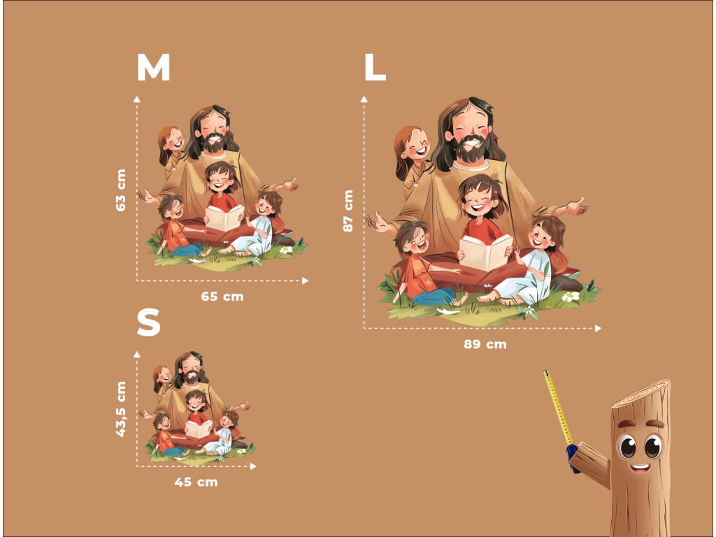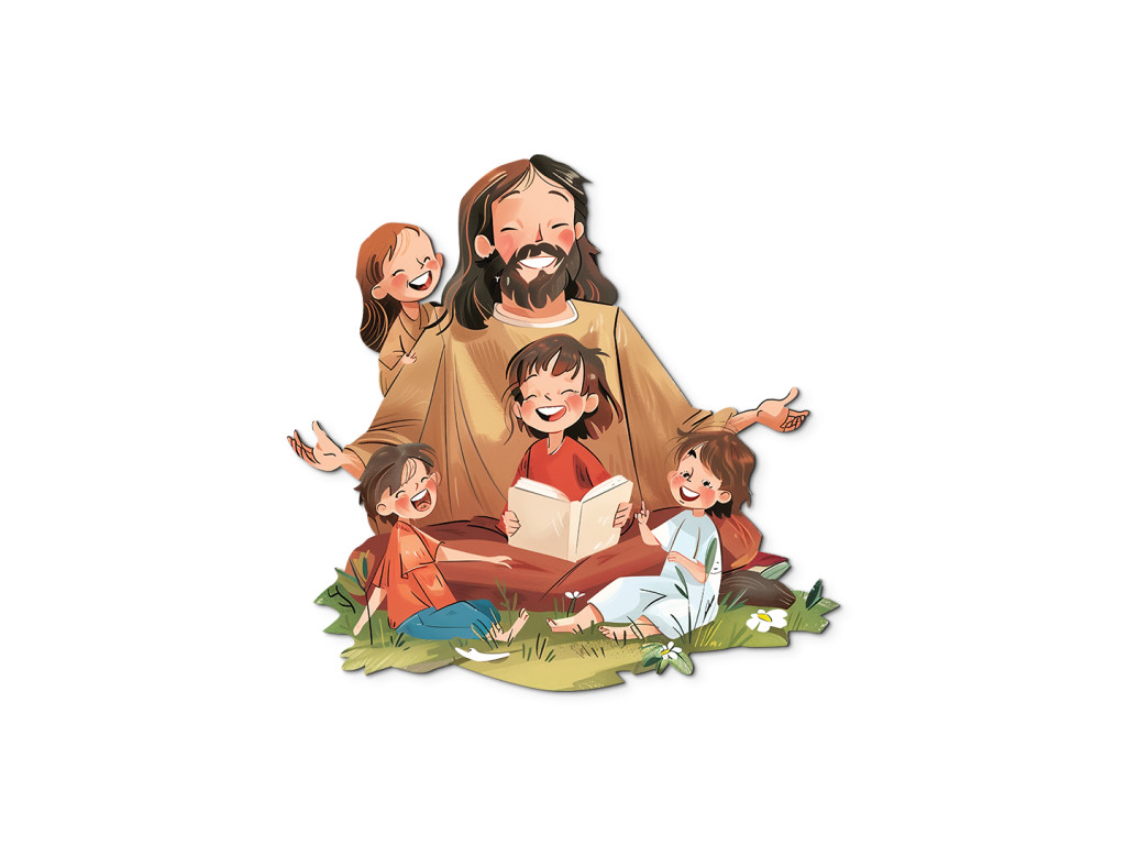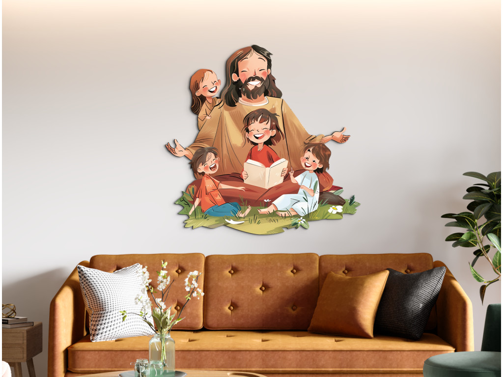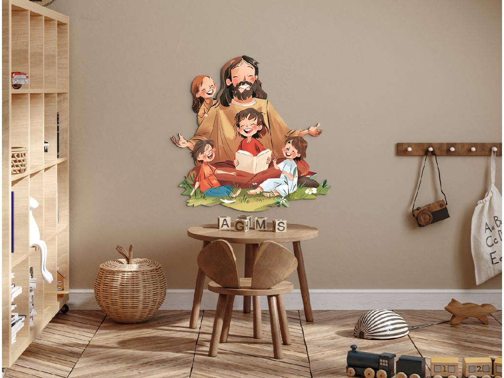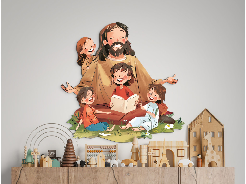Die Illustration zeigt Jesus, wie er inmitten einer Gruppe fröhlicher Kinder sitzt, die sich vertrauensvoll und interessiert zu ihm umdrehen. Eines der Kinder liest ein Buch, was auf das Lehren und Weitergeben von Glaubensgeschichten hindeutet. Jesus drückt mit einem Lächeln und offenen Armen Liebe, Akzeptanz und Frieden aus, während grünes Gras und Blumen die friedliche und natürliche Atmosphäre vervollständigen. Ideal für die Dekoration von Kinderzimmern oder religiösen Räumen.