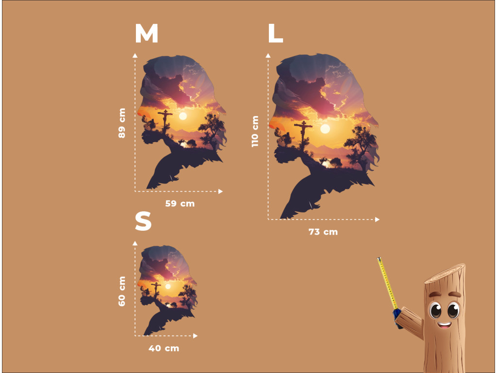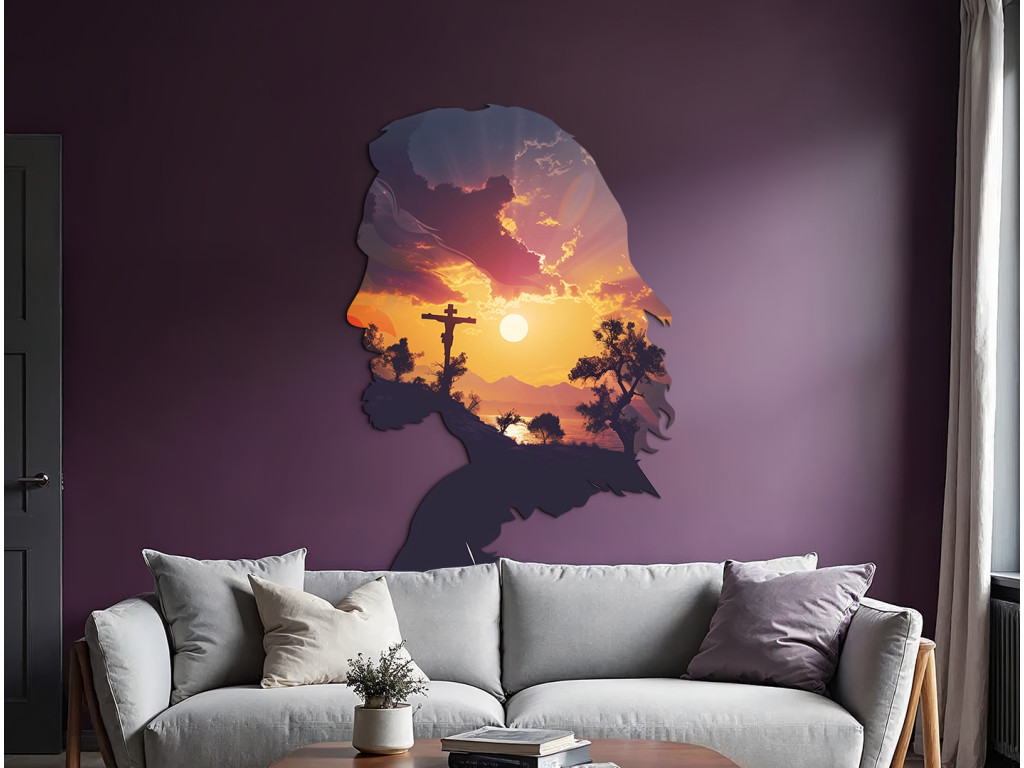 Die Wanddekoration verbindet die Silhouette des Gesichts Jesu Christi mit der ergreifenden Szene eines Sonnenuntergangs, die sich innerhalb seines Profils abspielt. Im Schein der orange-gelben Sonne zeichnet sich Golgatha mit dem Kreuz ab, umgeben von den Silhouetten von Bäumen und Hügeln. Das Werk wirkt spirituell und symbolisch – als Verbindung von Opfer, Glauben und Hoffnung im Licht eines neuen Tages.