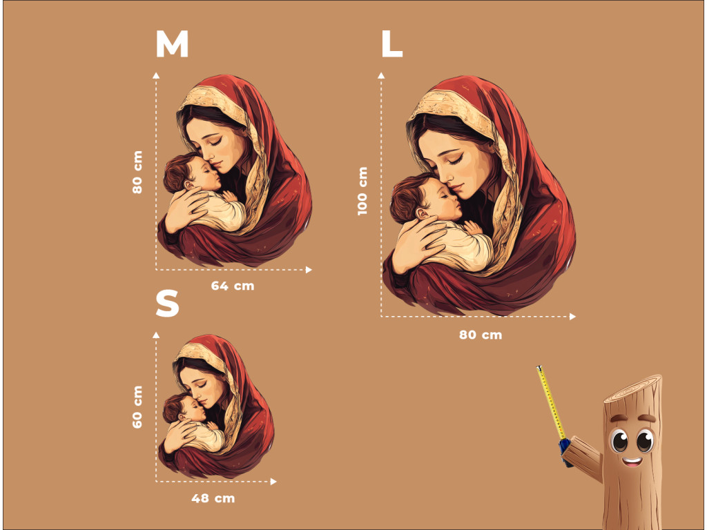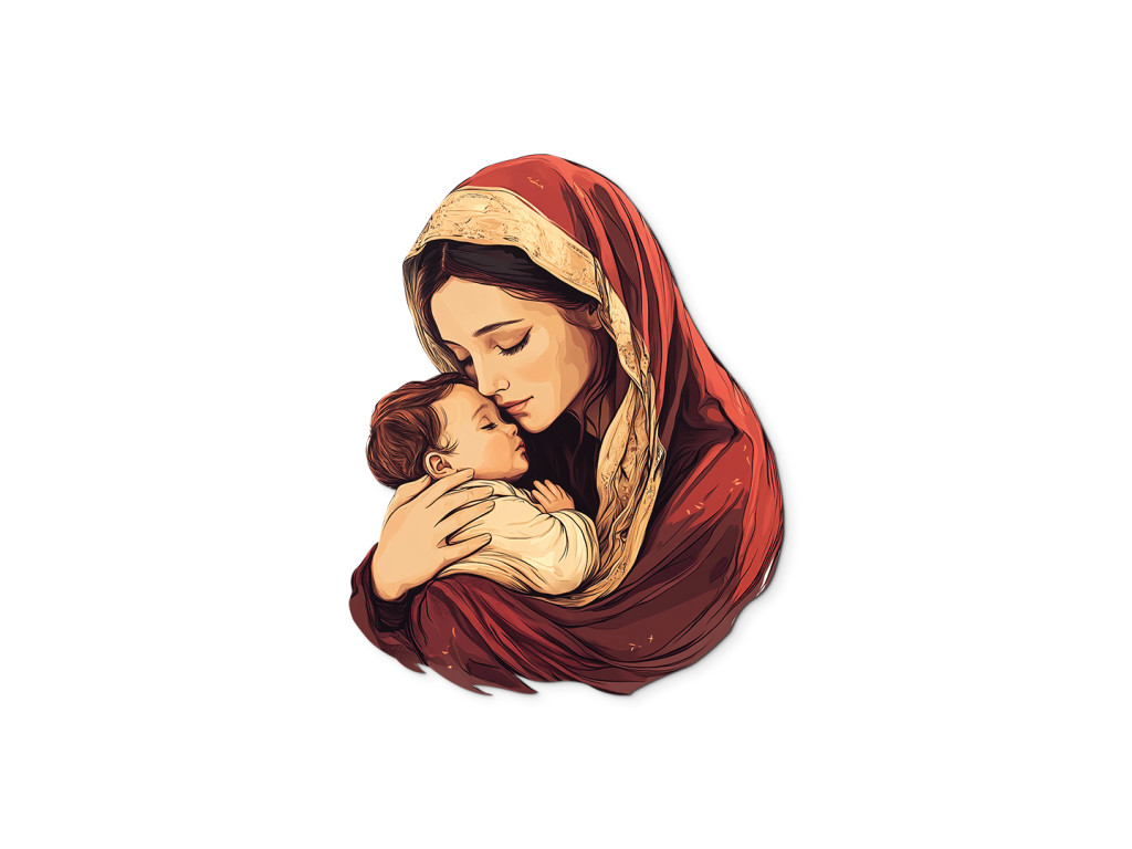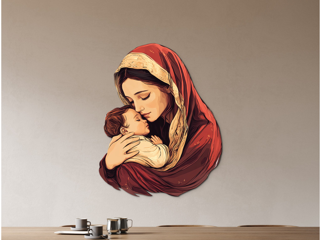 Das Bild fängt einen zärtlichen Moment zwischen Mutter Maria und ihrem Kind Jesus ein – ein Symbol für tiefe, bedingungslose Liebe und Schutz. Die mütterlichen Arme vermitteln das erste Gefühl von Sicherheit, Akzeptanz und Vertrauen, das die emotionale Grundlage des Kindes für sein ganzes Leben bildet. Diese starke Bindung ist Ausdruck purer Empathie, Fürsorge und des natürlichen Wunsches der Mutter, für das Wohlergehen ihres Kindes zu sorgen – mit einer Liebe, die keine Grenzen kennt.