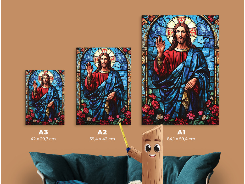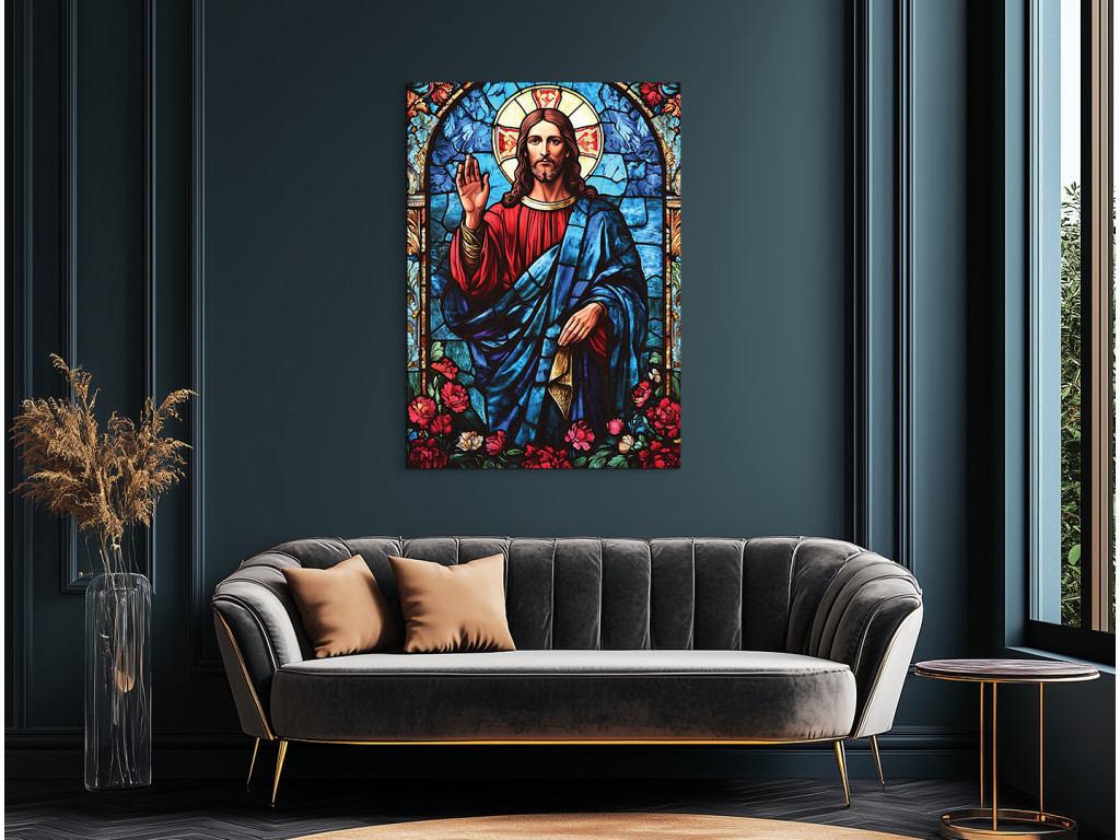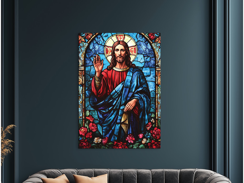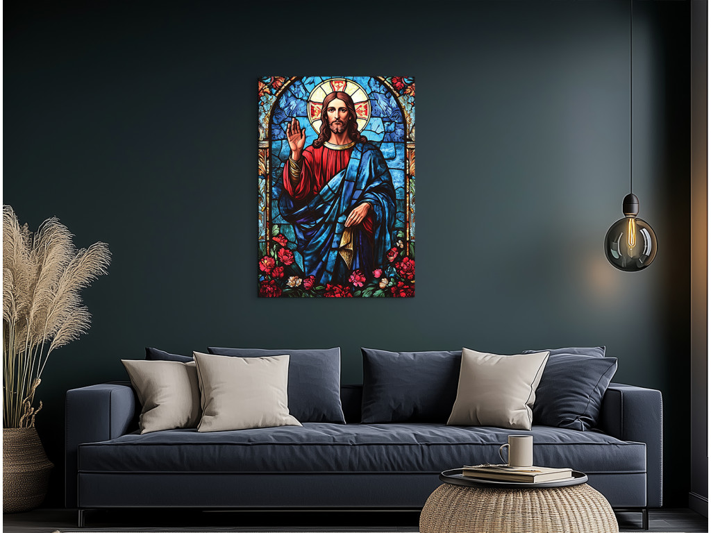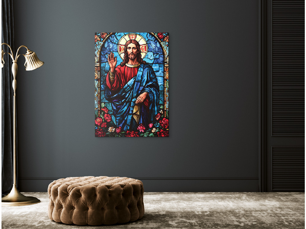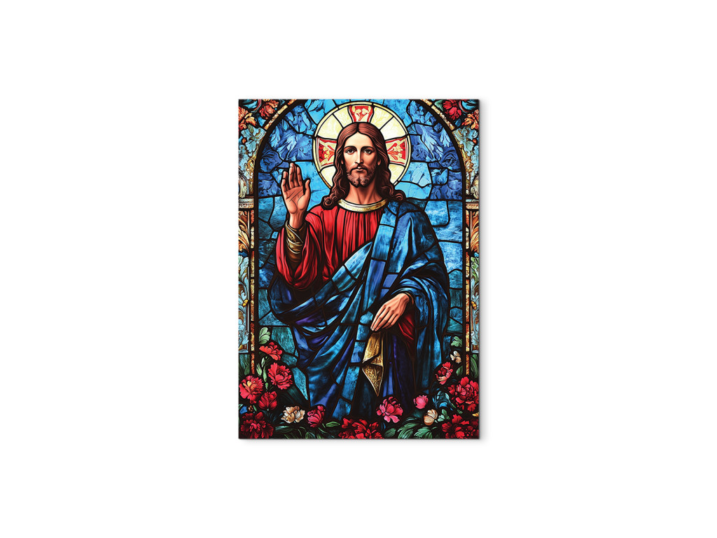 Das Bild zeigt Jesus Christus im Stil eines Buntglasfensters – mit farbigen Flächen, die durch dunkle Konturen voneinander getrennt sind. Der Gesichtsausdruck ist demütig und ruhig, wirkt spirituell und ikonisch. Die Gesamtgestaltung des Werks vermittelt einen Eindruck von Leuchtkraft und Heiligkeit, als würde Licht durch eine gläserne Kirchenszene scheinen.