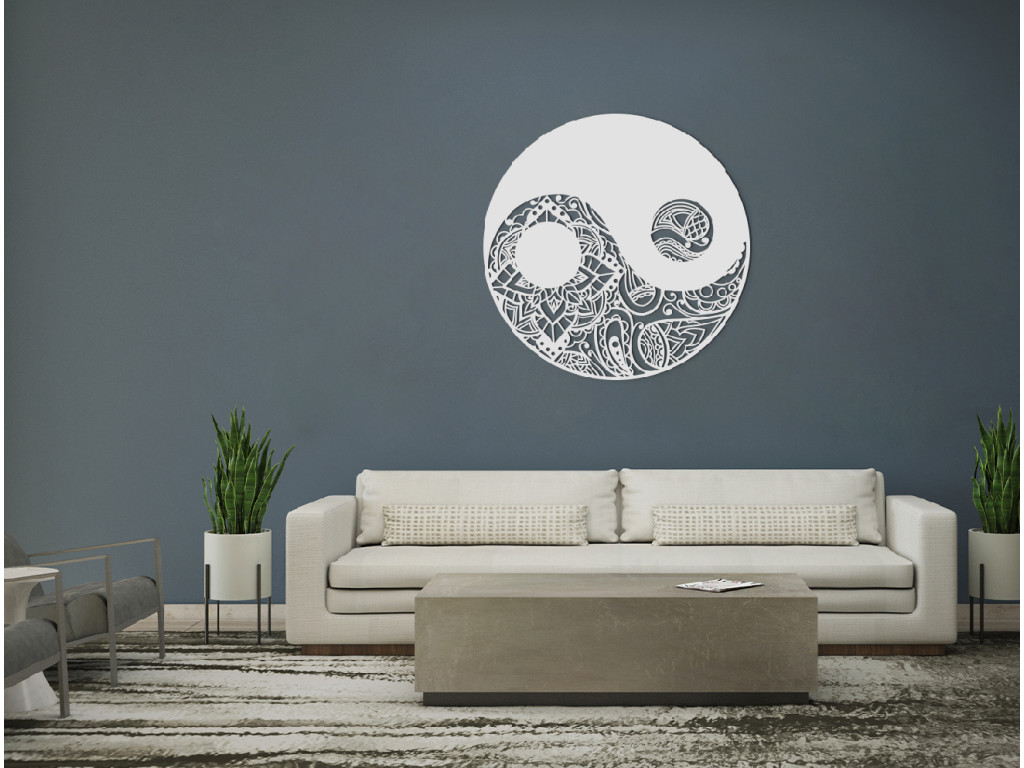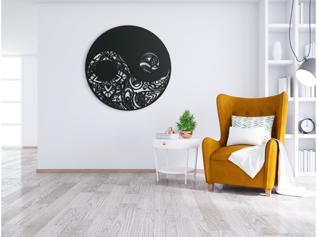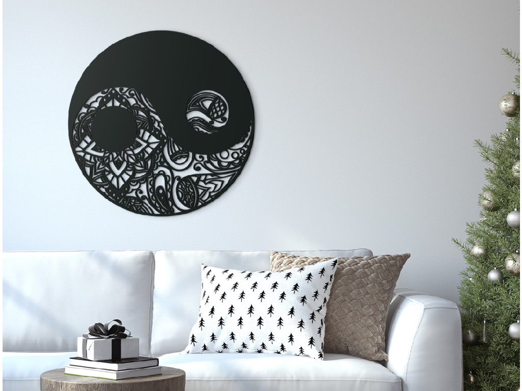 Das ausgeschnitte Bild mit Yin und Yang ist ein Accessoire, das Sie im Büro, Wohn- und Schlafzimmer schätzen werden. Ein Mandala in diesem Design vermittelt einen ruhigen Eindruck und passt wirklich in jeden Raum.
