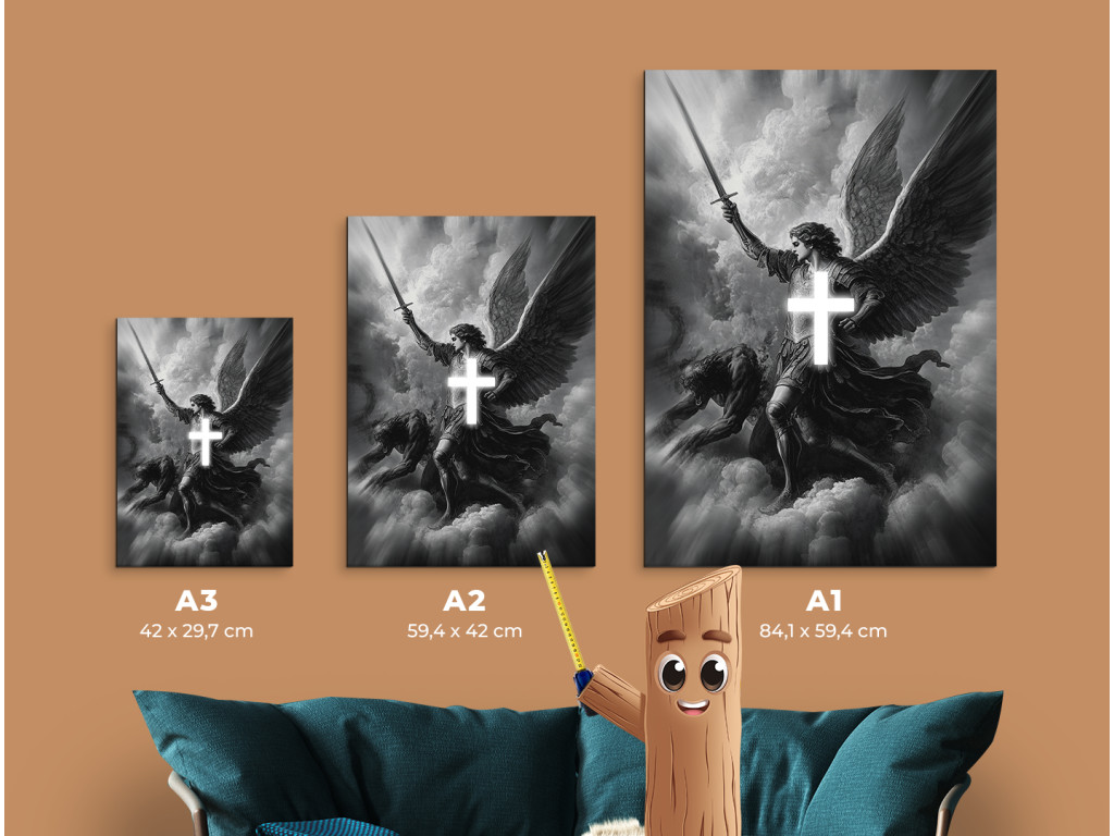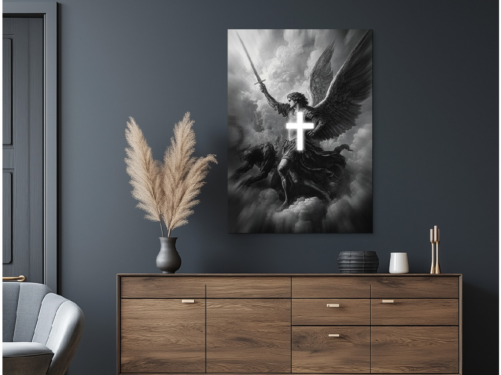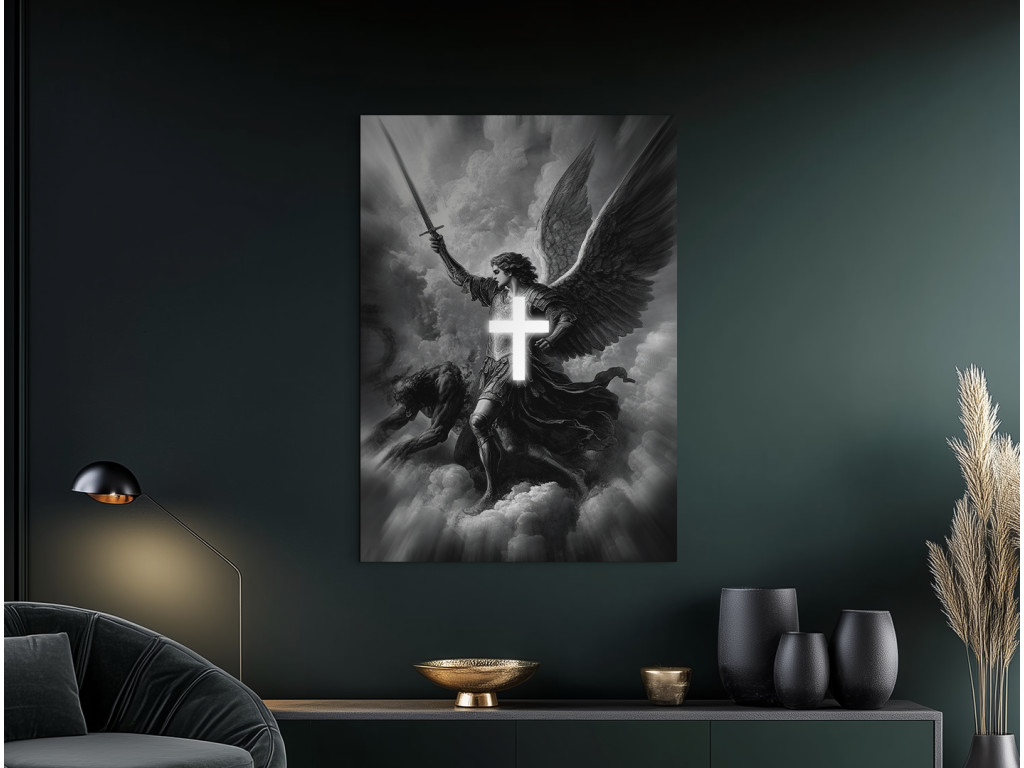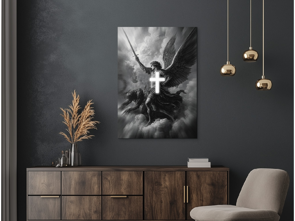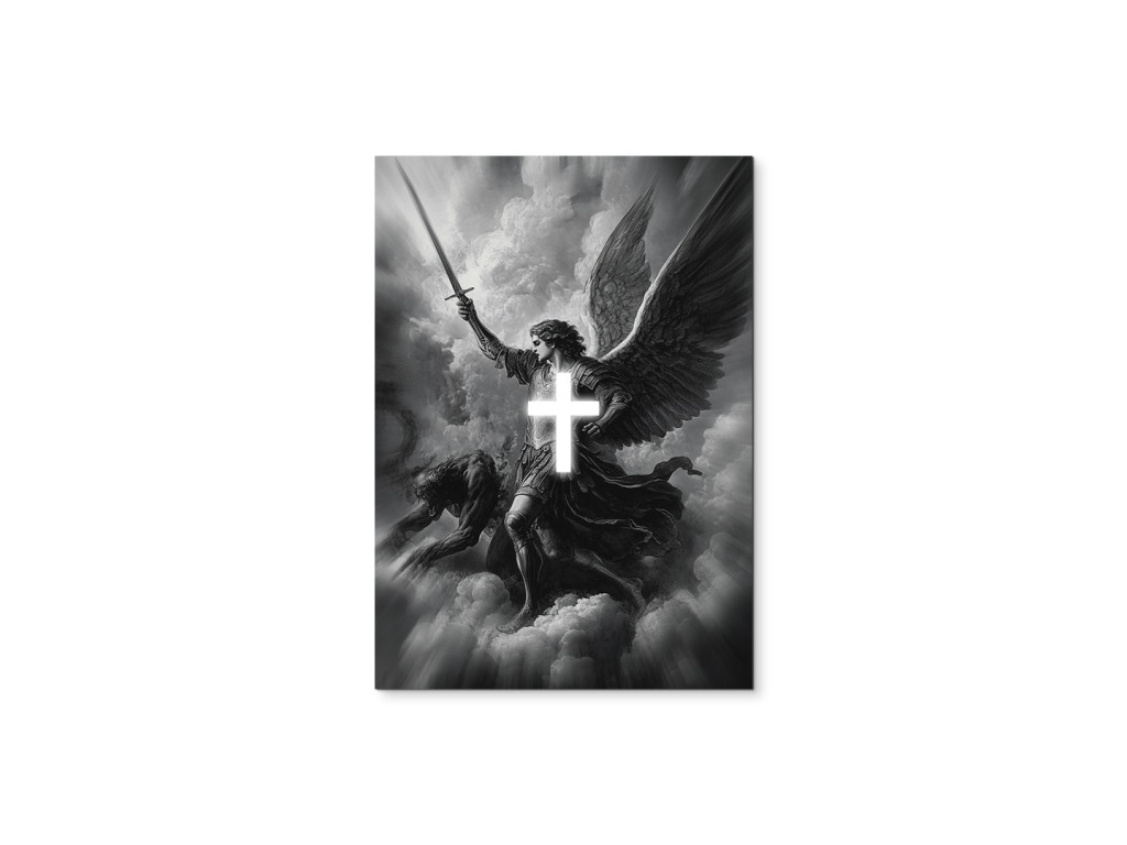 Das Bild zeigt den Erzengel Michael, den legendären himmlischen Krieger, wie er entschlossen mit seinem Schwert dasteht, bereit, das Böse zu besiegen. Seine Haltung, sein Heiligenschein und seine markante Rüstung verkörpern Schutz, Gerechtigkeit und göttliche Macht. Als Symbol für den Sieg des Lichts über die Dunkelheit ist Michael der Schutzpatron der Krieger und der Schild des Glaubens.