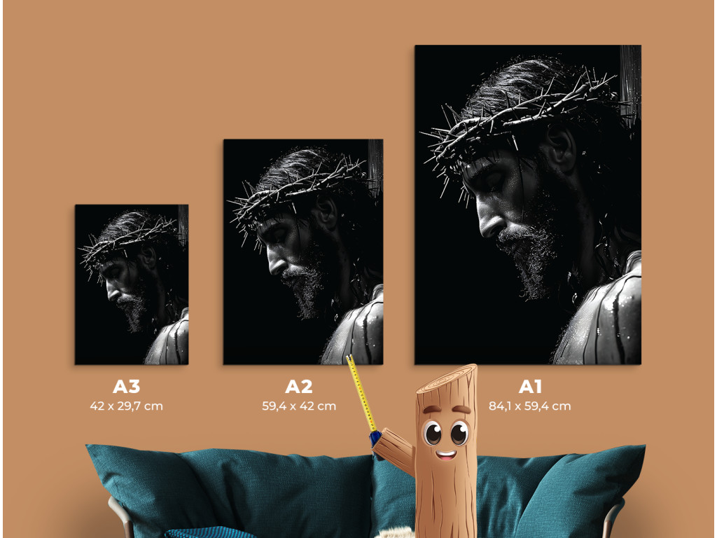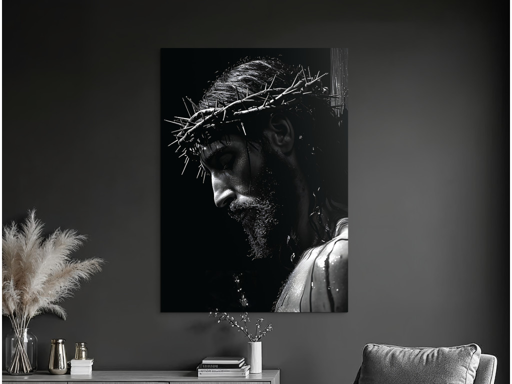 Das Schwarz-Weiß-Bild zeigt das Gesicht Jesu Christi mit der Dornenkrone, versunken in tiefes Leiden und Schweigen. Die minimalistische Gestaltung in Schwarz-, Grau- und Weißtönen verstärkt die emotionale Kraft des Ausdrucks, der voller Schmerz, Demut und Opferbereitschaft ist. Dieses Werk wirkt zeitlos und kontemplativ, lädt zum Innehalten und Mitgefühl ein.