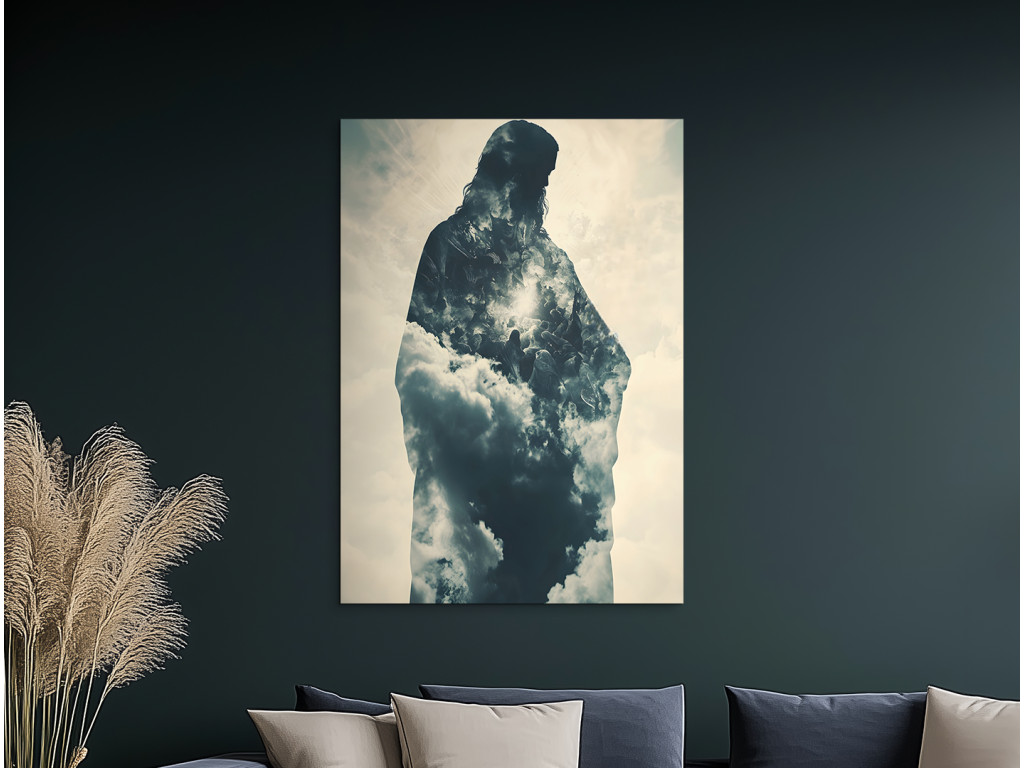 Dieses Bild nutzt die Technik der Doppelbelichtung, um die Silhouette Jesu Christi vor einem wolkenverhangenen Himmel darzustellen. Die Kombination aus klassischer religiöser Ikone und himmlischem Motiv schafft eine starke spirituelle Atmosphäre, in der sich göttliche Präsenz mit visueller Poesie verbindet. Das Ergebnis ist ein Bild, das Ruhe, Hoffnung und eine zeitgemäße Sichtweise auf Spiritualität verkörpert.