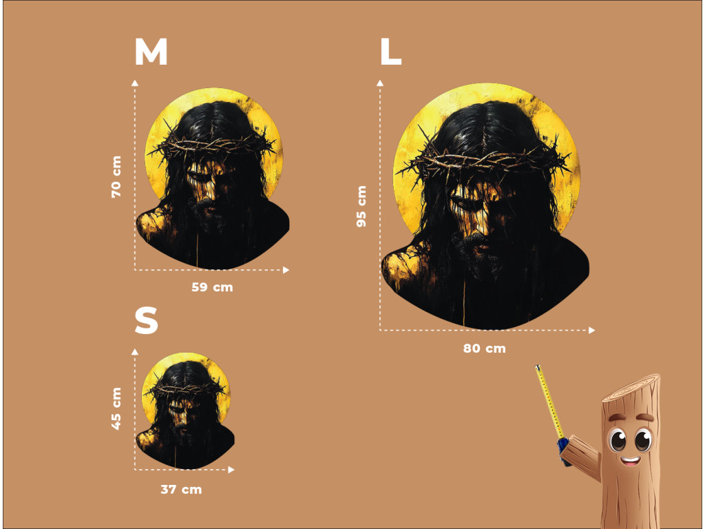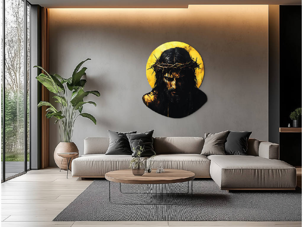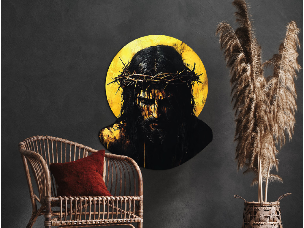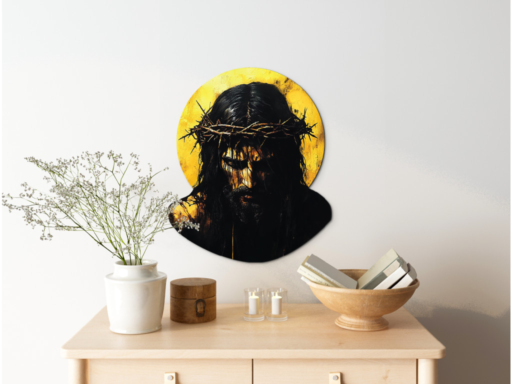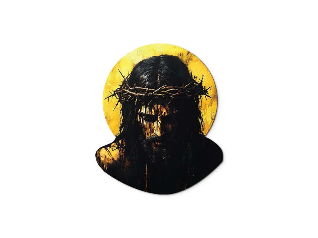 Die künstlerische Darstellung Jesu Christi zeigt sein Gesicht mit dunklem Haar, Bart und einer markanten Dornenkrone – Symbol für Opfer und Leiden. Hinter seinem Kopf strahlt ein gelber Heiligenschein, der einen Kontrast zum dunklen, dramatischen Hintergrund bildet und seine spirituelle Kraft und Einzigartigkeit unterstreicht. Das Werk konzentriert sich auf den Gesichtsausdruck und betont damit die innere Tiefe und die Botschaft der Erlösung.
