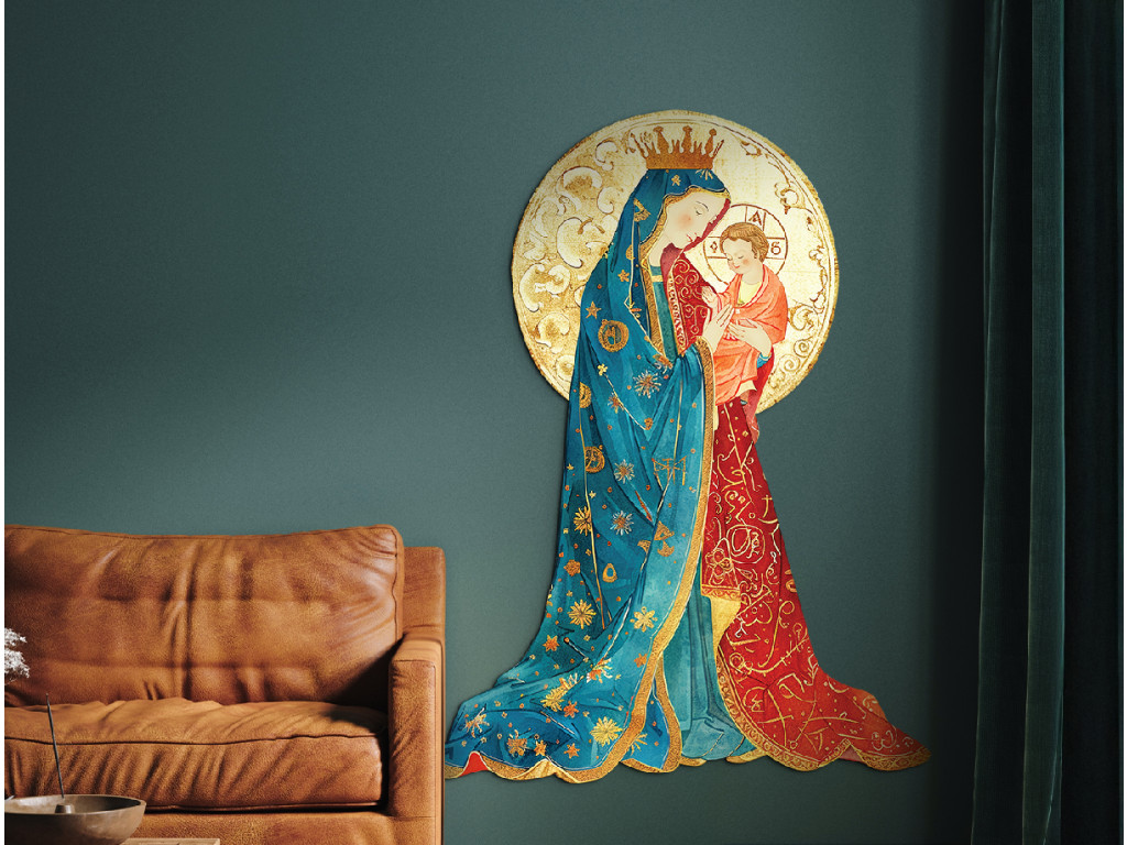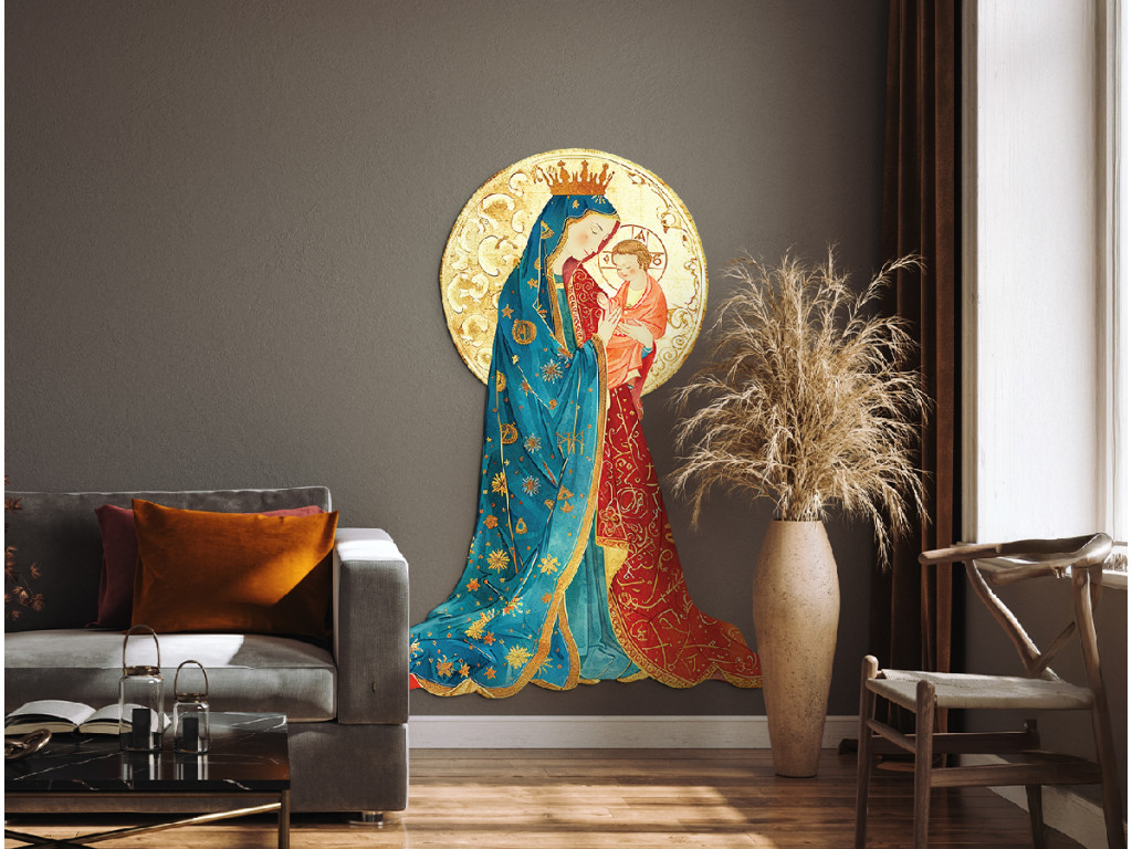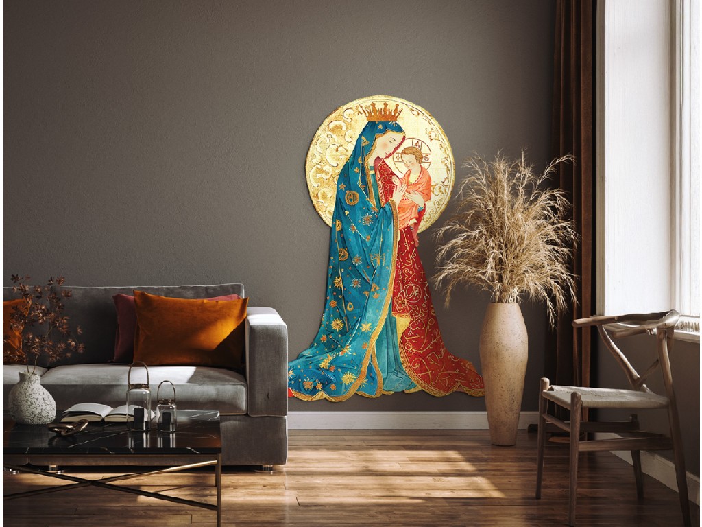 Maria wird als liebevolle Mutter dargestellt, die ihren Sohn beschützt, während das Jesuskind die Ankunft des Erlösers auf der Welt symbolisiert. Goldene Heiligenscheine um ihre Köpfe unterstreichen ihre Heiligkeit und ihre spirituelle Verbindung, die über das menschliche Verständnis hinausgeht. Diese Szene verkörpert mütterliche Liebe, Hingabe und Glauben.