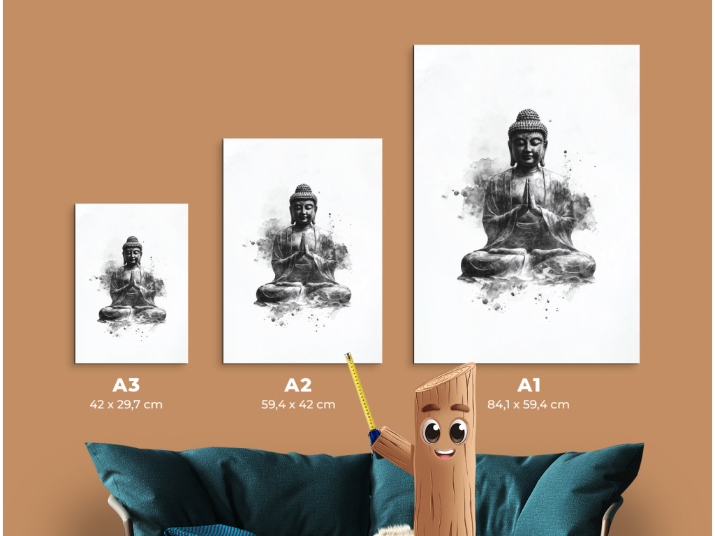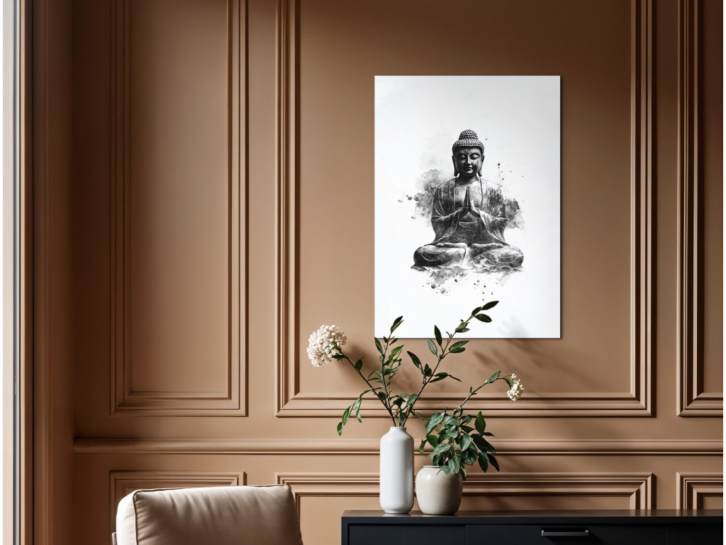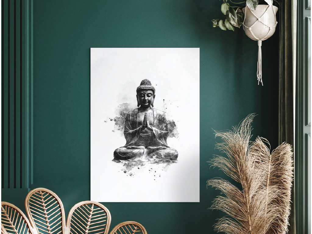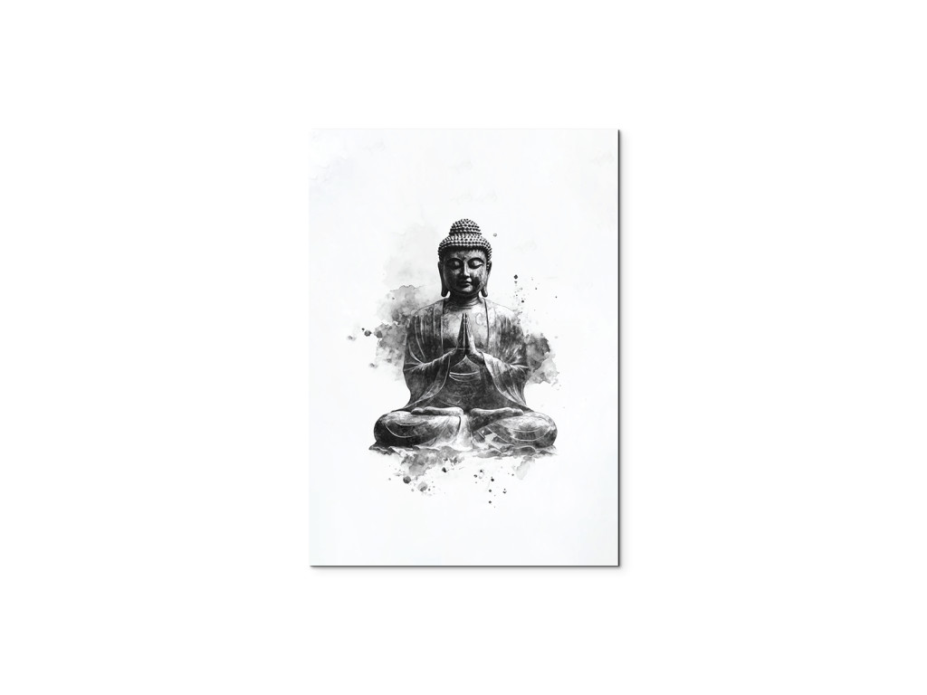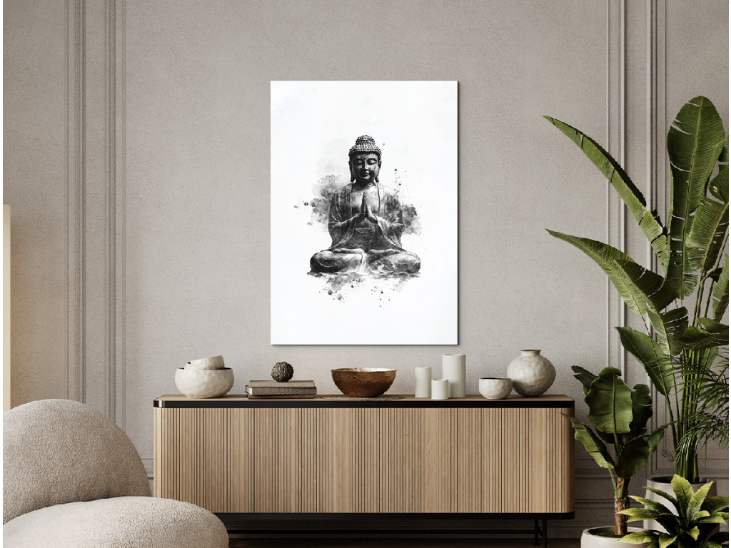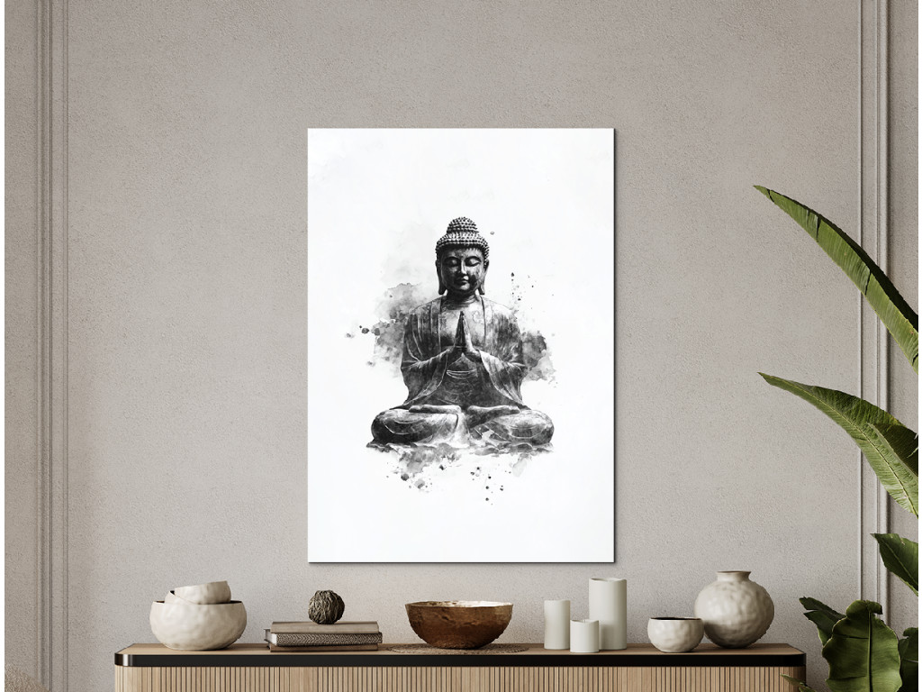 Das minimalistische Bild zeigt eine gezeichnete Buddha-Statue vor weißem Hintergrund. Die Statue symbolisiert Ruhe, spirituelles Erwachen und die Lehren des Buddhismus und erinnert an den Weg zu innerem Frieden und Erleuchtung.