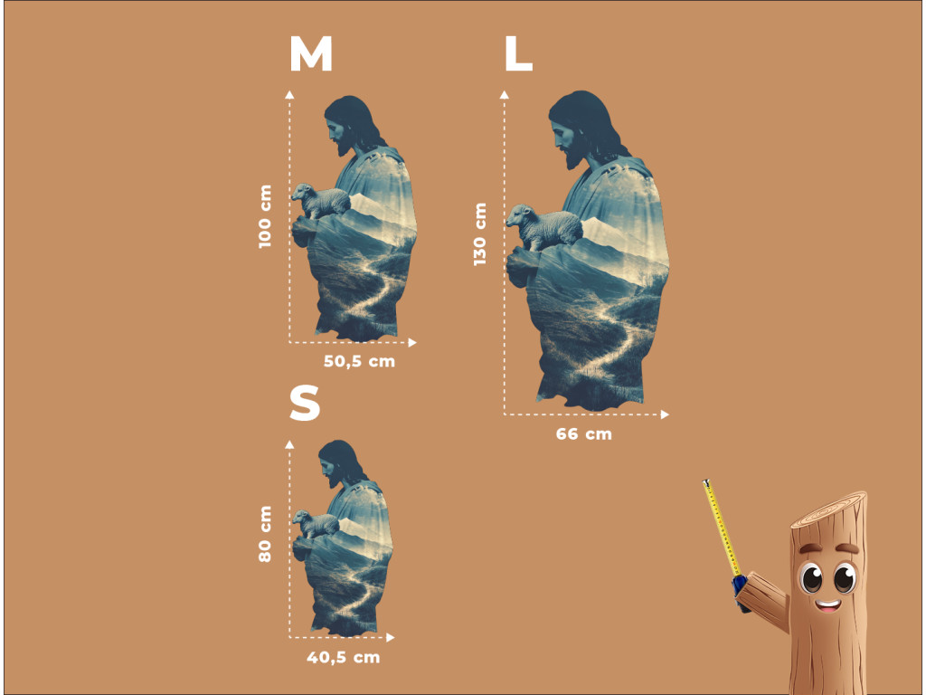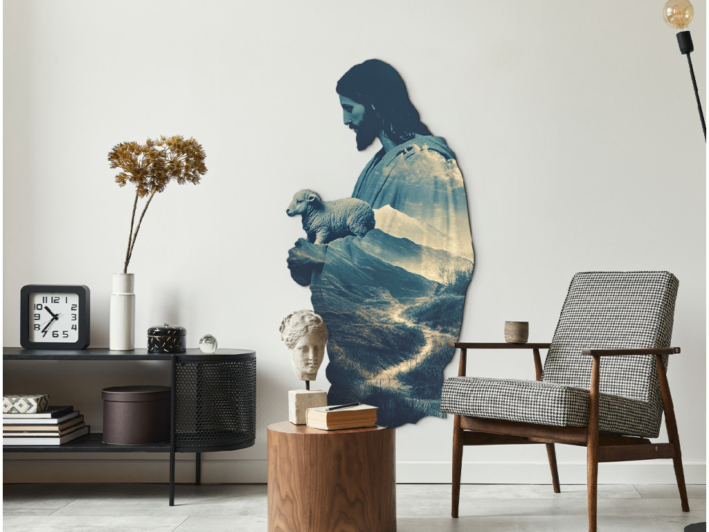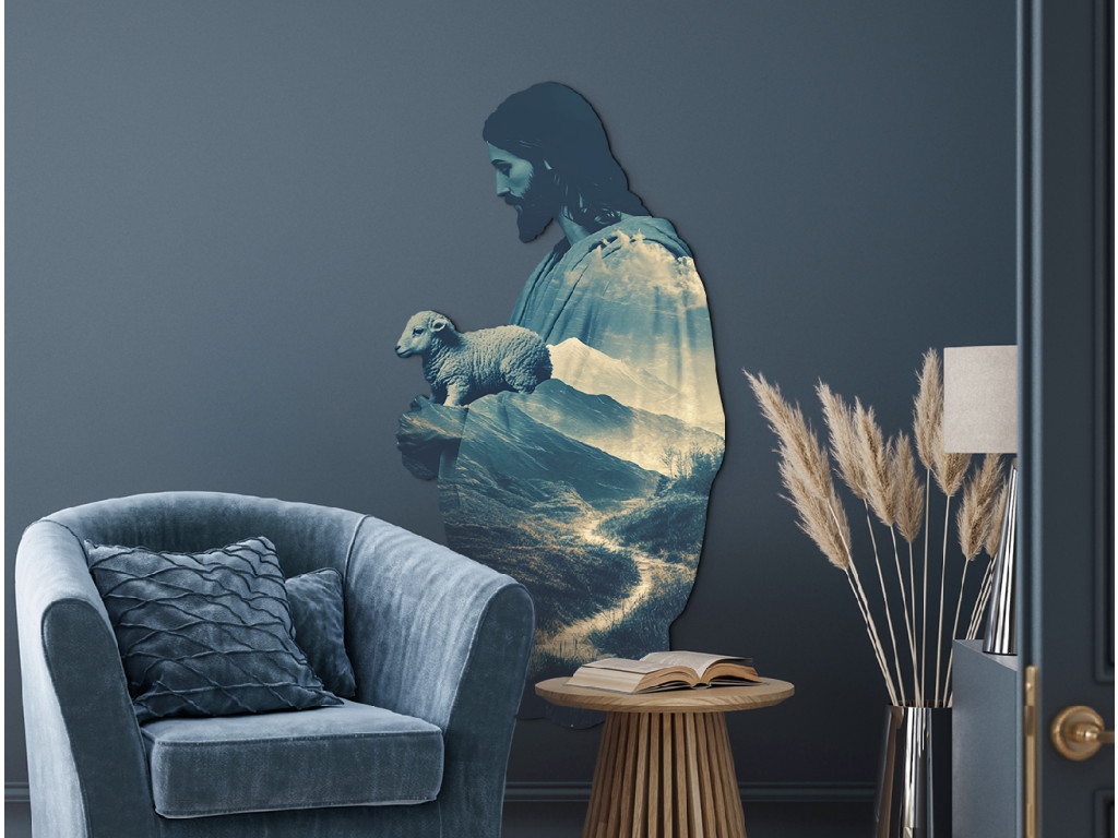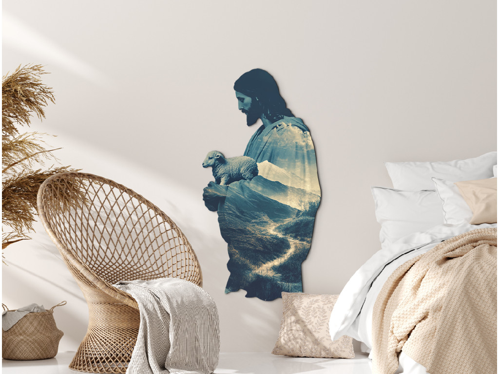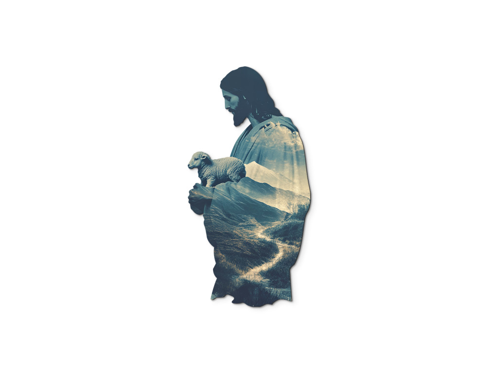 Das Bild zeigt die Figur Jesu Christi mit einem Lamm – eine Szene, die seine Rolle als guter Hirte symbolisiert. Innerhalb der Silhouette erstreckt sich eine Berglandschaft mit einem Weg, der die spirituelle Pilgerreise und den Lebensweg symbolisiert, auf den er seine Anhänger führt. Das Lamm in seinen Armen steht für Reinheit, Unschuld und Liebe, während die Gesamtkomposition Fürsorge, Schutz und Opferbereitschaft als grundlegende Botschaften des christlichen Glaubens hervorhebt.