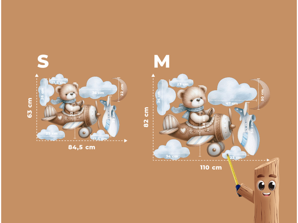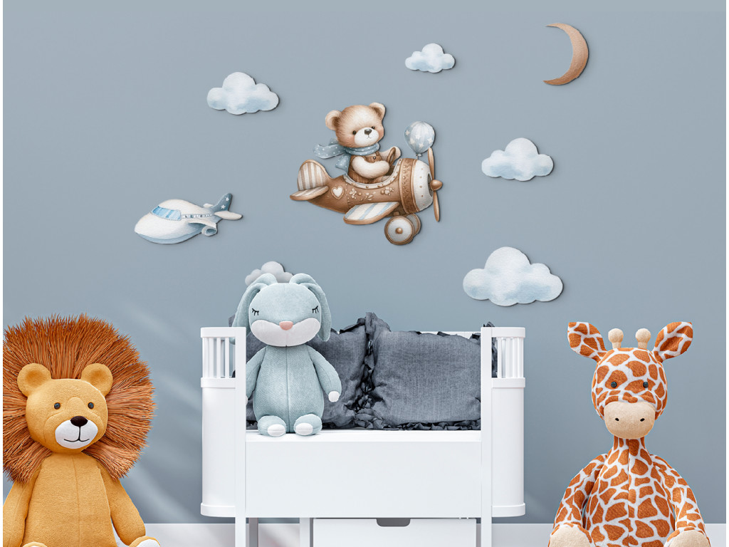 Der Bärenpilot fliegt zwischen den Wolken mit dem Mond über sich und einem weiteren Flugzeug in der Ferne. Ein niedliches Bild für das Kinderzimmer kleiner Träumer und Abenteurer.