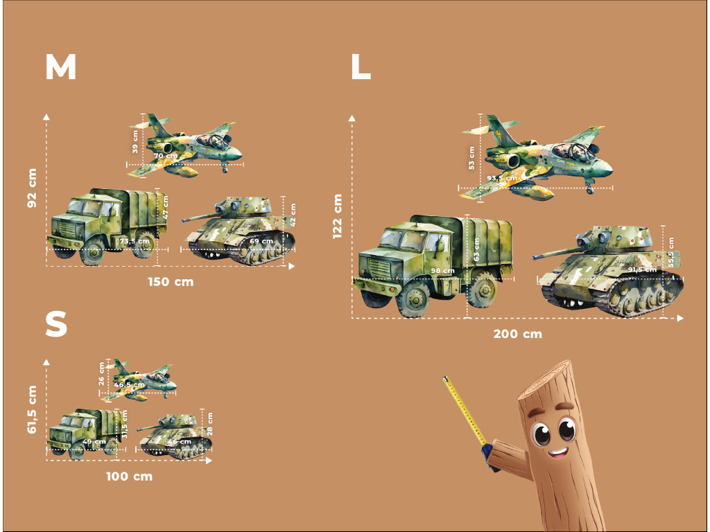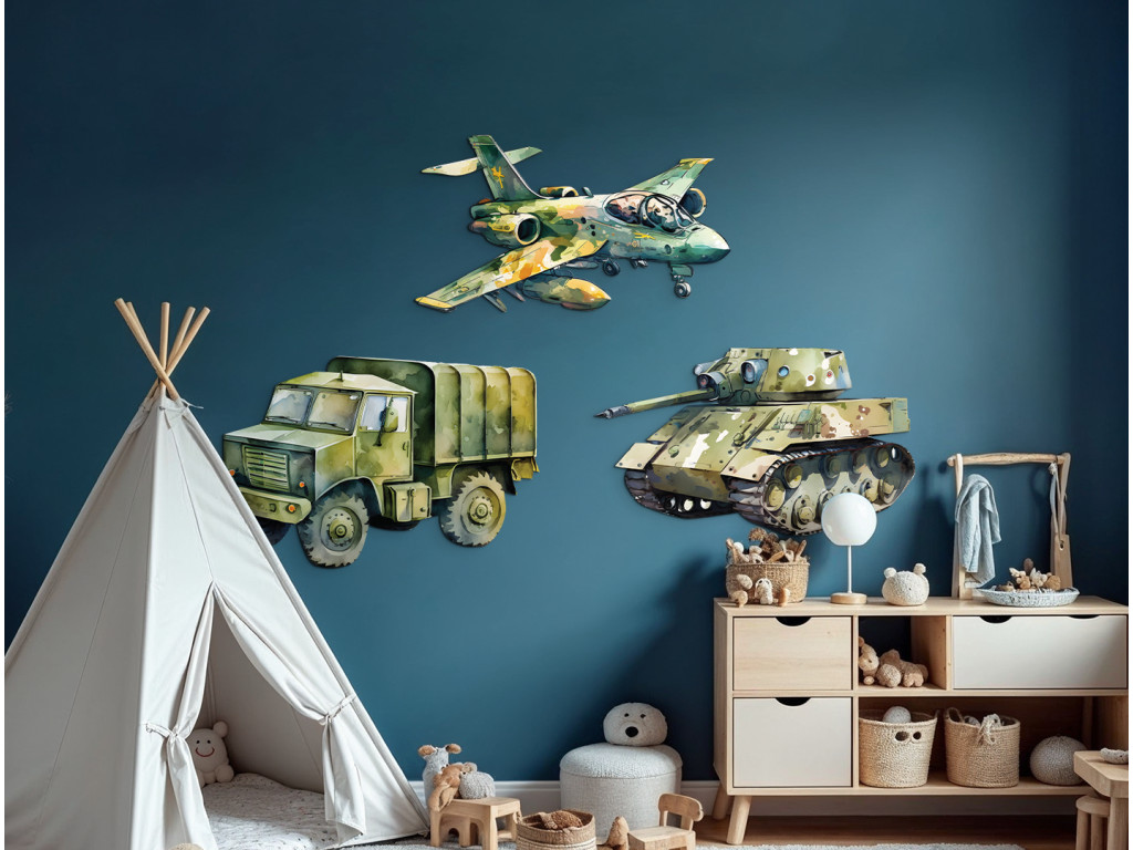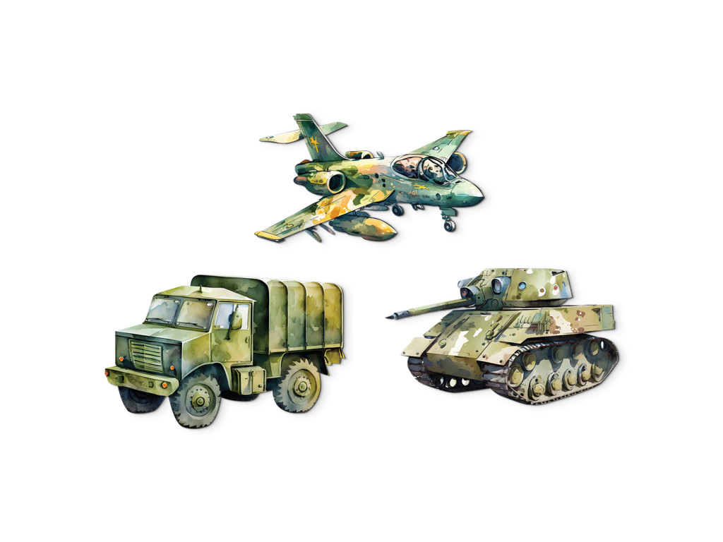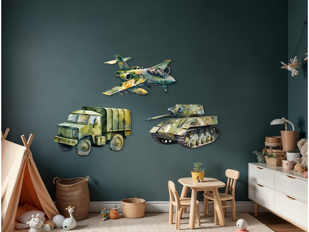Panzer, Flugzeug und Tatra im illustrierten Kinderstil – das perfekte Set für kleine Fans von Maschinen und Abenteuern. Alle Fahrzeuge sind so gestaltet, dass sie freundlich und nicht aggressiv wirken – ideal als Dekoration für das Zimmer eines kleinen Technikers, Bauarbeiters oder Fans von Autos und Maschinen.