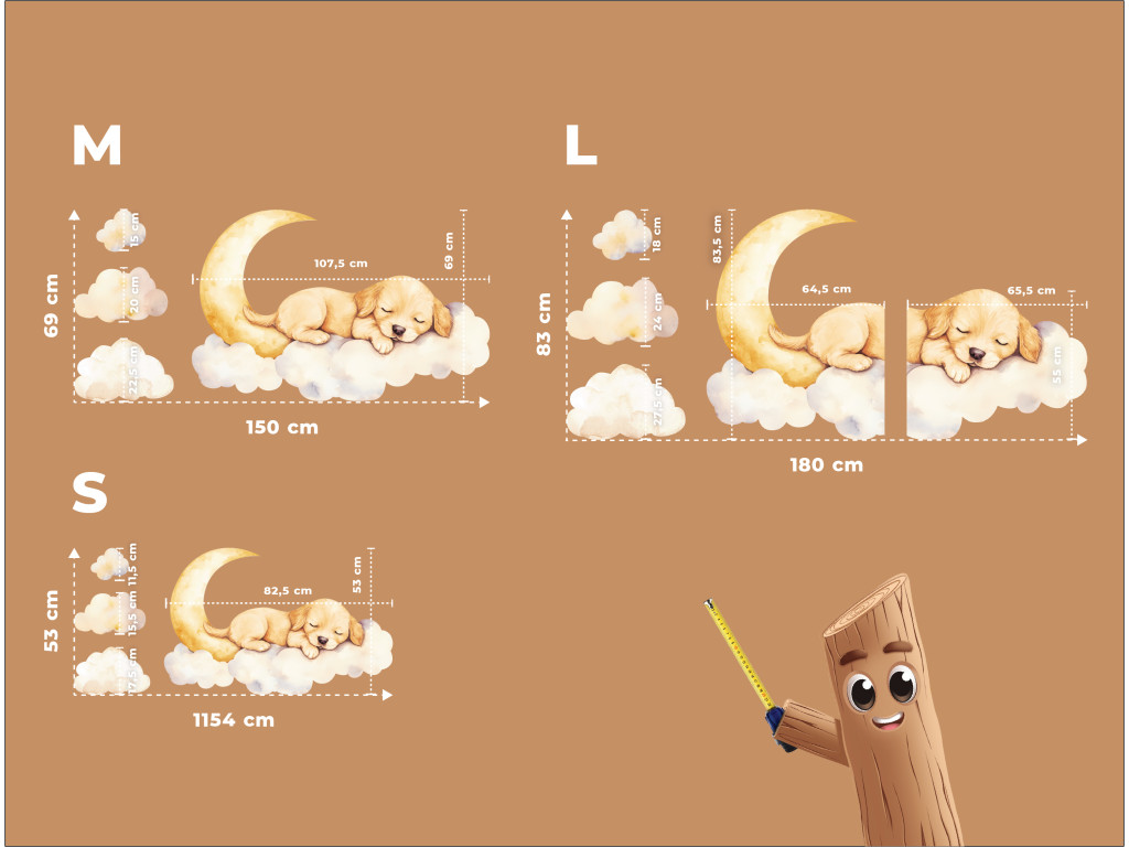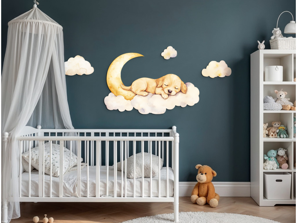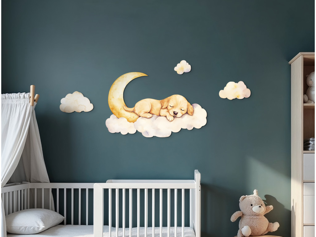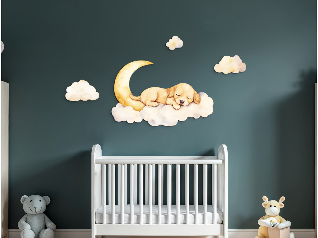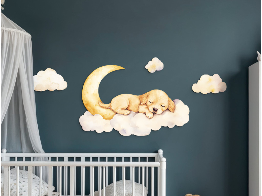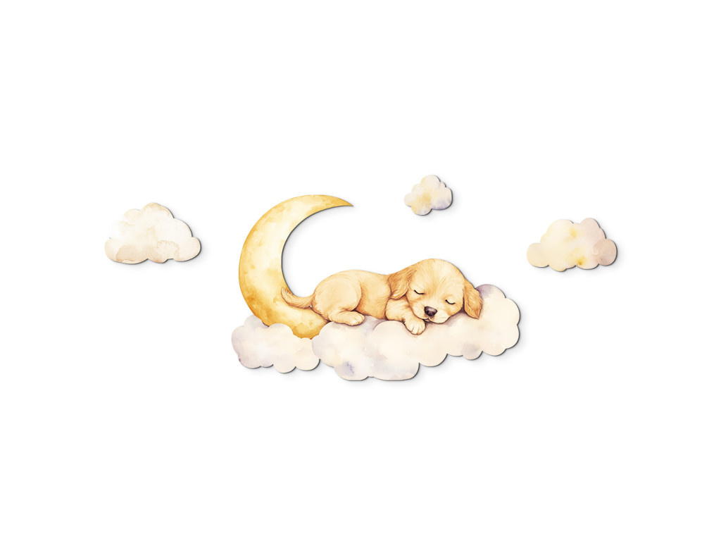 Auf einer weichen Wolke, im Schein des Mondes, ruht friedlich ein goldener Hund mit verträumtem Blick. Diese zarte Illustration schafft eine beruhigende Atmosphäre voller Stille, Geborgenheit und kindlicher Fantasie. Die perfekte Dekoration für ein Kinderzimmer, in dem man ruhig einschlafen kann.