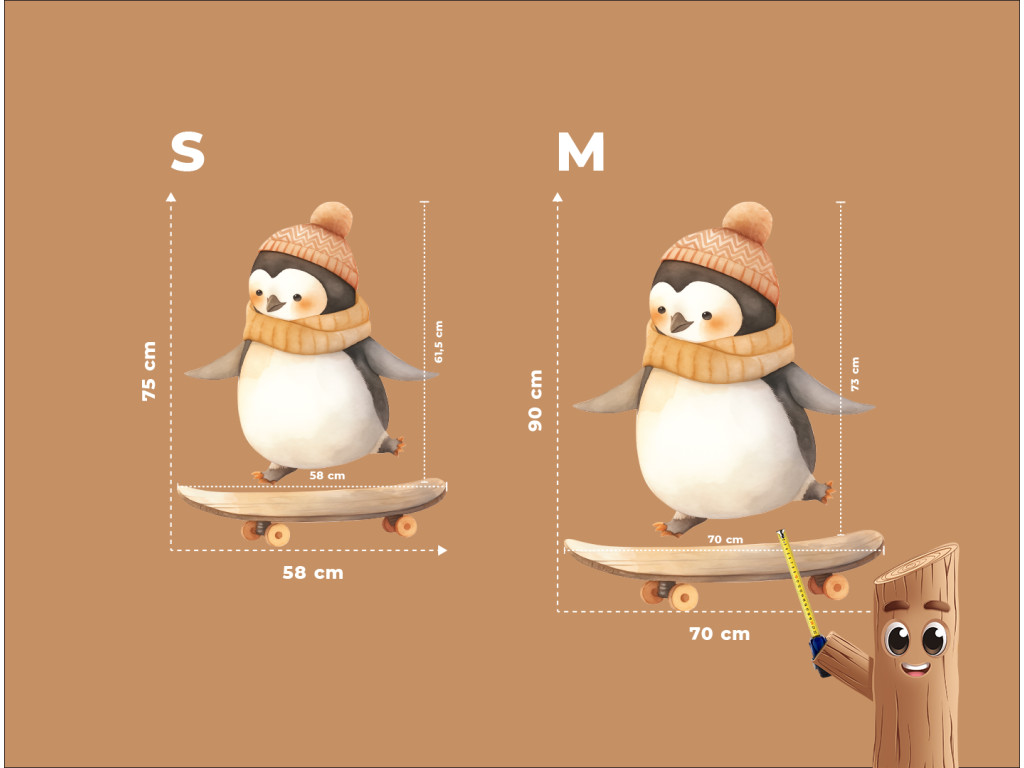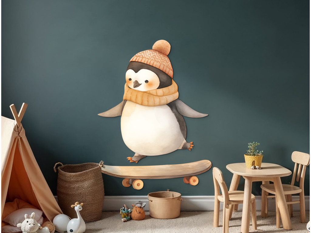 Ein niedlicher Pinguin mit Mütze und Schal bahnt sich auf seinem Skateboard seinen Weg durch die Straßen (oder Gletscher?). Dieses Bild verbindet Winter, Bewegung und Spaß – ideal für ein Kinderzimmer voller Energie und guter Laune.
