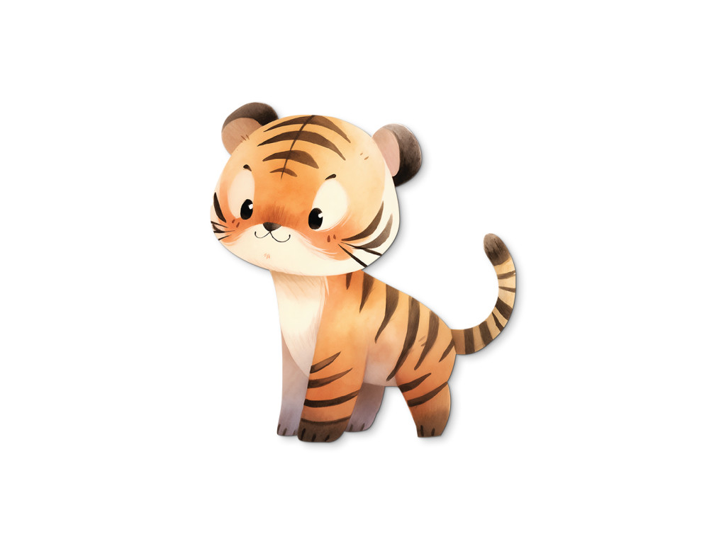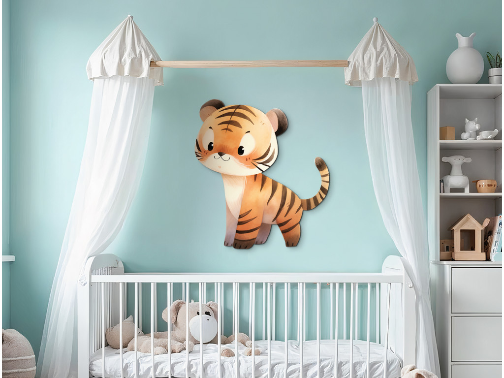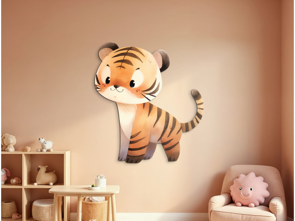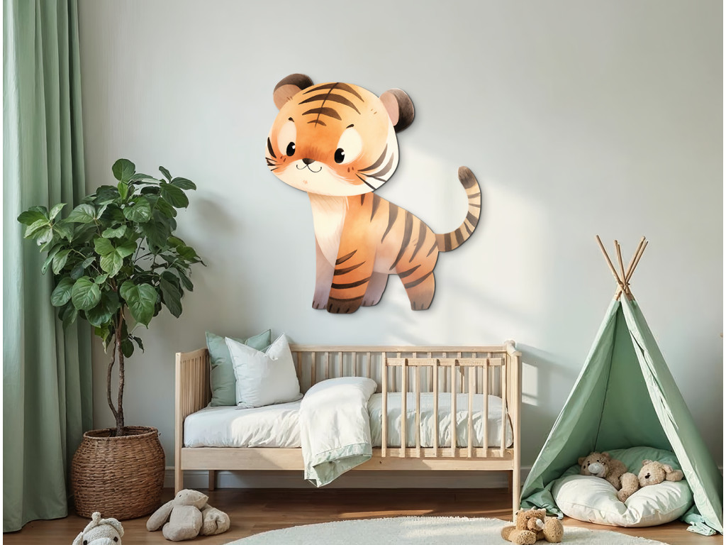 Auf dem Bild ist ein süßes Tigerbaby mit typischem orangefarbenem Fell und markanten schwarzen Streifen zu sehen. Tiger gehören zu den größten Raubkatzen der Welt, aber dieses Jungtier ist ruhig, freundlich und wie geschaffen für ein Kinderzimmer voller Abenteuer und Fantasie.
