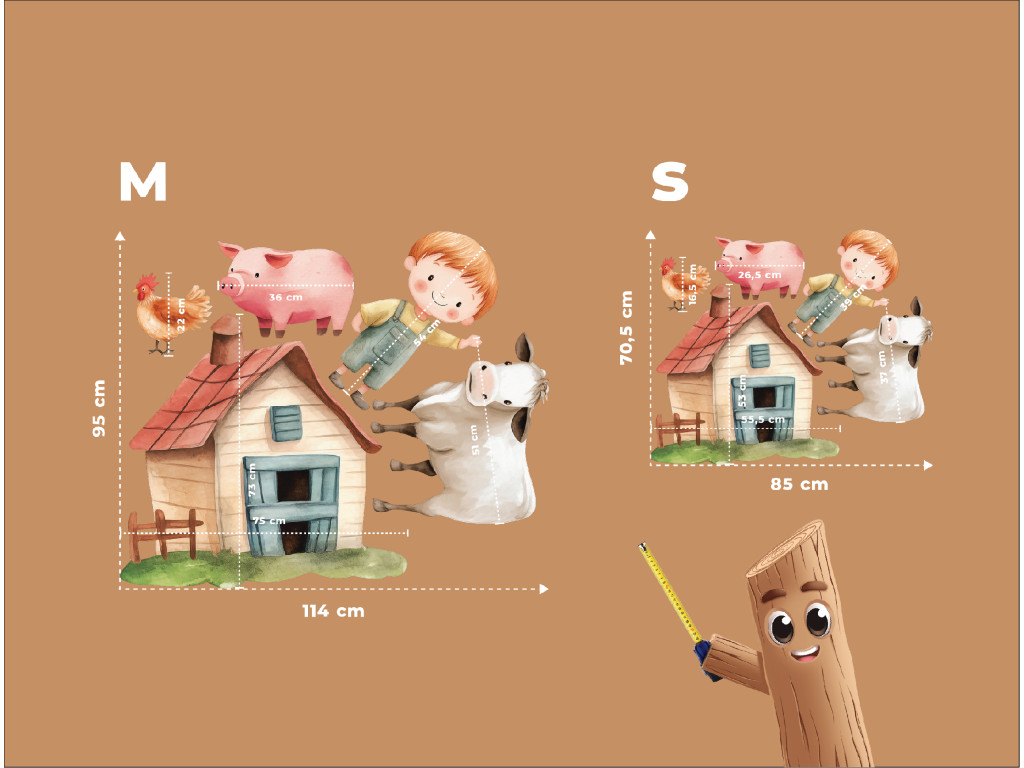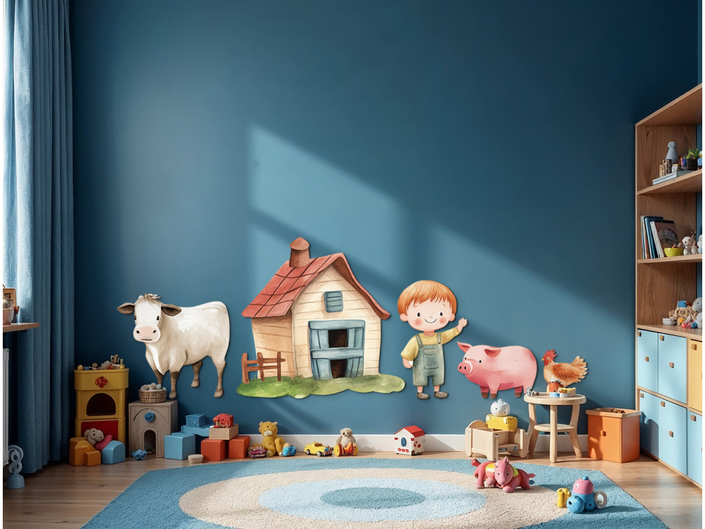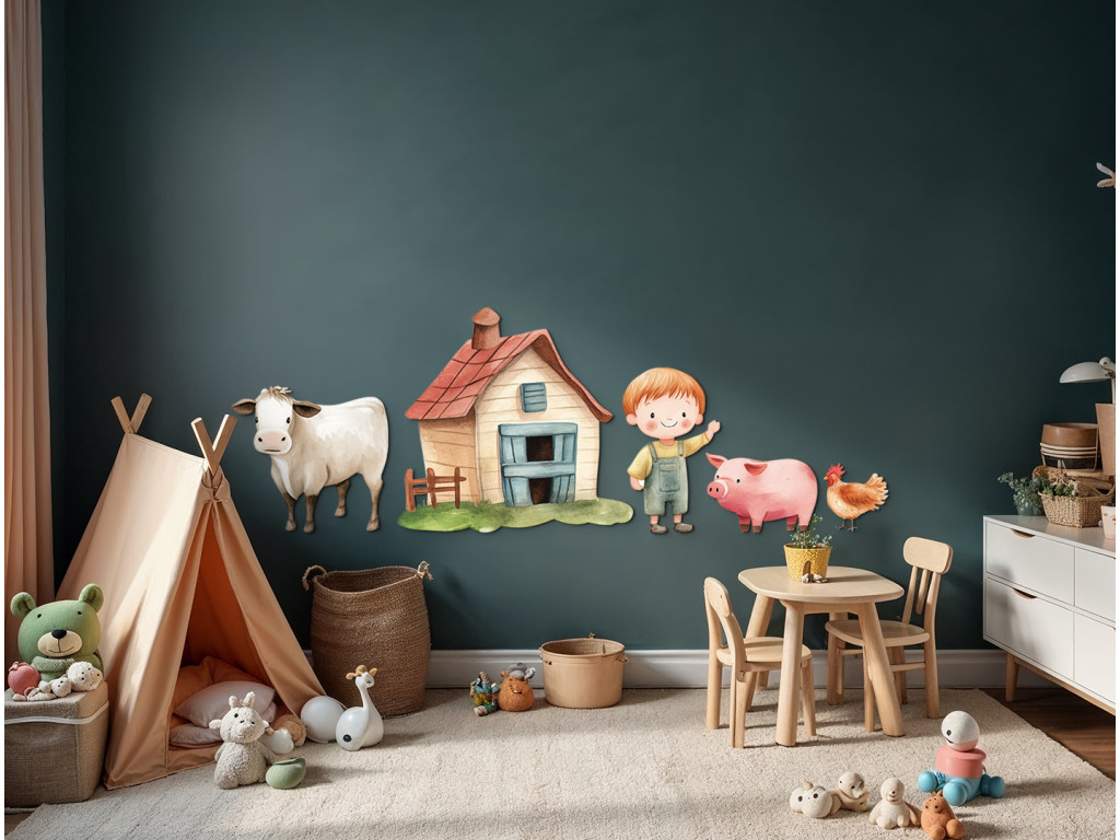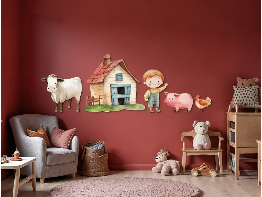 Die niedliche Illustration zeigt eine Szene auf einem Bauernhof, wo ein kleiner Junge im Overall fröhlich neben seiner Scheune winkt. Gesellschaft leisten ihm typische Bauernhoftiere – eine Kuh, ein Schweinchen und eine Henne. Das gesamte Bild wirkt warm und fröhlich und eignet sich perfekt für ein Kinderzimmer oder eine Spielecke mit Bauernhof-Thematik.