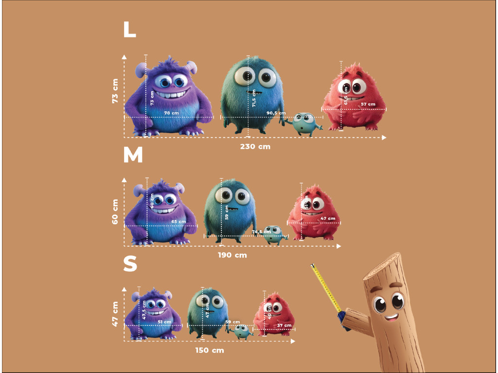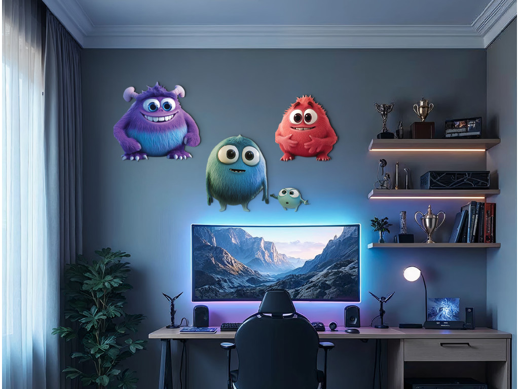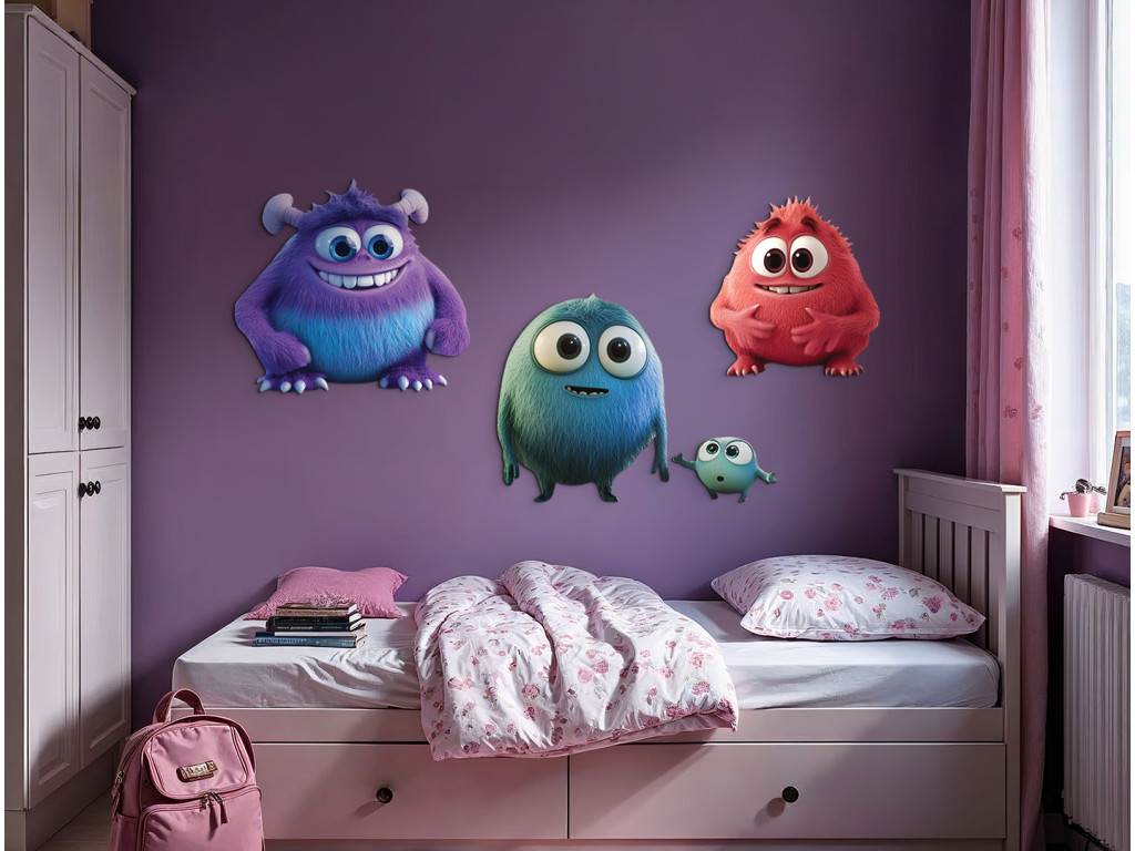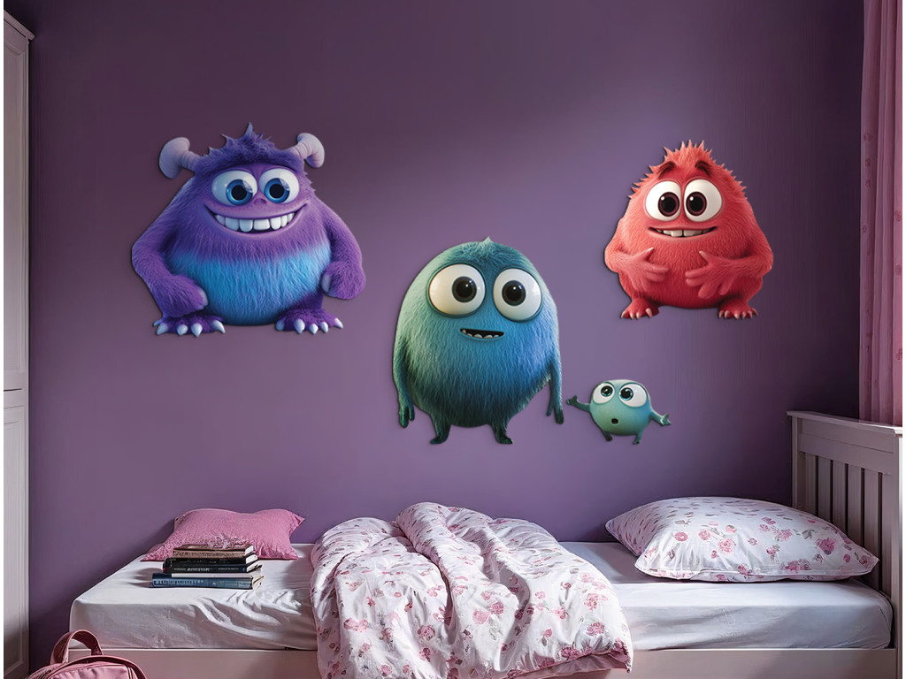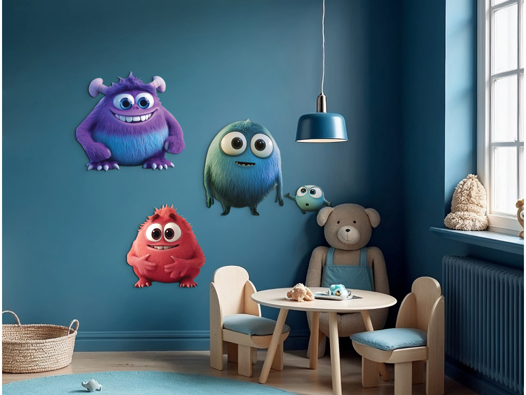 Dieses farbe Kinderbilder-Set mit Monsteraugen bringt viel Spaß und Farbe in das Kinderzimmer! Es gibt drei größere Figuren – lila, blaugrün und rot – und ein kleineres blaugrünes Monster. Das fröhliche Design im Cartoon-Stil wird Kinder begeistern und jede Wand in einen verspielten Ort voller Fantasie verwandeln.