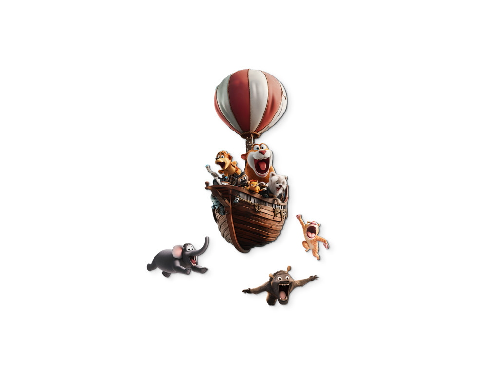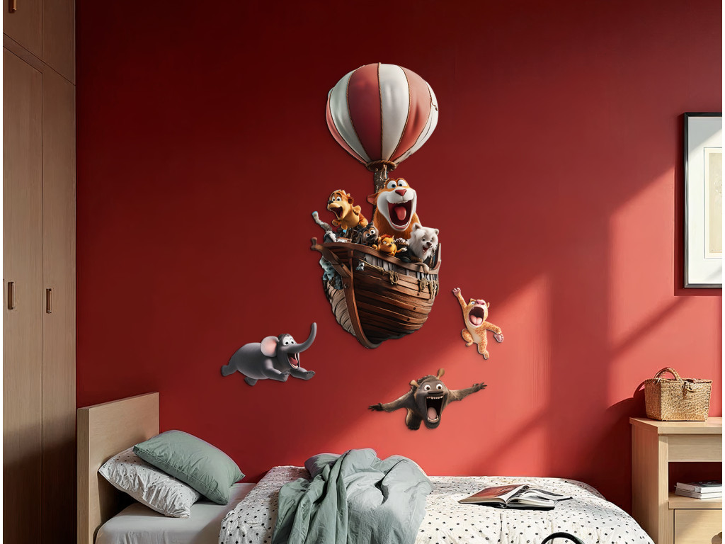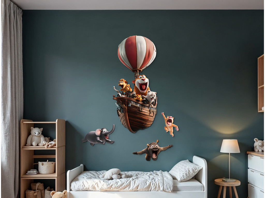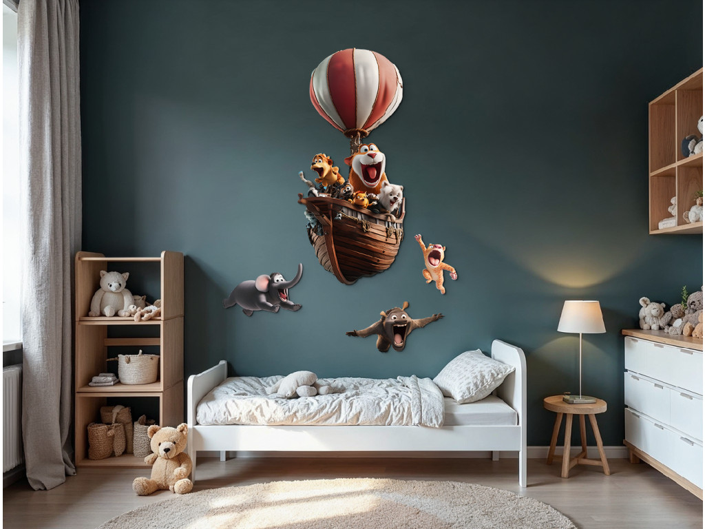 In dieser verspielten Wanddekoration fliegt ein Schiff, das an einem Ballon hoch über dem Boden hängt, voller fröhlicher Tiere auf einem Ausflug. Einige springen bereits während der Fahrt heraus, bereit, die Wolken und Abenteuer zu erkunden, die auf sie warten. Die Farben und liebevollen Details machen diese Szene zu einer unterhaltsamen und fantasievollen Dekoration für das Kinderzimmer.