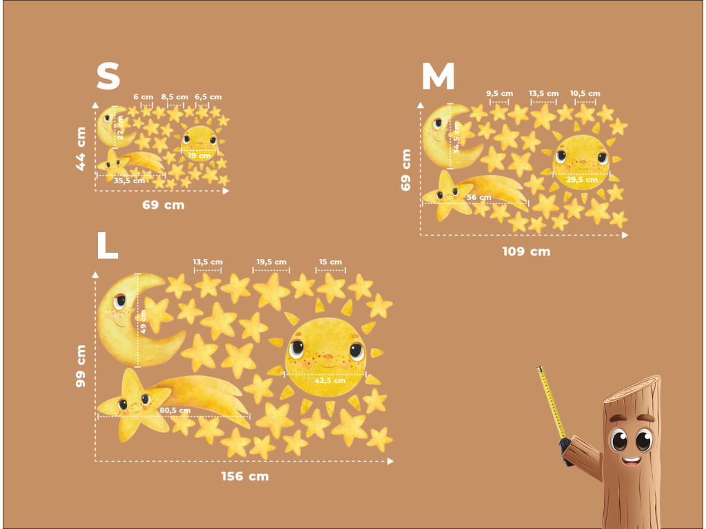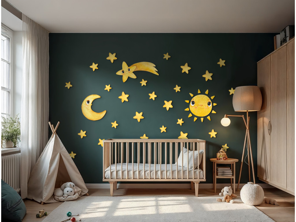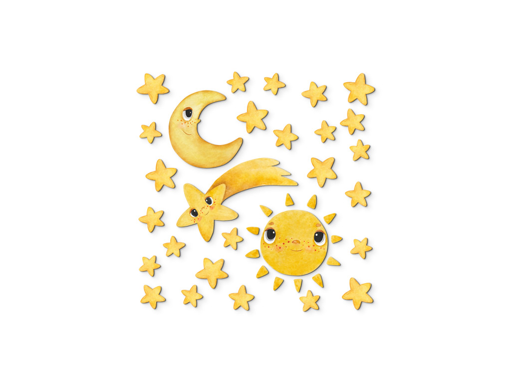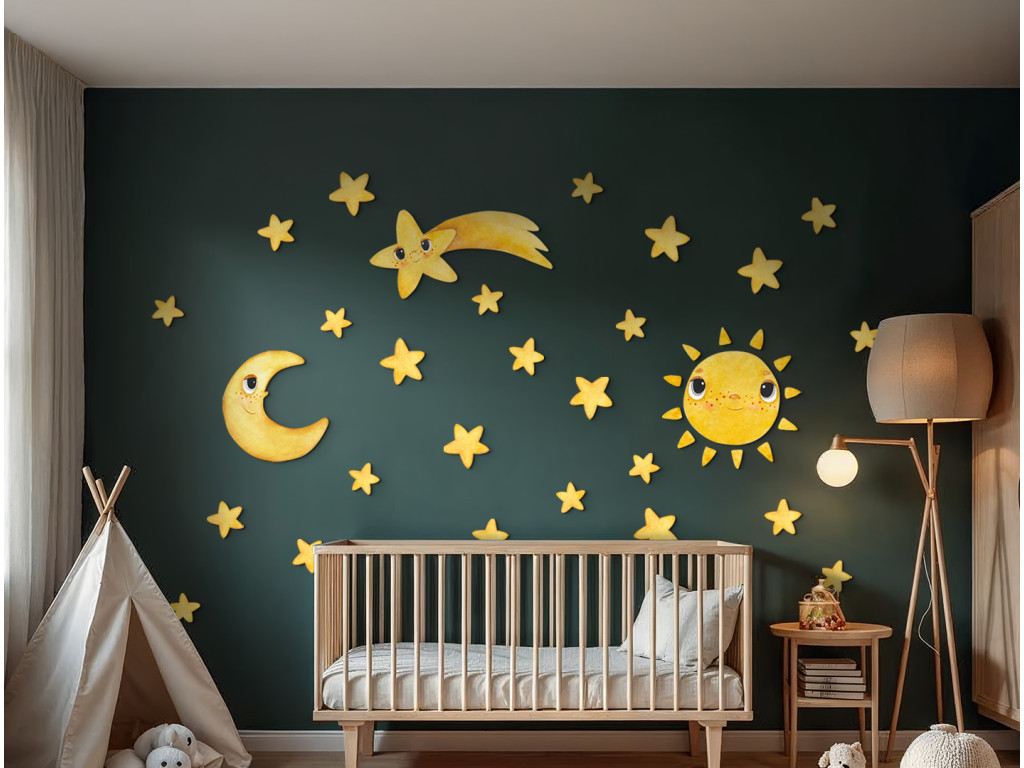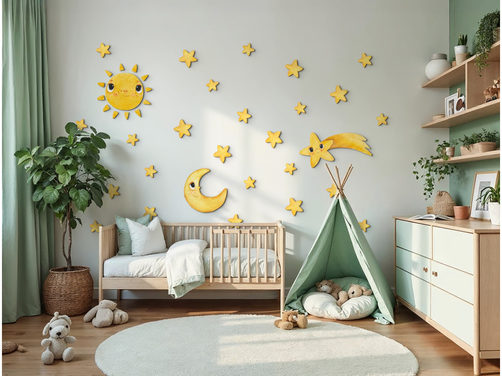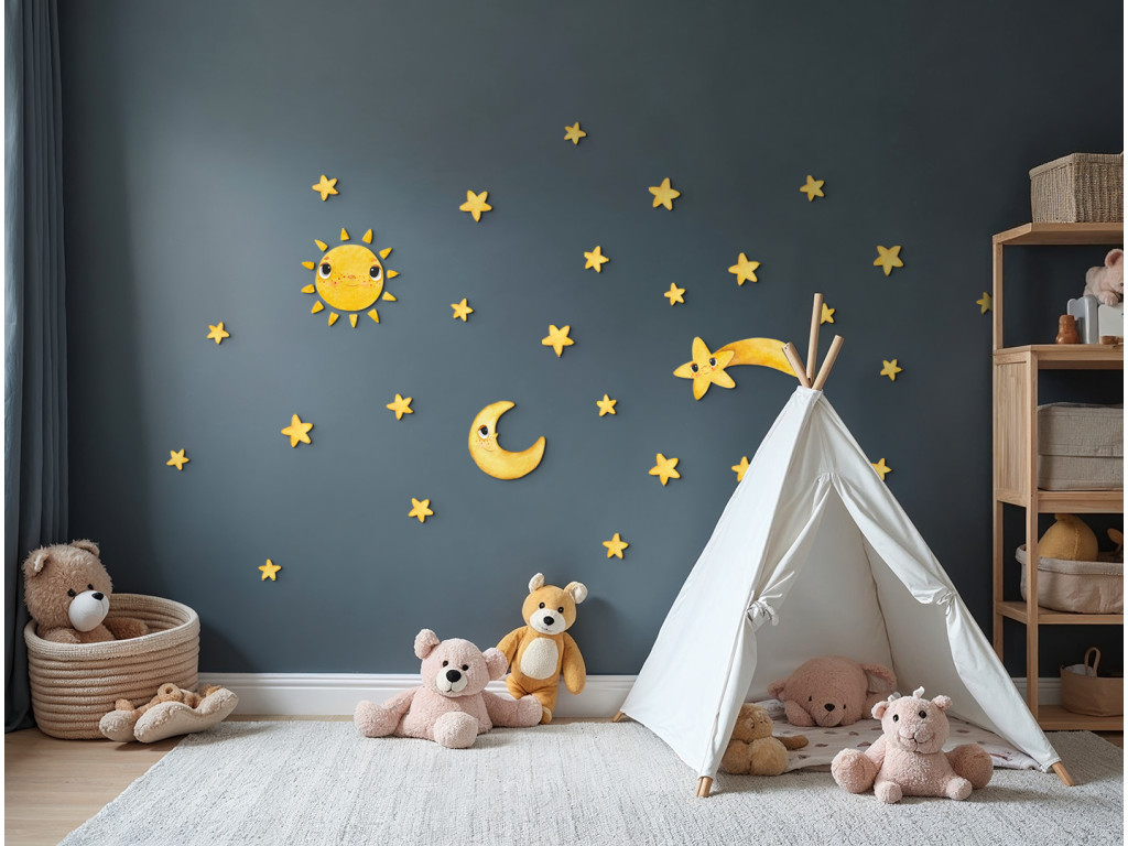Die Dekoration Lächelnde Sterne bringt den Zauber des Nachthimmels direkt ins Kinderzimmer. Verspielte Himmelskörper – ein lächelnder Halbmond, eine strahlende Sonne, eine Sternschnuppe mit Gesicht und viele gelbe Sternchen – schaffen ein friedliches und freundliches Universum. Dank der sanften Farben und dem liebenswerten Ausdruck der Figuren ist diese Dekoration ideal, um das Einschlafen am Abend angenehmer zu gestalten.