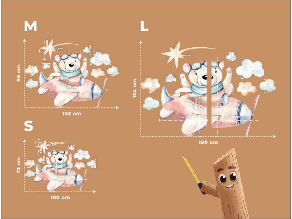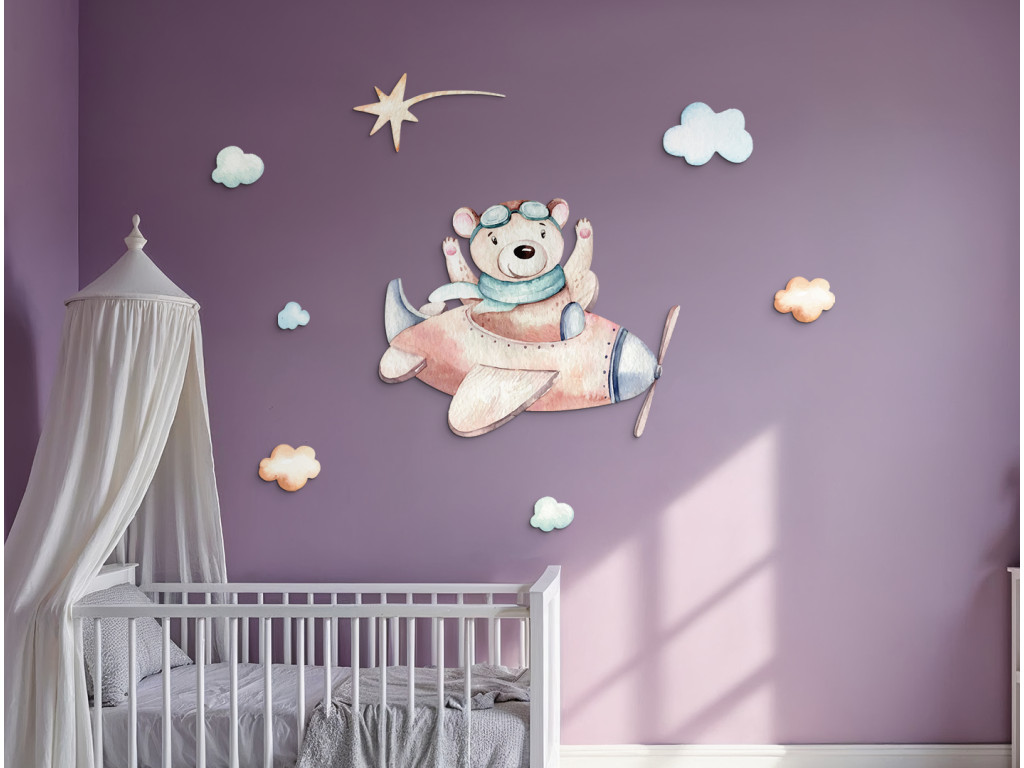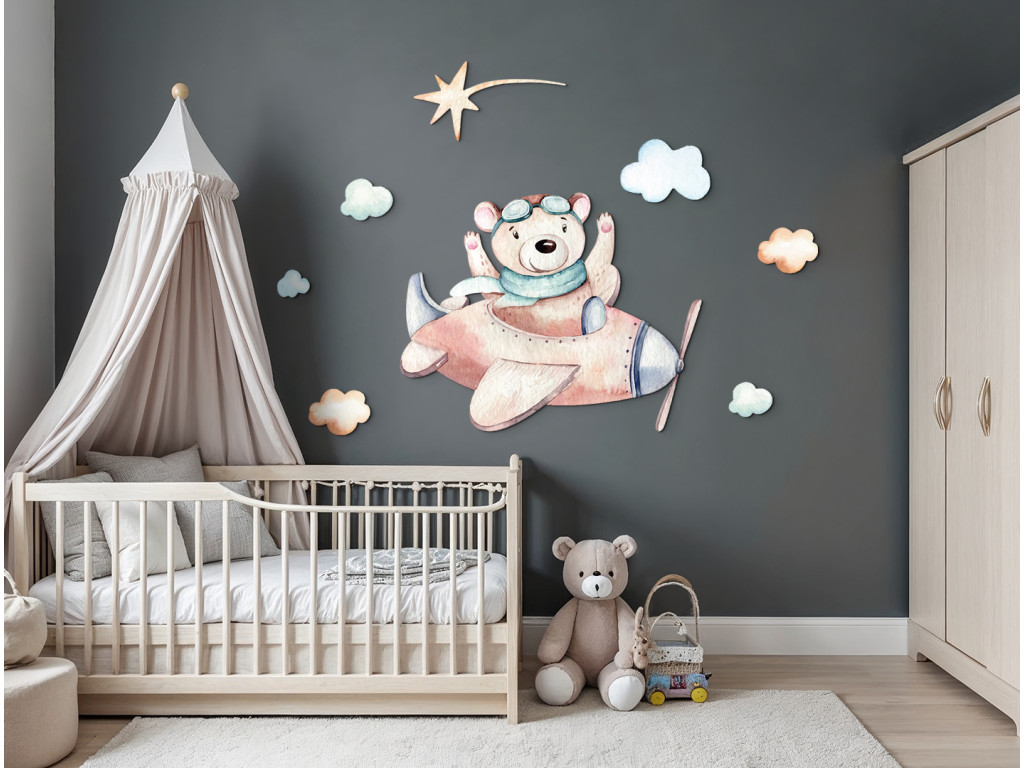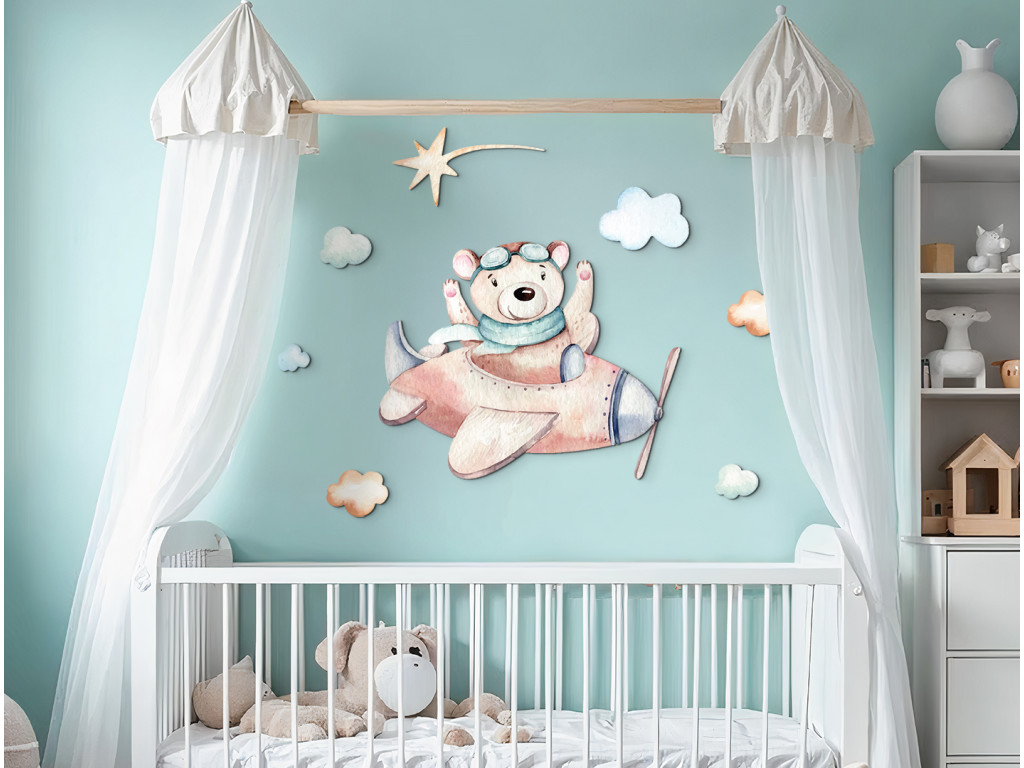 Der niedliche Cartoon-Bär fliegt in einem kleinen braunen Flugzeug über die Wolken und ist bereit für ein Abenteuer. Diese fröhliche Dekoration in sanften Farben bringt Verspieltheit und Entdeckerfreude in das Kinderzimmer.