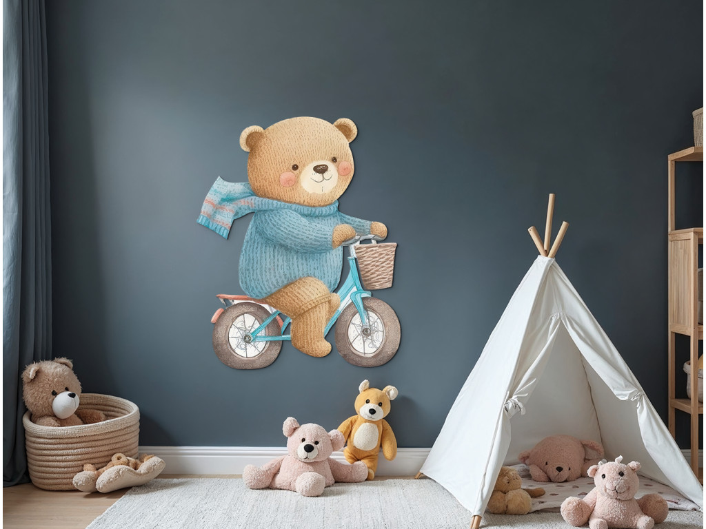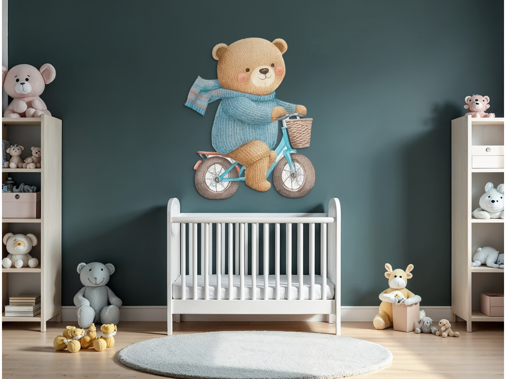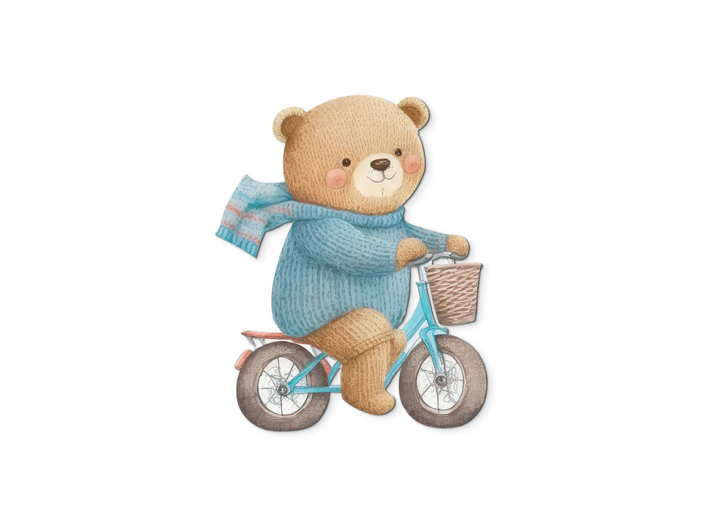 Bild eines Bären, das sich in einem stylischen blauen Pullover aufgemacht hat, die Welt mit dem Fahrrad zu entdecken. Ideal für kleine Abenteurer und Radfahrer – zumindest in der Fantasie!