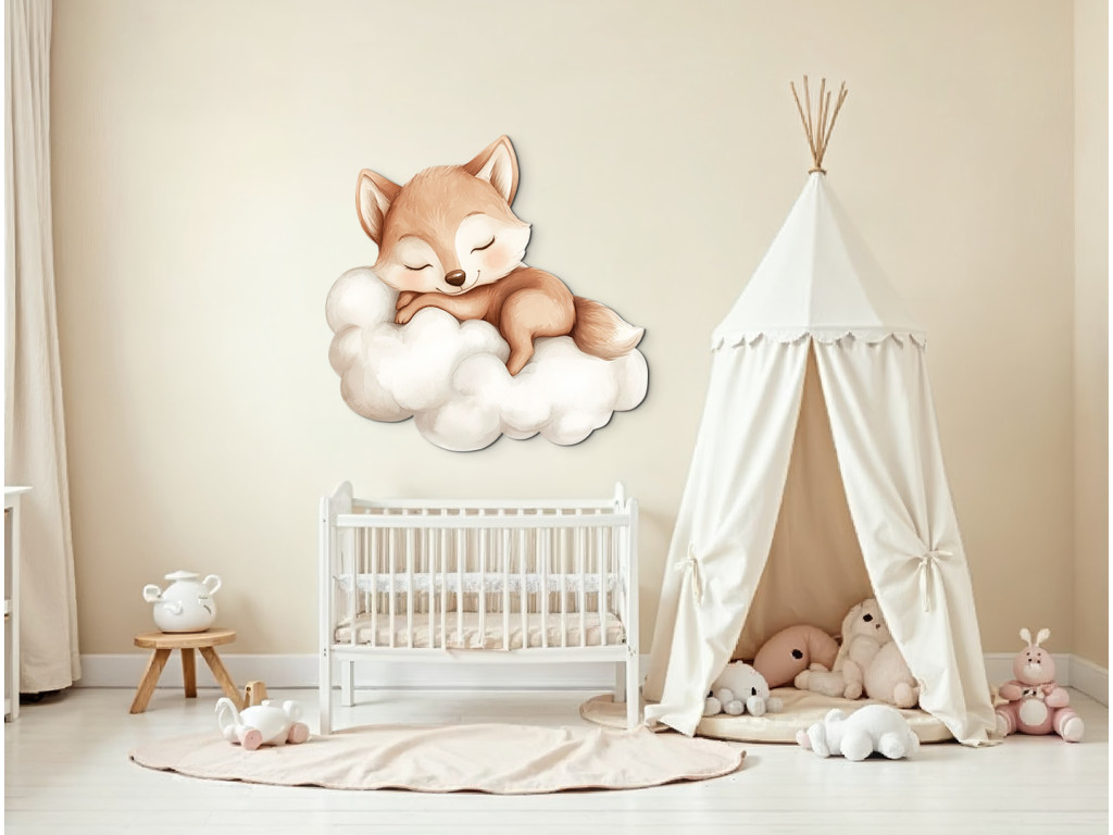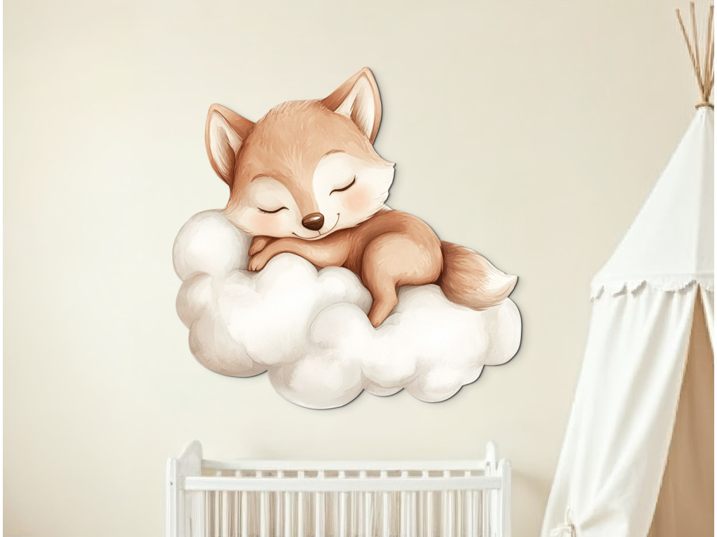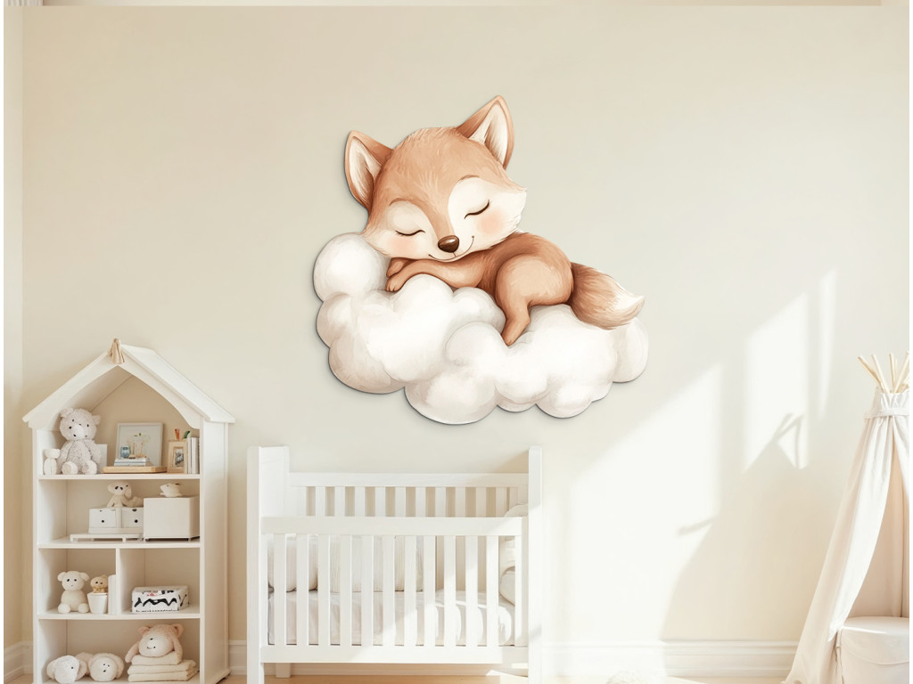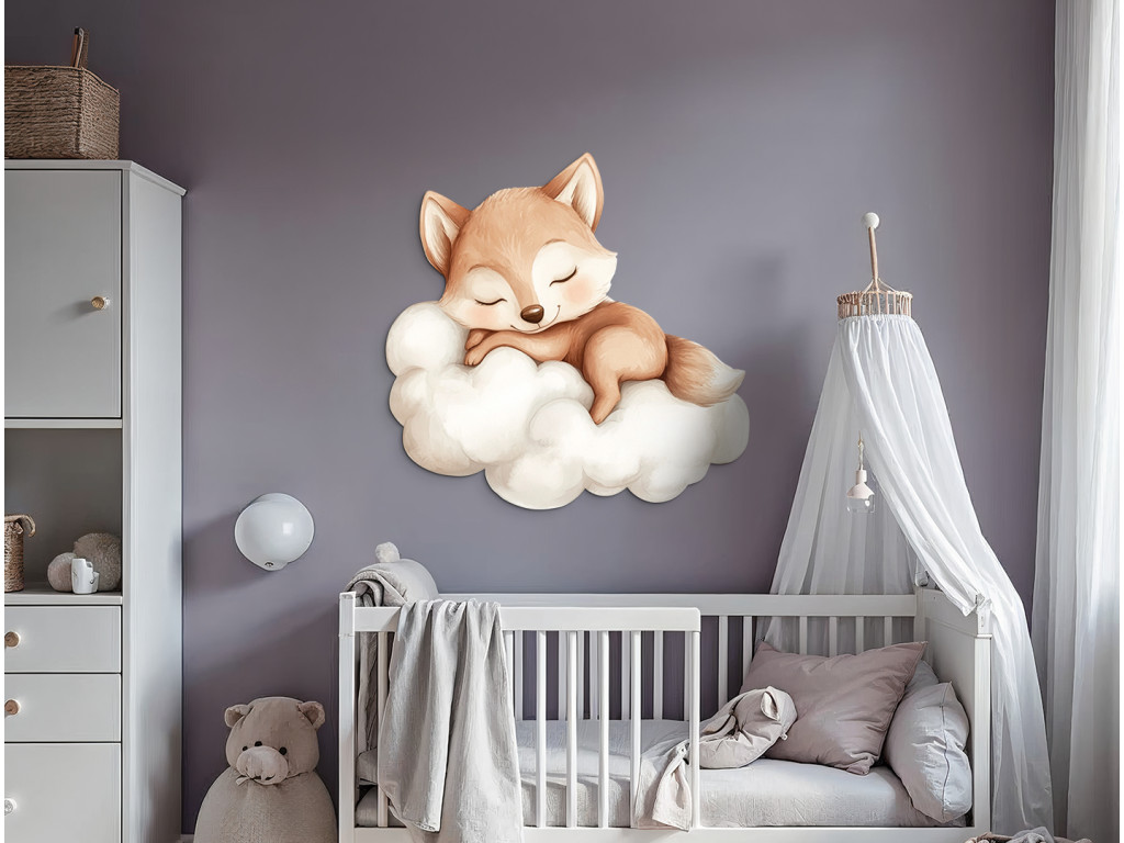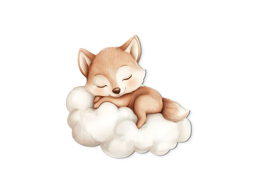 Geschlossene Augen, ein sanftes Lächeln und eine weiße Wolke unter den Pfoten... Der kleine Fuchs hat sich in seiner Traumwelt verloren. Ein Bild, das Stille, Ruhe und den Zauber eines nächtlichen Märchens in den Raum bringt.