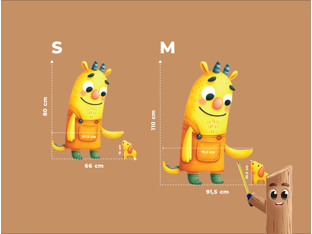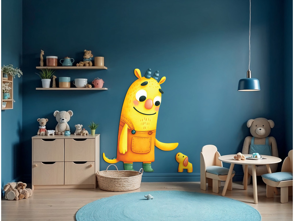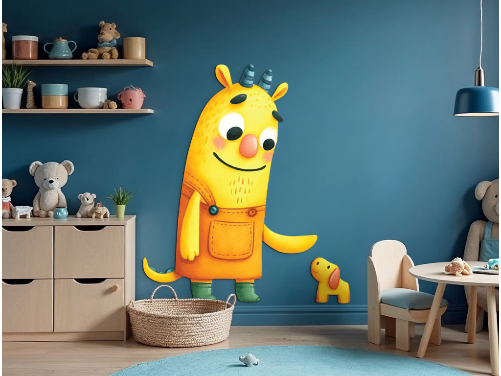 Der eine hat Hörner, der andere einen Schwanz – und doch mögen sie sich. Die gelbe Figur schaut lächelnd auf den Welpen, der vielleicht gerade seinen besten Freund gefunden hat. Ein Bild, das eine stille Geschichte der Freundschaft erzählt.