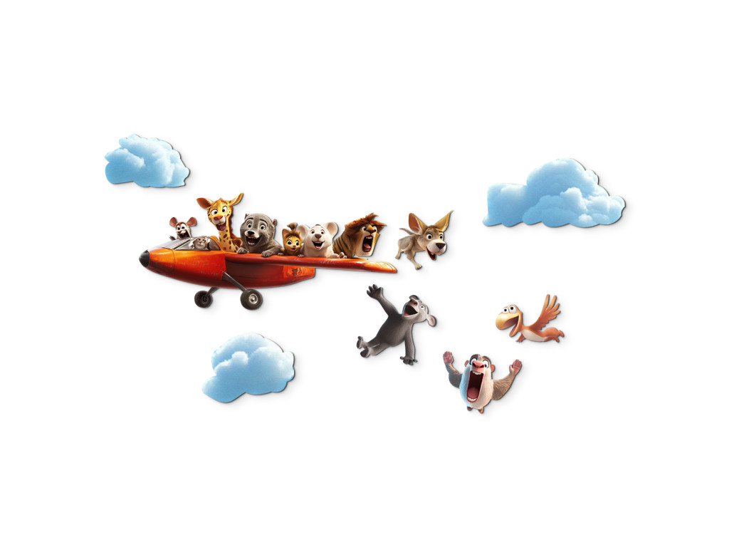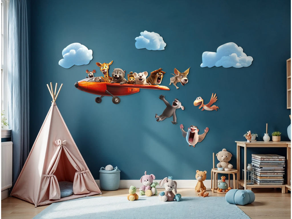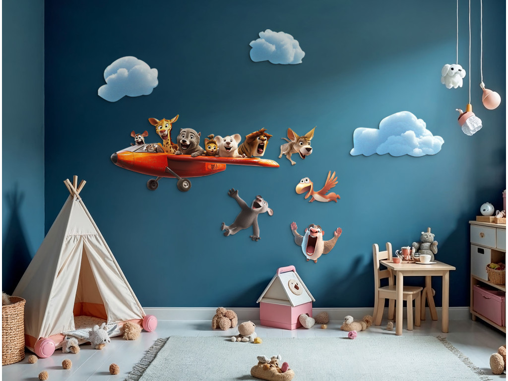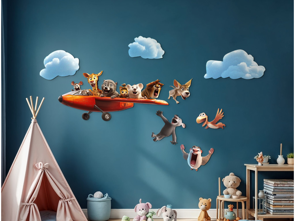 Eine fröhliche Zeichentrickszene mit einem roten Flugzeug, das zwischen den Wolken fliegt und eine bunte Gruppe von Tieren transportiert. Die farbenfrohe und verspielte Animation bringt Freude, Fantasie und Abenteuerlust in das Kinderzimmer. Eine großartige Wahl für kleine Entdecker und Tierliebhaber.