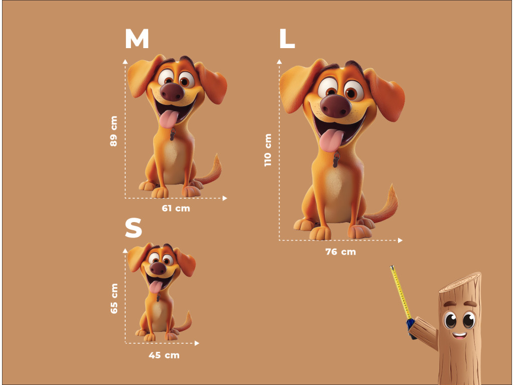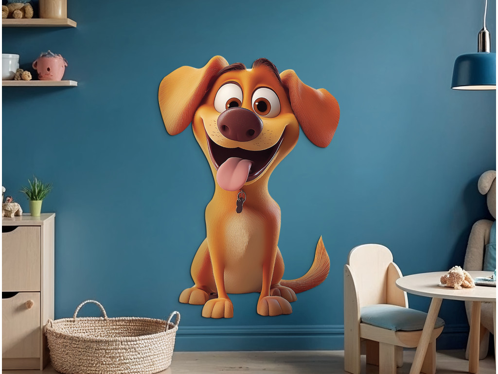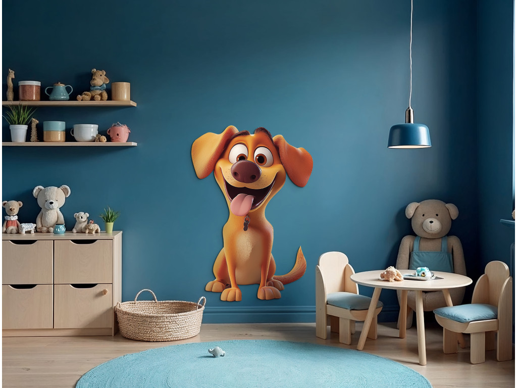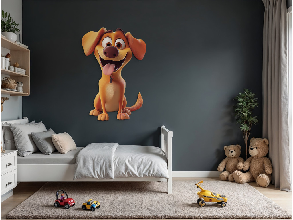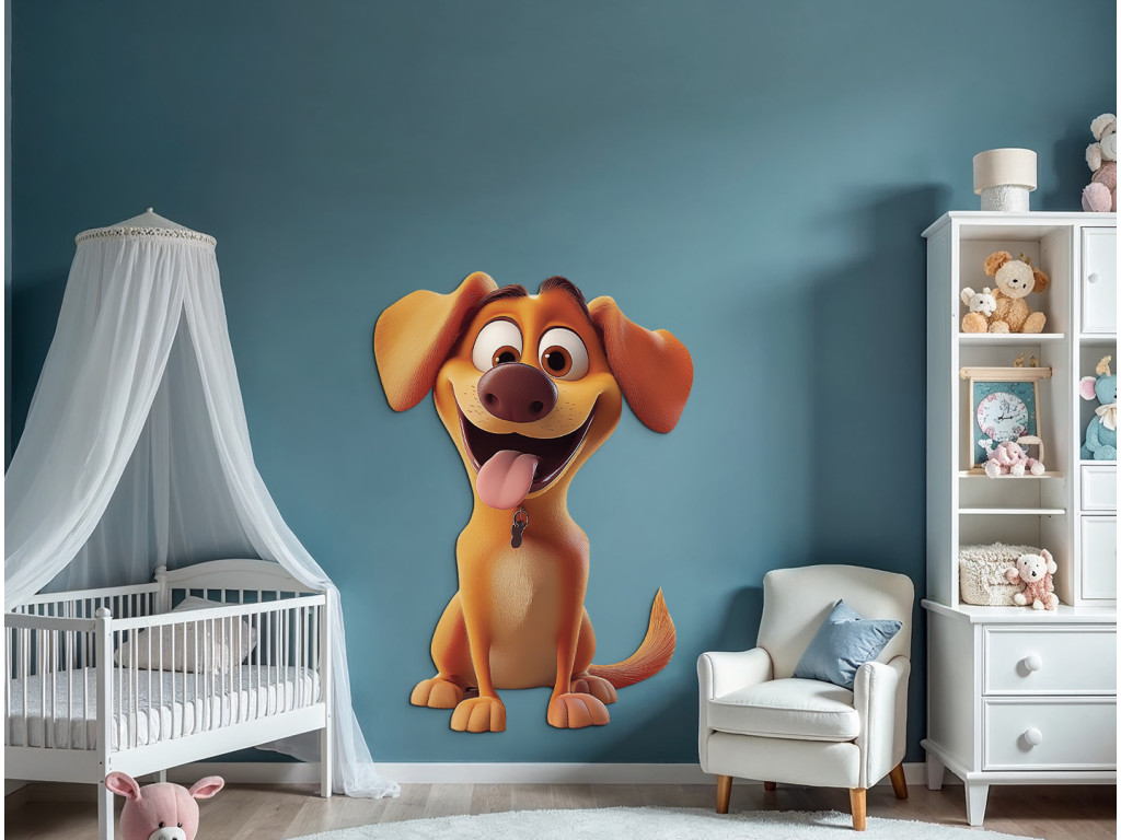 Der niedliche Hund Bodi mit herausgestreckter Zunge und nach oben gerichteten Ohren strahlt Freude und Verspieltheit aus. Diese hübsche Dekoration bringt Fröhlichkeit und Gemütlichkeit ins Kinderzimmer – gedruckt auf einer festen Platte und in Form geschnitten.