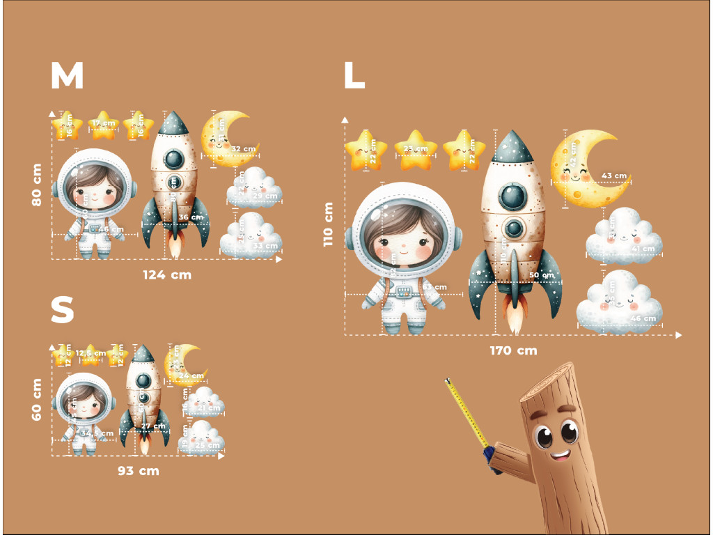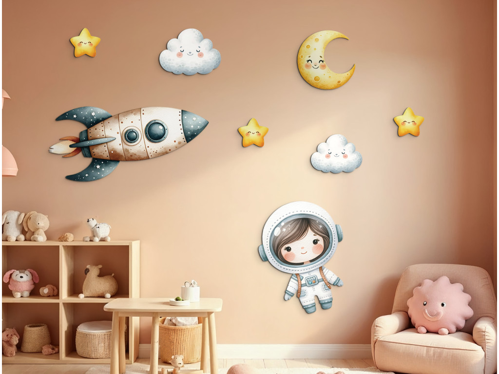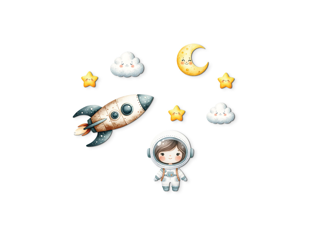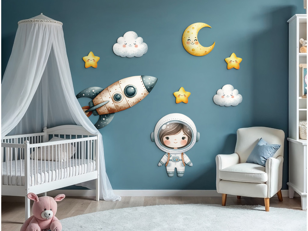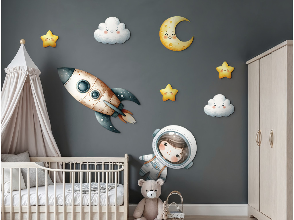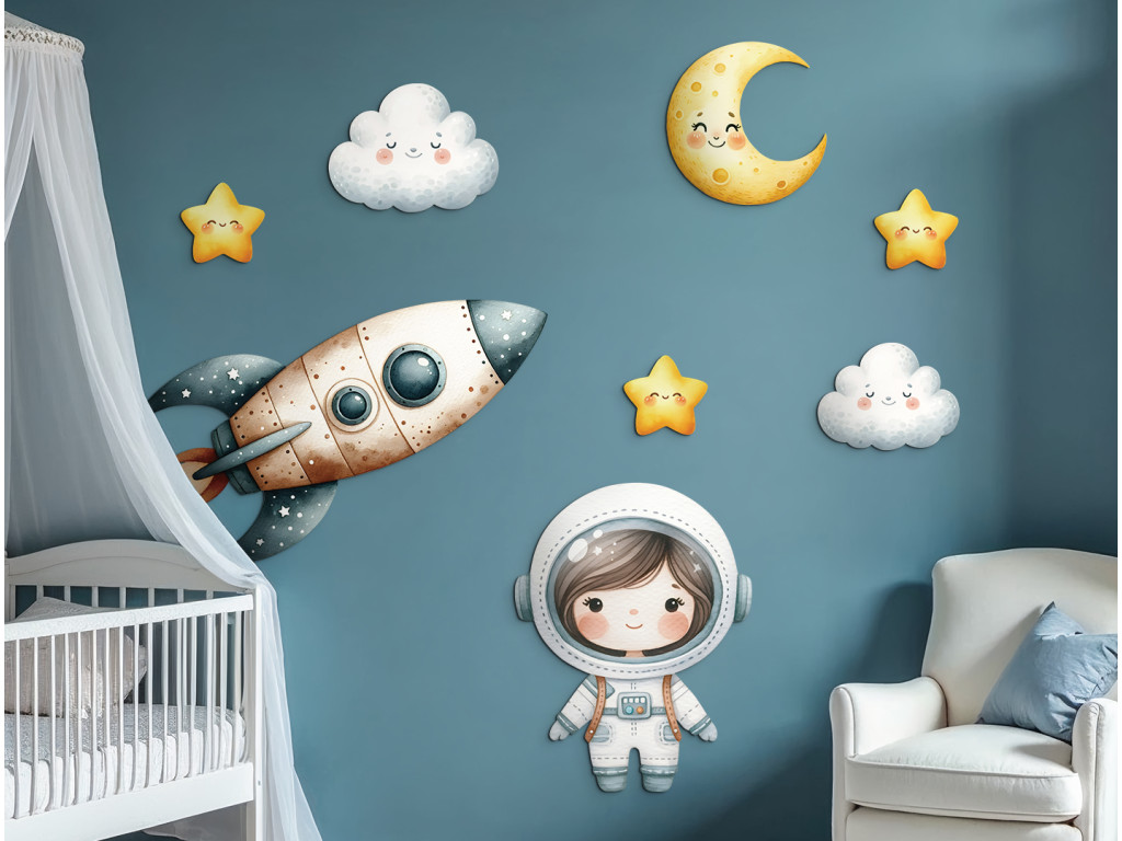 Die Dekoration zeigt eine große gezeichnete Rakete in der Mitte der Komposition, umgeben von fröhlichen gelben Sternen und lächelnden Wolken. Der Mond mit seinem freundlichen Lächeln verleiht der Szene einen verspielten und zarten Charakter, und die kleine Kosmonautin im Raumanzug ist bereit, das Weltall zu entdecken und neue Abenteuer zu erleben. Das Motiv in sanften, fröhlichen Farben ist ideal, um ein Mädchenzimmer gemütlicher und heller zu gestalten.