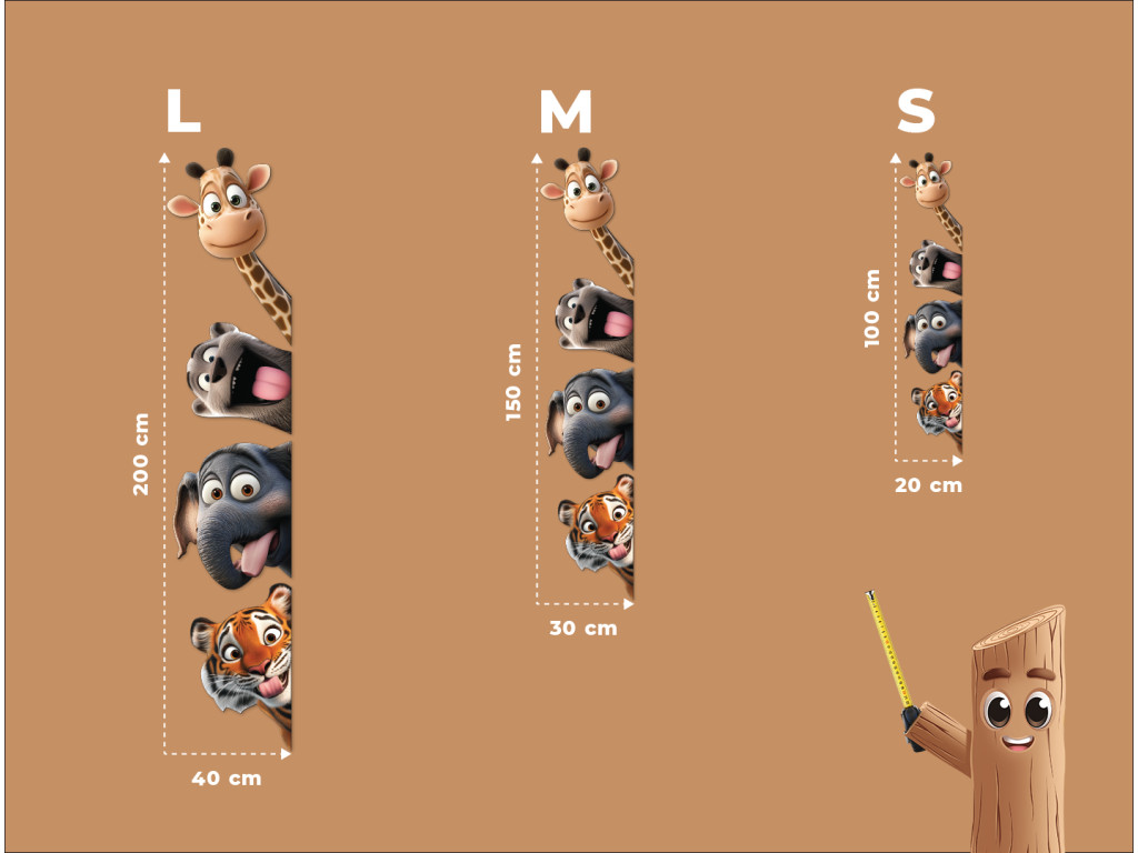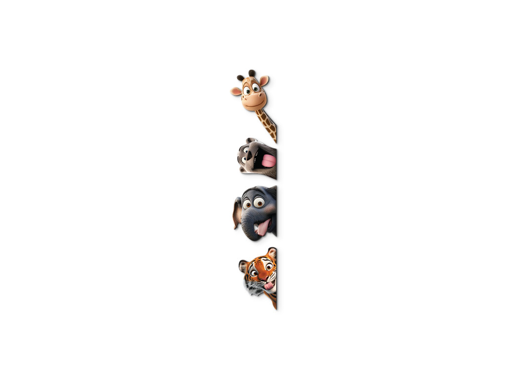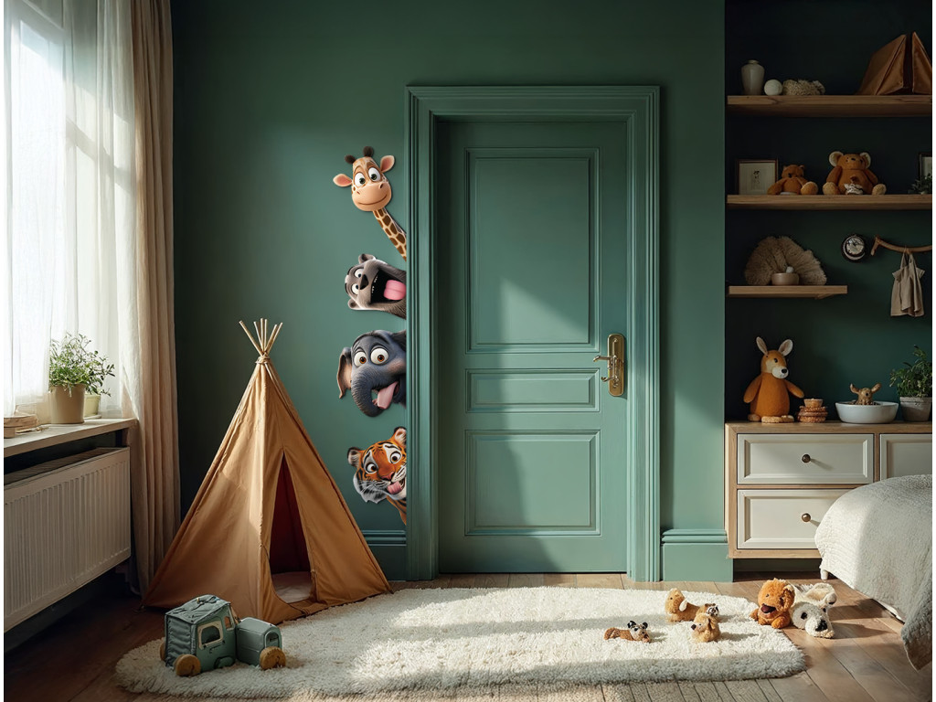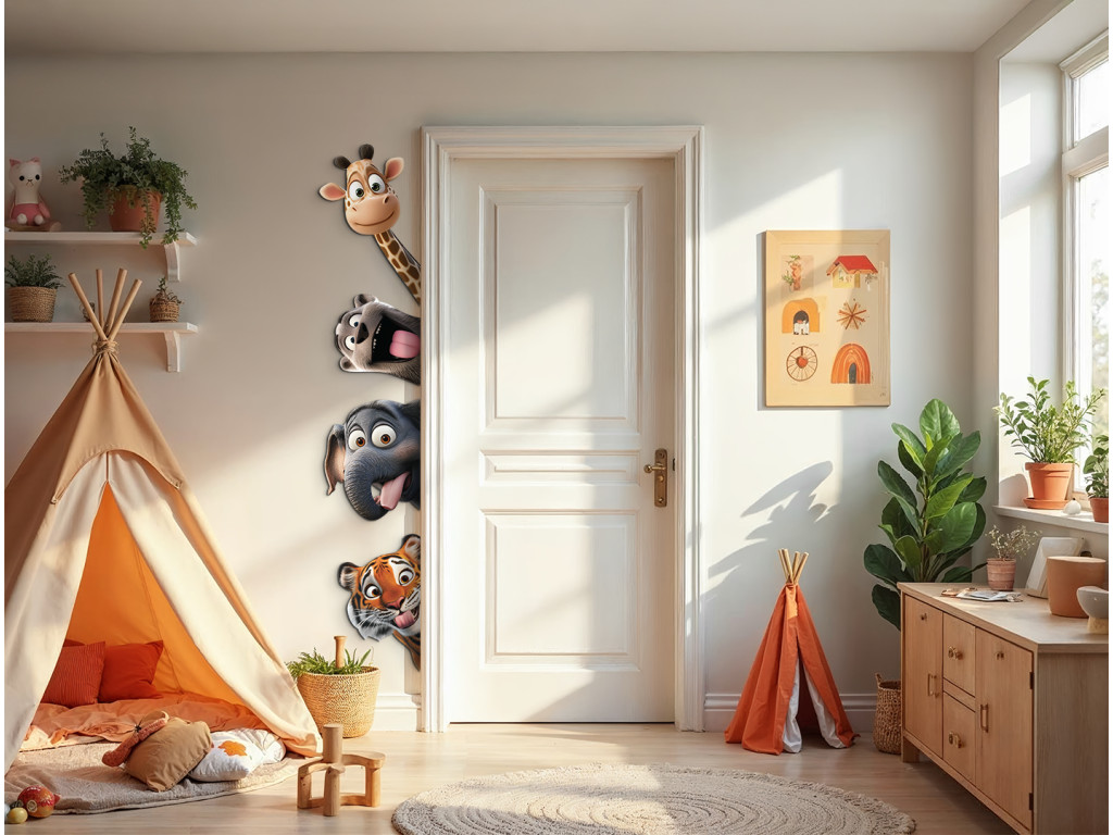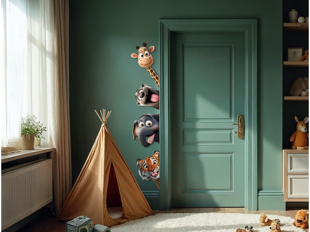 Eine verspielte Wanddekoration, auf der fröhliche Tiere beispielsweise hinter Türen mit verrückten Gesichtsausdrücken und herausgestreckten Zungen hervorschauen. Eine ideale Ergänzung für Kinderzimmer, die mit ihrem lustigen und farbenfrohen Motiv für gute Laune sorgt und den Raum belebt.