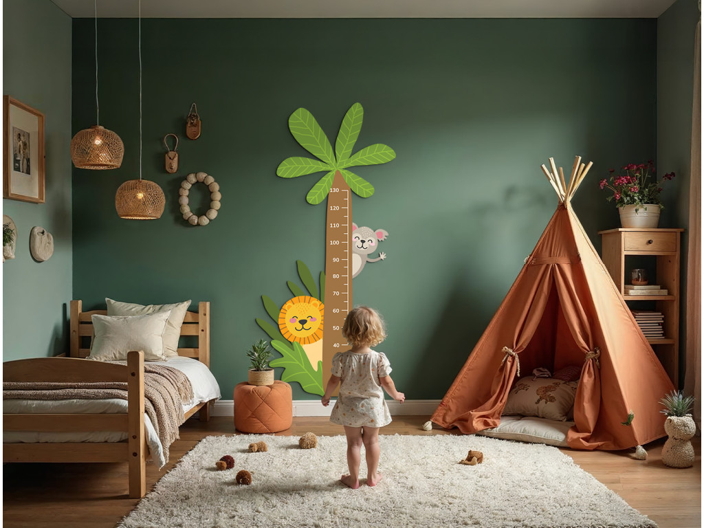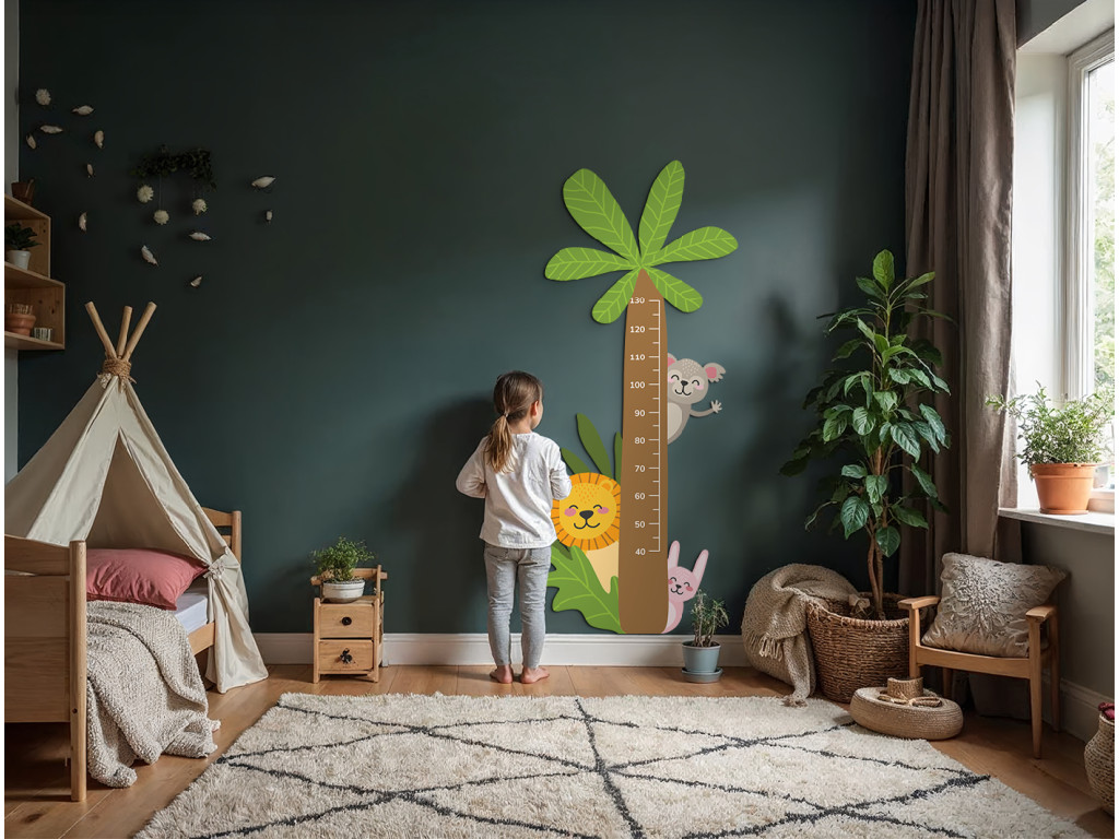 Das Kinder-Wandmaßband mit Dschungelmotiv bringt fröhliche Stimmung ins Kinderzimmer voller Tiere wie Löwe, Koala oder Hase. Das farbenfrohe Design mit Palme begeistert Kinder und dient gleichzeitig als praktische Dekoration. Mit einer Höhe von bis zu 130 cm eignet es sich ideal, um die ersten Wachstumsjahre Ihres Kindes zu verfolgen.