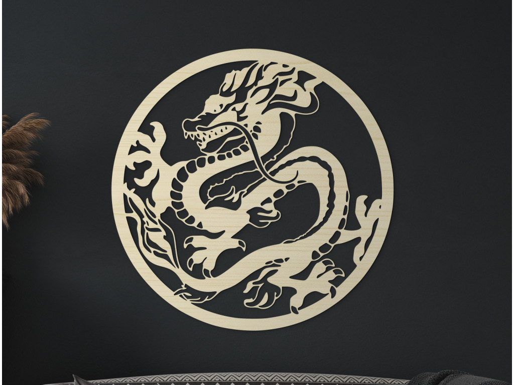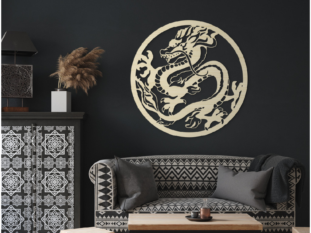 Der runde Holzsticker Drache zeigt einen eleganten chinesischen Drachen mit anmutigen Kurven und reichen Details. Sein traditionelles Design und seine unverwechselbaren Formen verleihen dem Raum einen authentischen orientalischen Touch. Ideal für alle, die ihrem Raum einen Hauch von kultureller Eleganz und Mystik verleihen möchten.