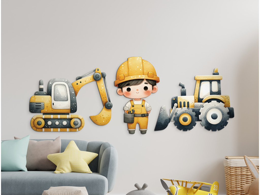 Das Set mit Wandstickern für Kinder mit dem Motiv Baustelle bringt Energie und Verspieltheit in das Zimmer. Es enthält einen gelben Bagger, einen robusten Bulldozer und die Figur eines Bauarbeiters, der bereit für die Arbeit ist. Die gedämpften Gelb- und Grautöne passen gut zur Kinderzimmerausstattung und regen die kreative Fantasie der kleinen Baumeister an.