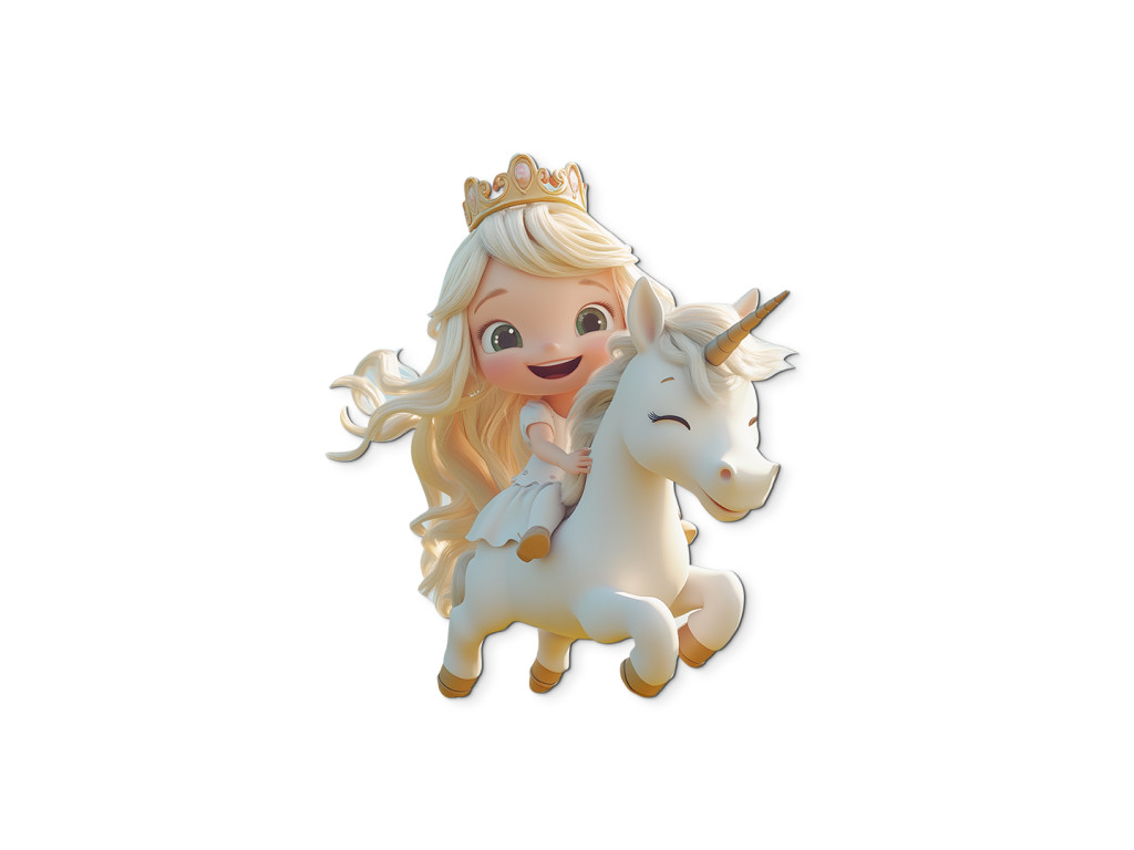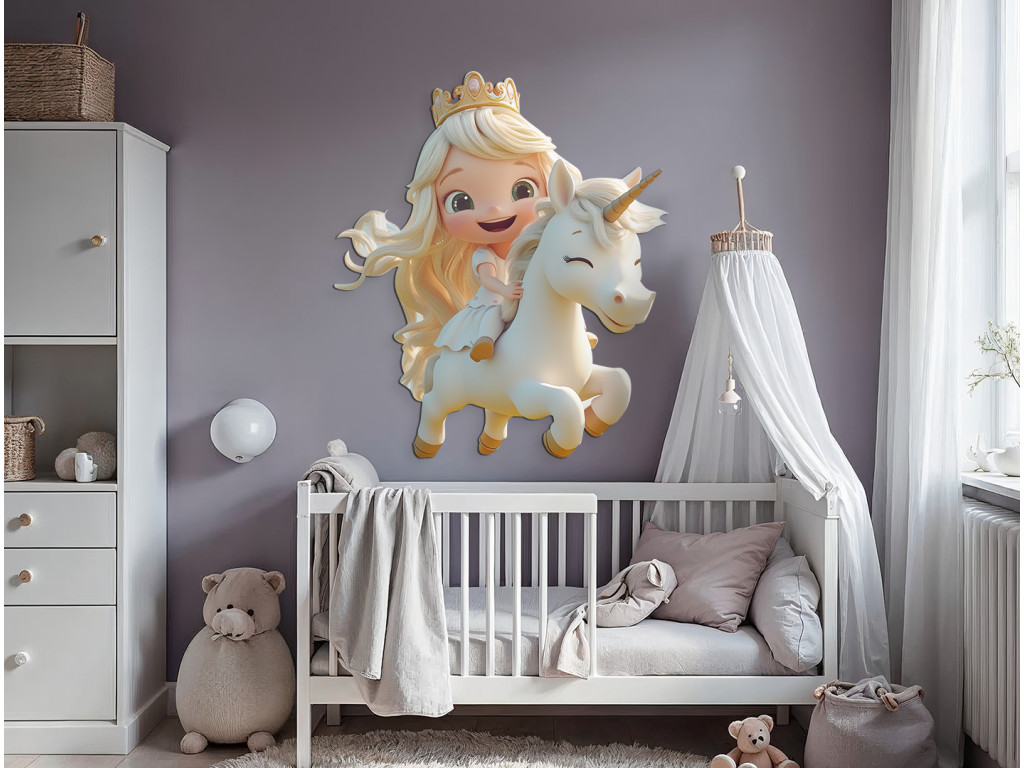 Goldlöckchen galoppiert mit einem Lächeln auf ihrem weißen Einhorn durch das Land der Träume. Dieses Bild strahlt Freude, den Zauber der Kindheit und die Schönheit eines Märchens aus – die ideale Ergänzung für ein Mädchenzimmer.