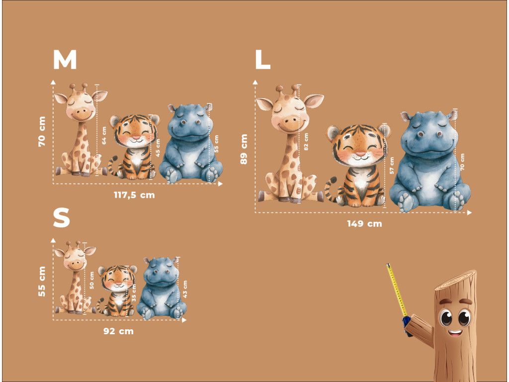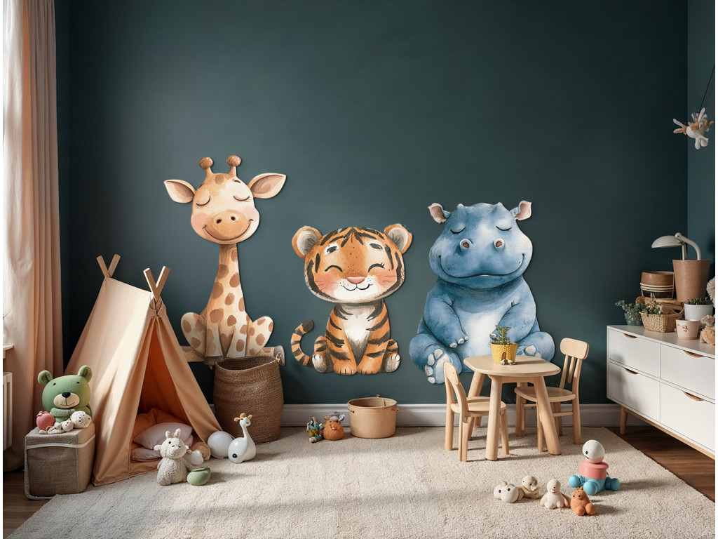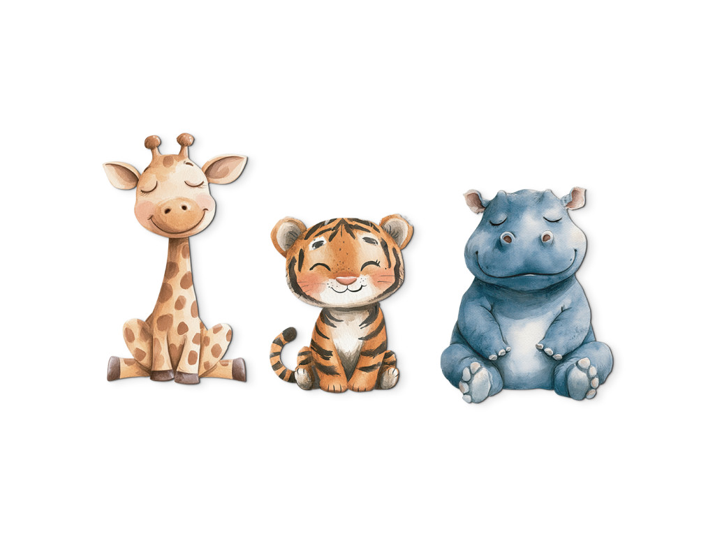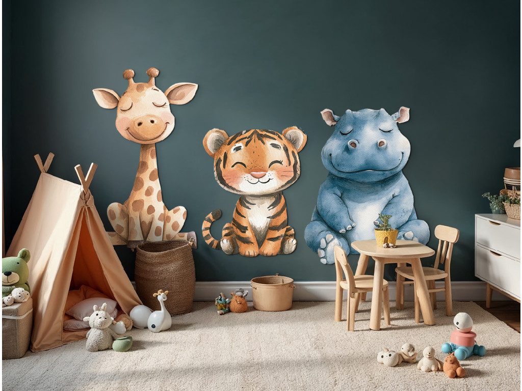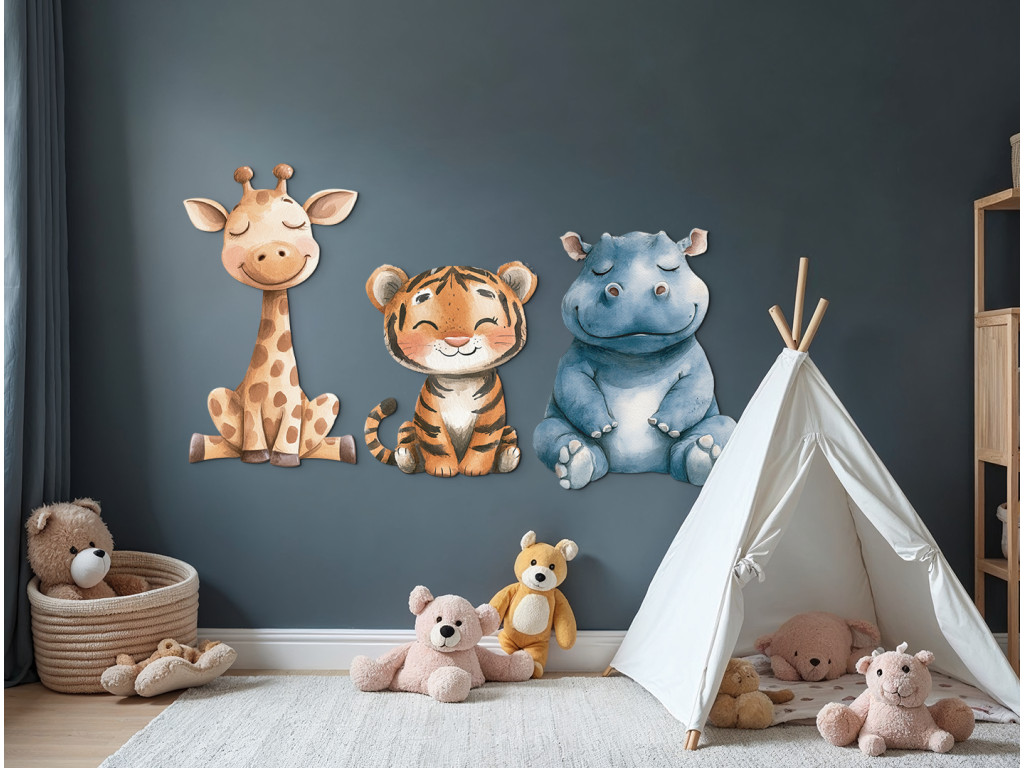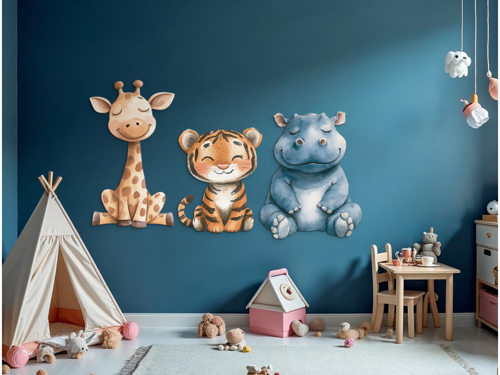Dieses fröhliche Trio bringt Gemütlichkeit, Farben und einen Hauch von Exotik in das Kinderzimmer. Das ideale Bild oder die ideale Formdekoration für die Freunde von Tieren aus aller Welt.
