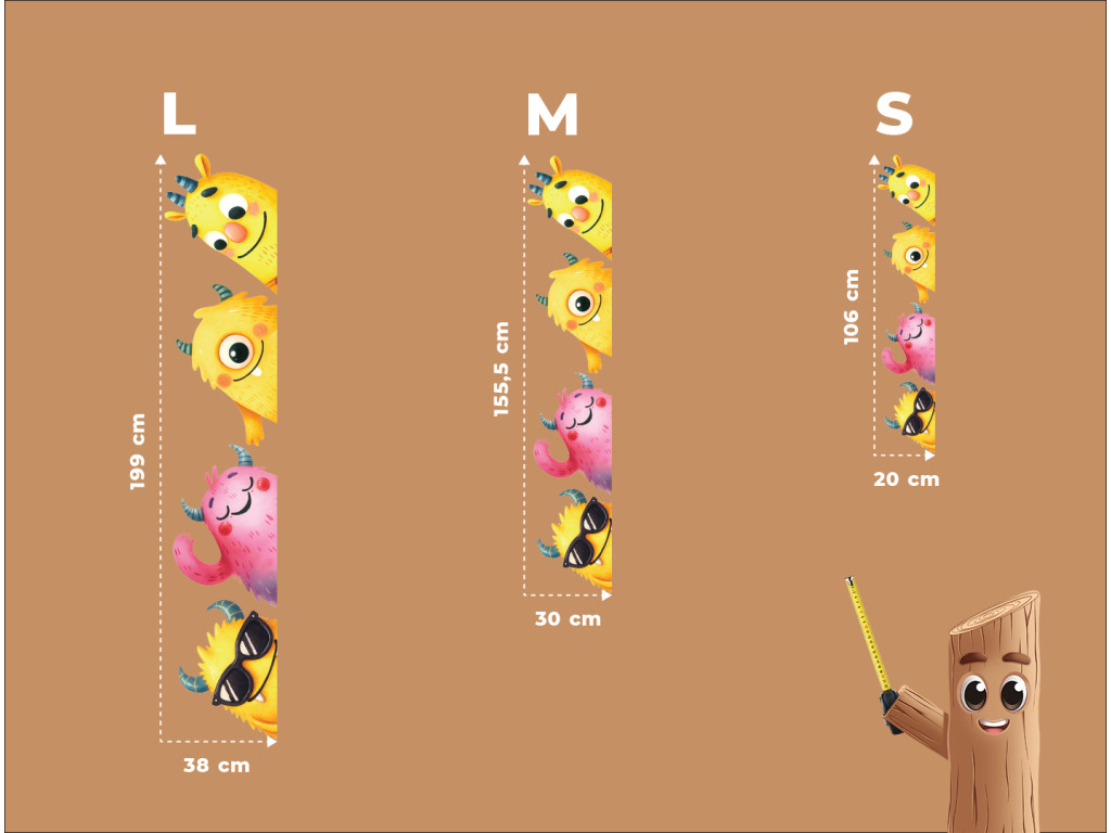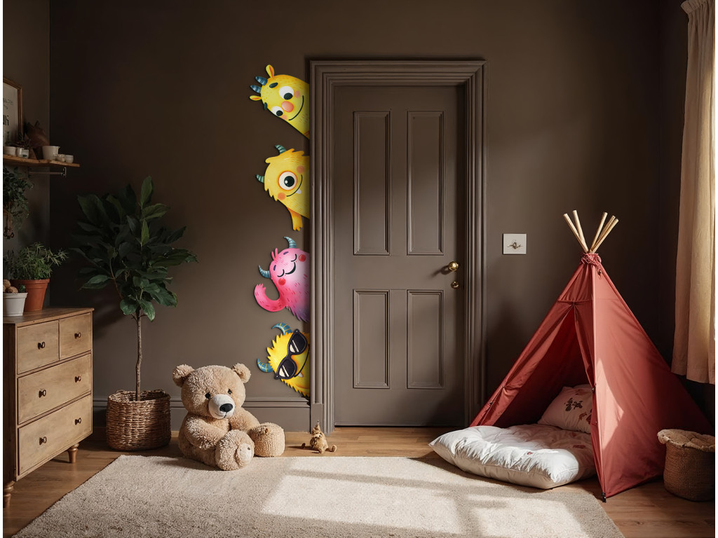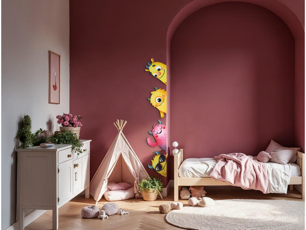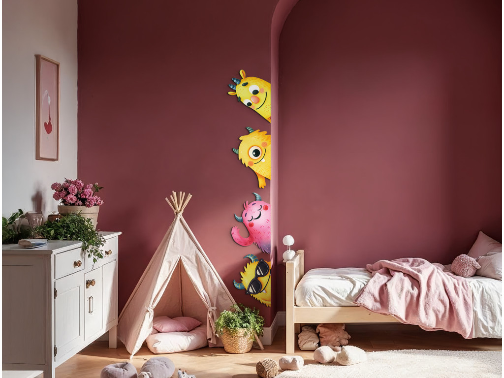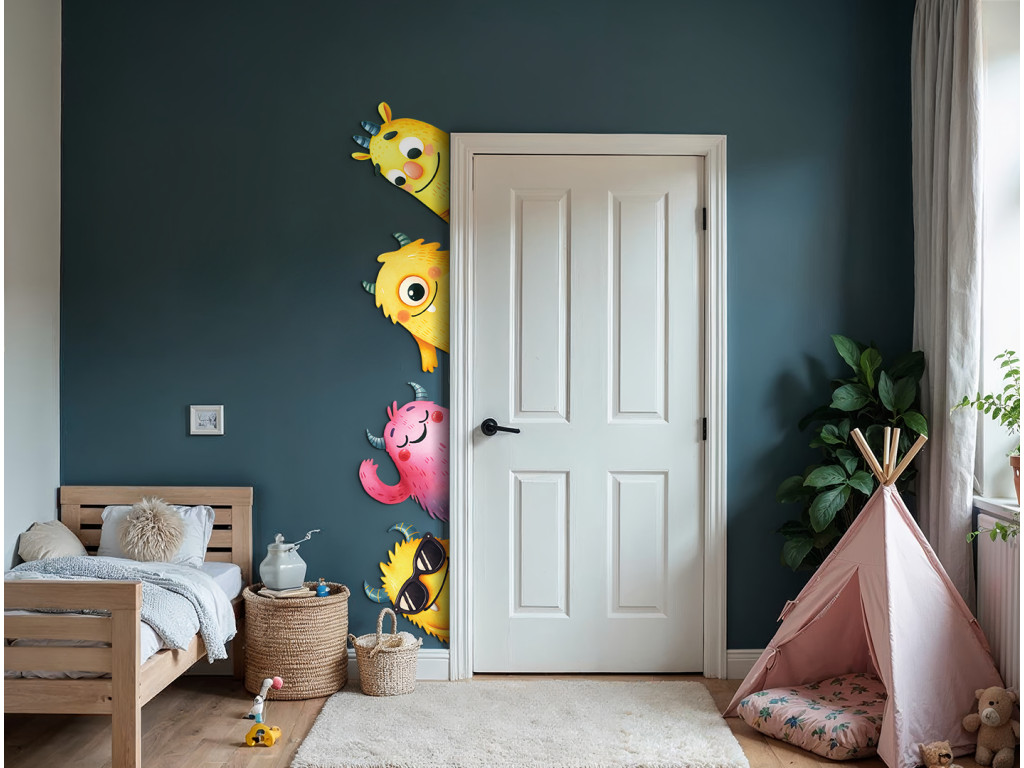 Ein fröhliches Set aus Stickern mit bunten Monstern in Gelb- und Rosatönen bringt Verspieltheit und Spaß ins Kinderzimmer. Die Figuren sind so gestaltet, dass sie neugierig hinter der Tür oder aus der Ecke des Zimmers hervorschauen.