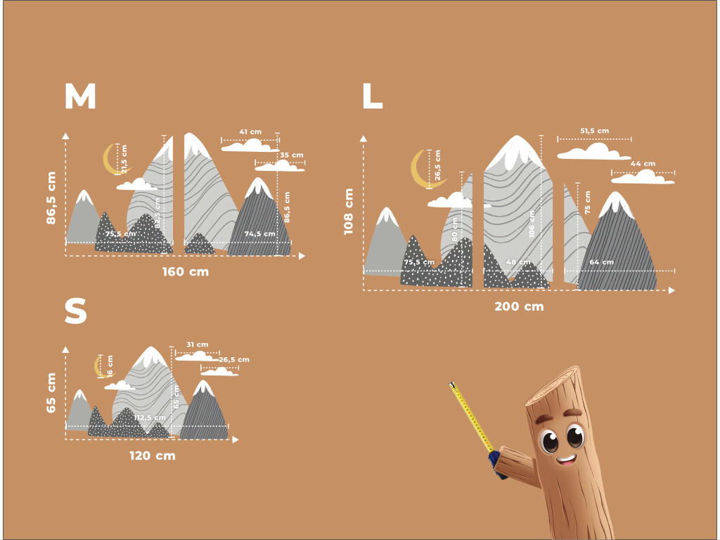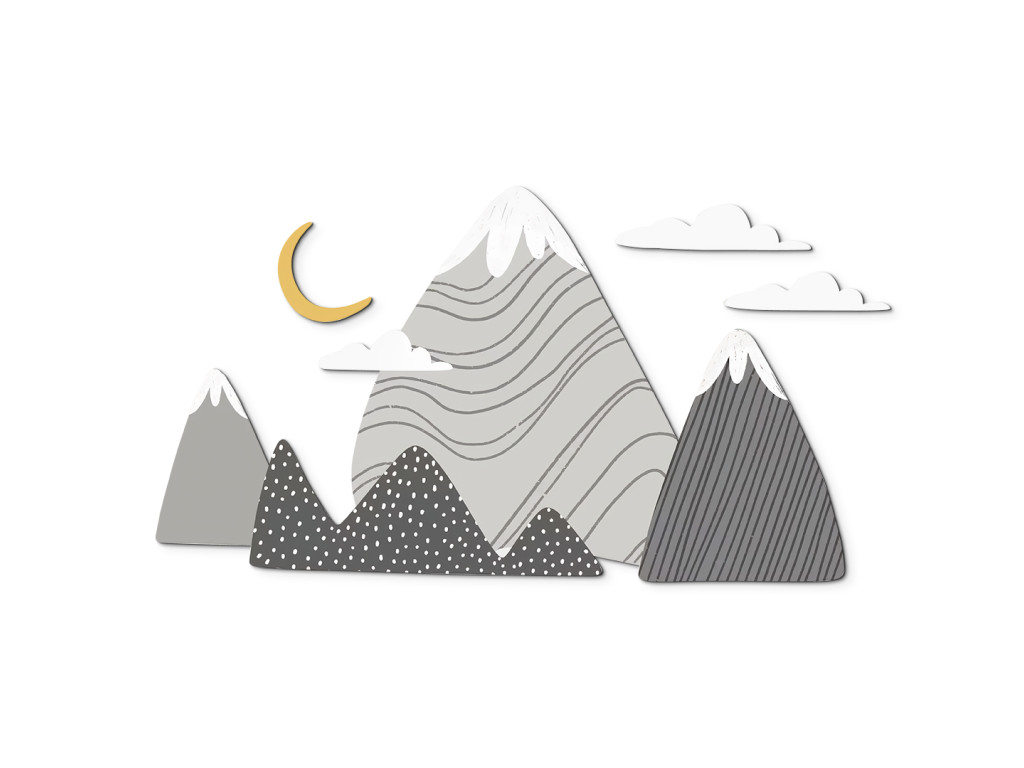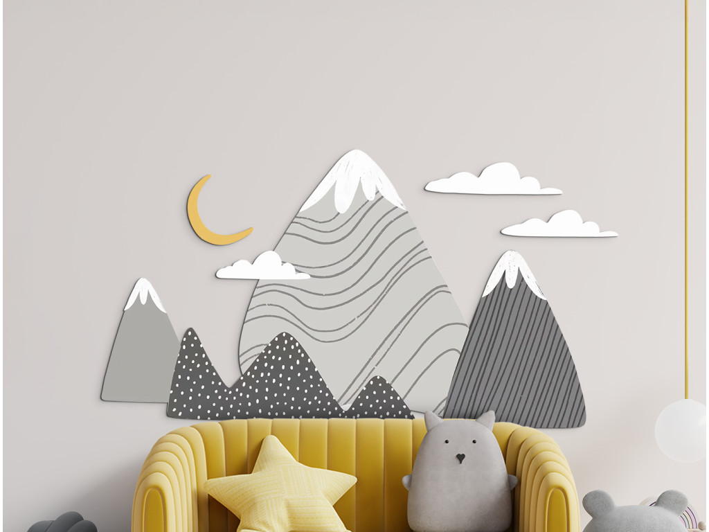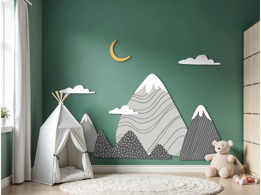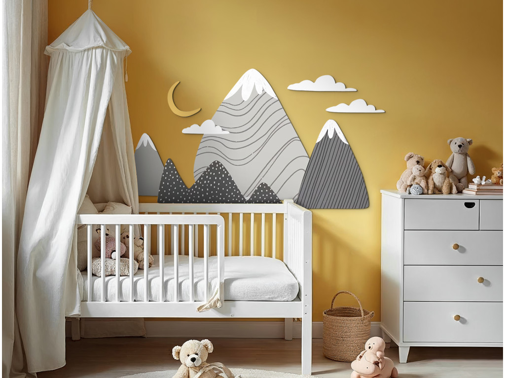 Die Dekoration Graue Gipfel bringt ruhige Naturtöne in Grau in das Kinderzimmer. Zart geformte Berge mit schneebedeckten Gipfeln und dezenten Mustern schaffen eine harmonische Kulisse, die beruhigt und inspiriert. Weiße Wolken und ein gelber Halbmond über den Bergen vervollständigen die traumhafte Atmosphäre.
