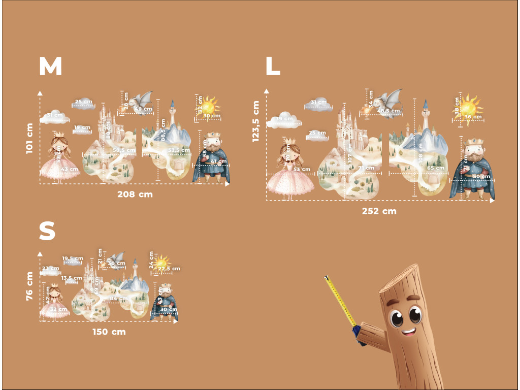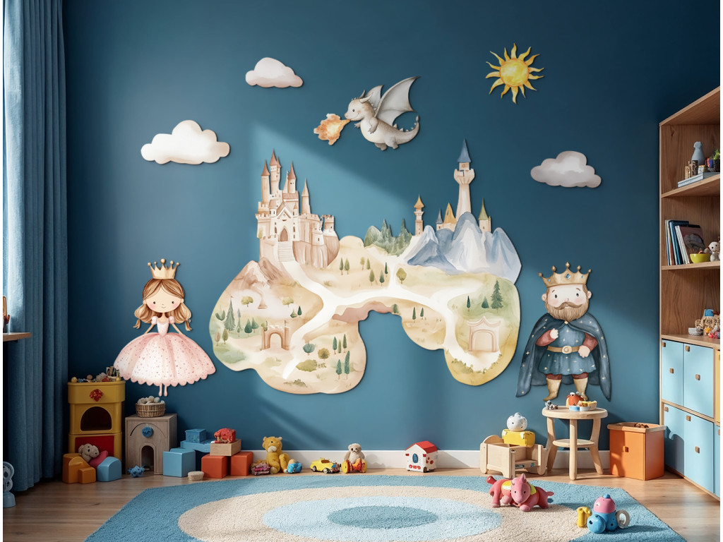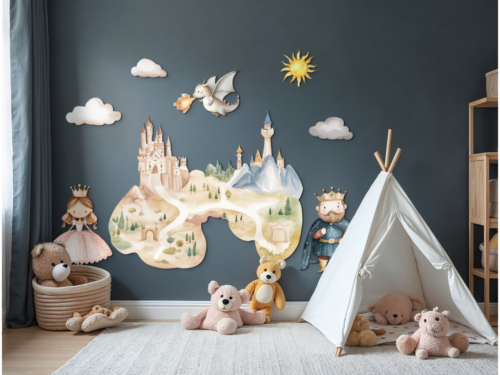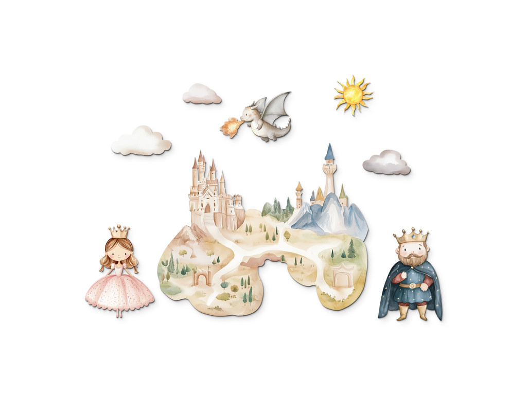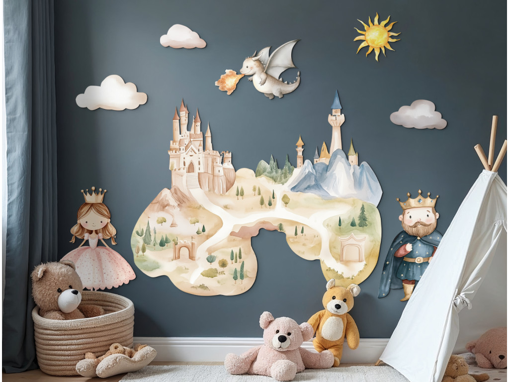 Märchenhafte Wanddekoration, die ein wunderschönes Schloss inmitten einer zauberhaften Landschaft zeigt, in der ein König, eine Prinzessin und ein freundlicher Drache leben. Zarte Farben und ein fröhlicher Zeichenstil schaffen eine magische Atmosphäre, die Kinder in eine Welt voller Fantasie und Abenteuer entführt. Eine tolle Ergänzung für jedes Kinderzimmer für alle kleinen Märchenliebhaber.