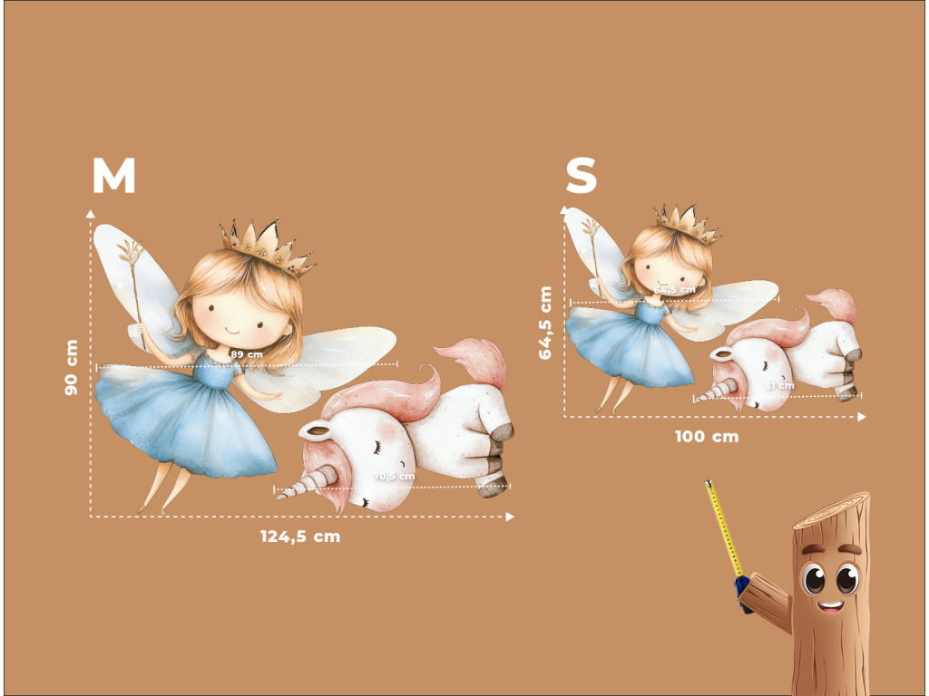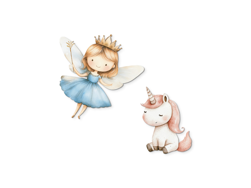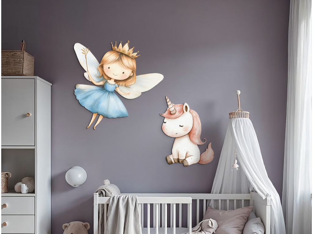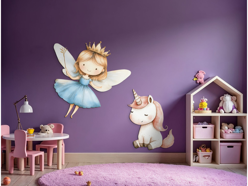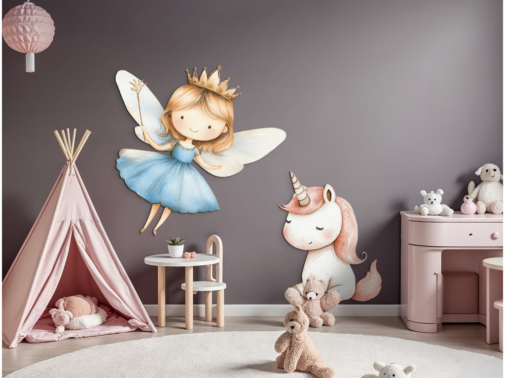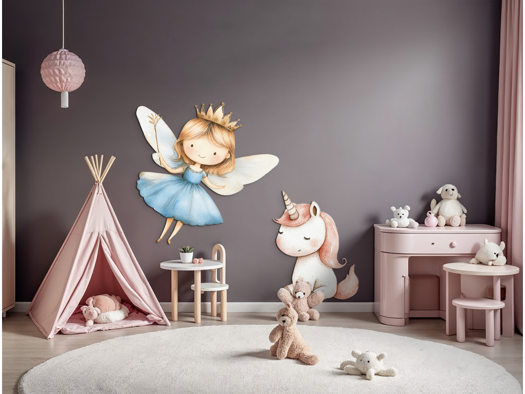 Die märchenhafte Szene mit einer fliegenden Fee in einem blauen Kleid und einem niedlichen Einhorn bringt eine zauberhafte Atmosphäre in das Zimmer. Die sanften Farben und der niedliche Zeichenstil regen die Fantasie der Kinder an und schaffen eine zauberhafte Ecke zum Spielen oder Träumen.