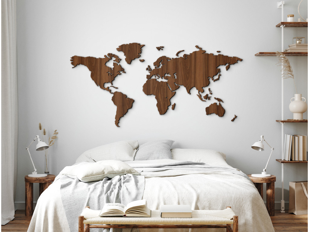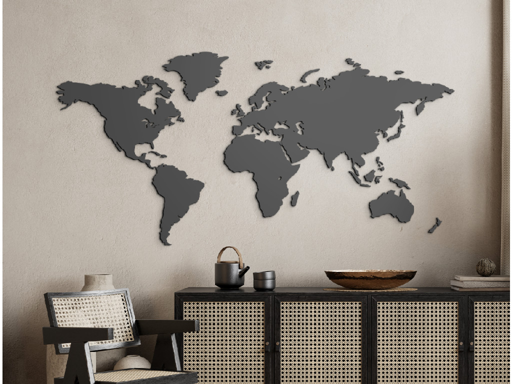 Eine moderne Weltkarte für die Wand für Reisebegeisterte und Fans des modernen Stils. Die Landkarte besteht aus mehreren Teilen, die Sie dank einer Schablone ganz einfach anbringen jönnen. Sie eignet sich für die häusliche Umgebung, aber auch für Firmenräume, wo sie einen eleganten Eindruck erwecken.